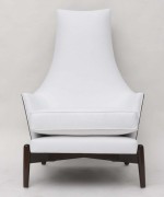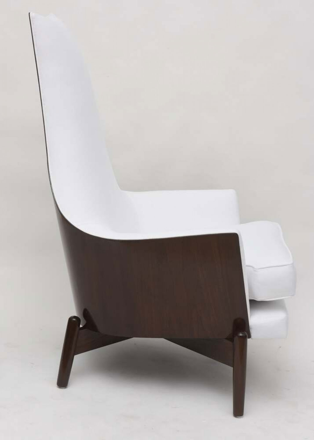 Danish Mid-Century Modern armchair with a high back that curves and incorporates into two square arms, the back, armrests, and seat upholstered in a white fabric upholstery, the backs, armrests and base in a dark finished walnut. (I.B. KOFOD LARSEN)