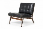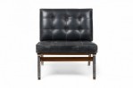 Mid-Century Italian (1950s) slipper chair with a silver metal frame anchored by horizontal wood stretchers and upholstered in button tufted black leather. (ICO PARISI)