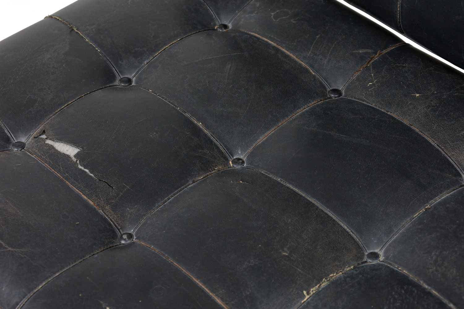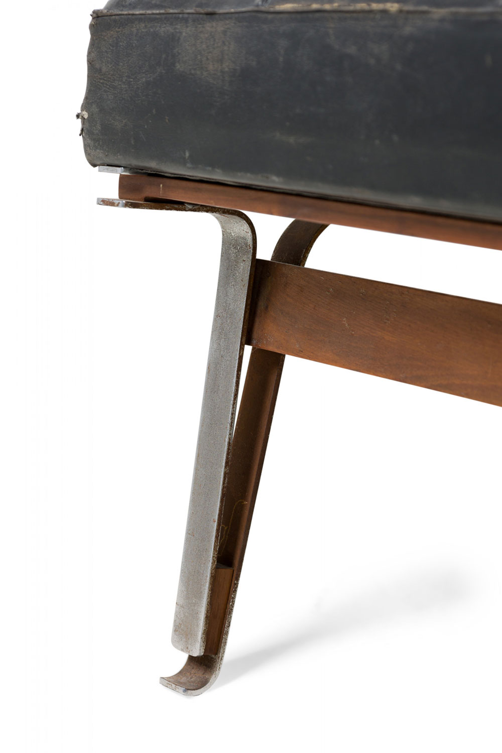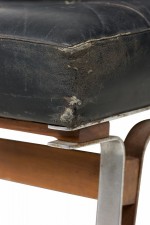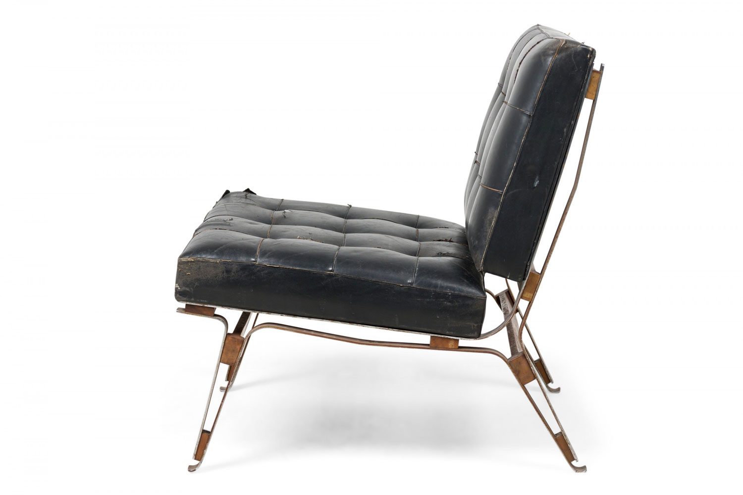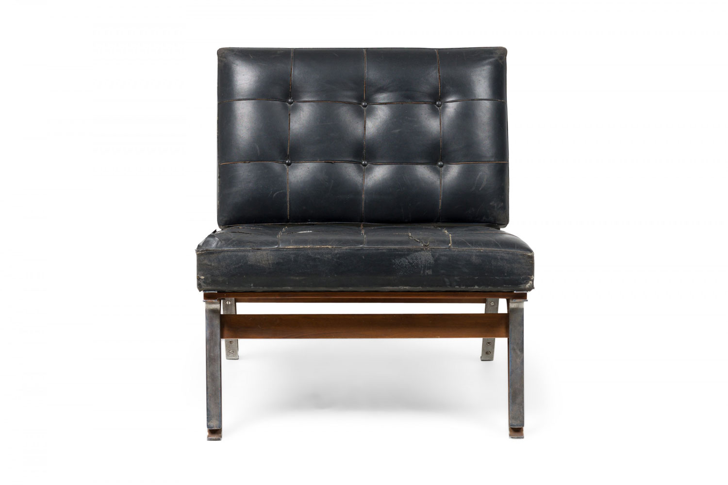 Style: Mid-Century Materials & Techniques: Leather, metal, tufted, upholstered Category: Seating Condition: Leather is cracking and torn in places along the seat. Corrosion to base consistent with age. Good; Minor losses
