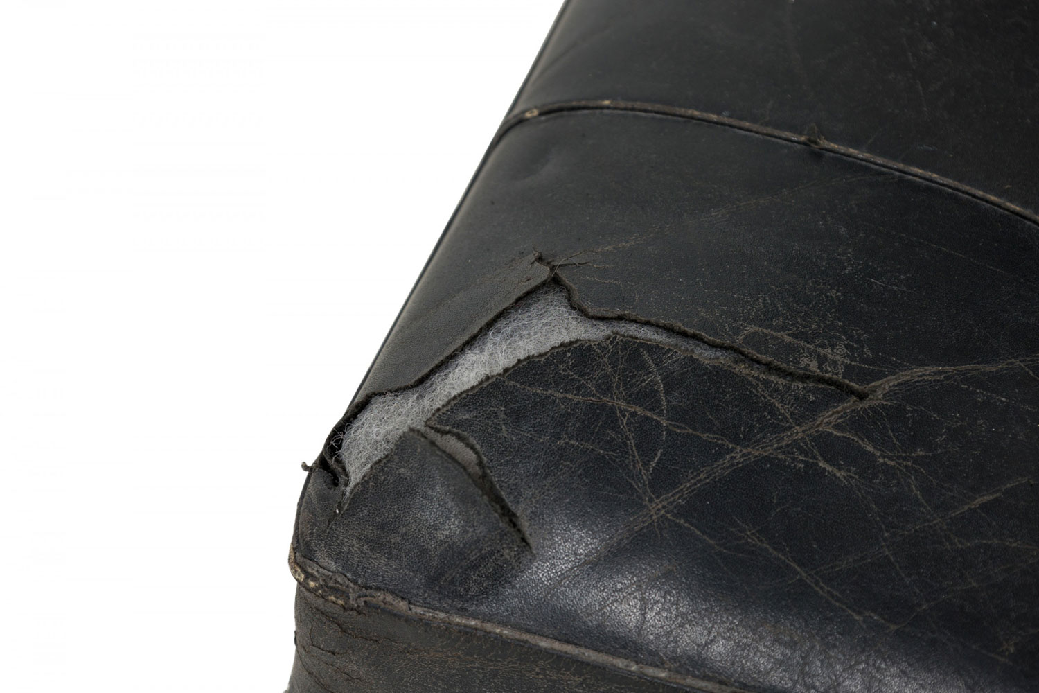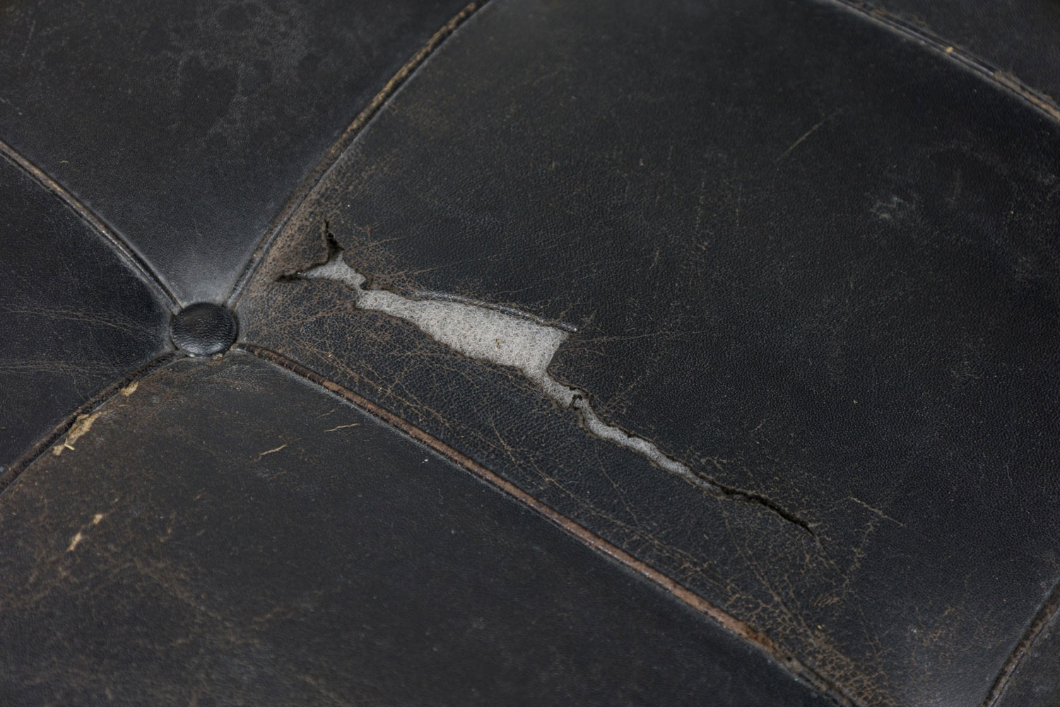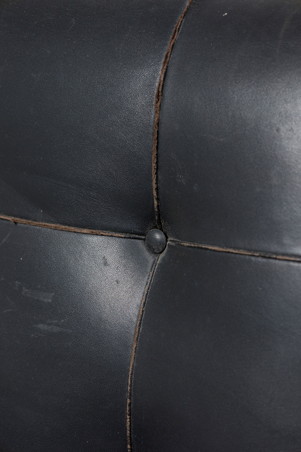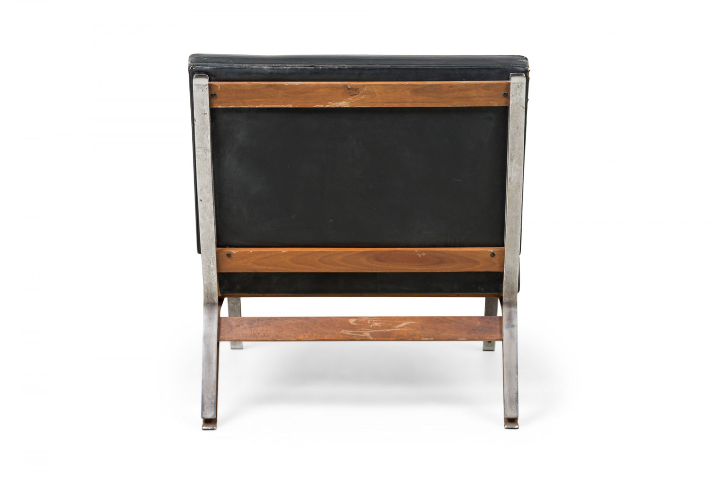 Style: Mid-Century Materials & Techniques: Leather, metal, tufted, upholstered Category: Seating Condition: Leather is cracking and torn in places along the seat. Corrosion to base consistent with age. Good; Minor losses