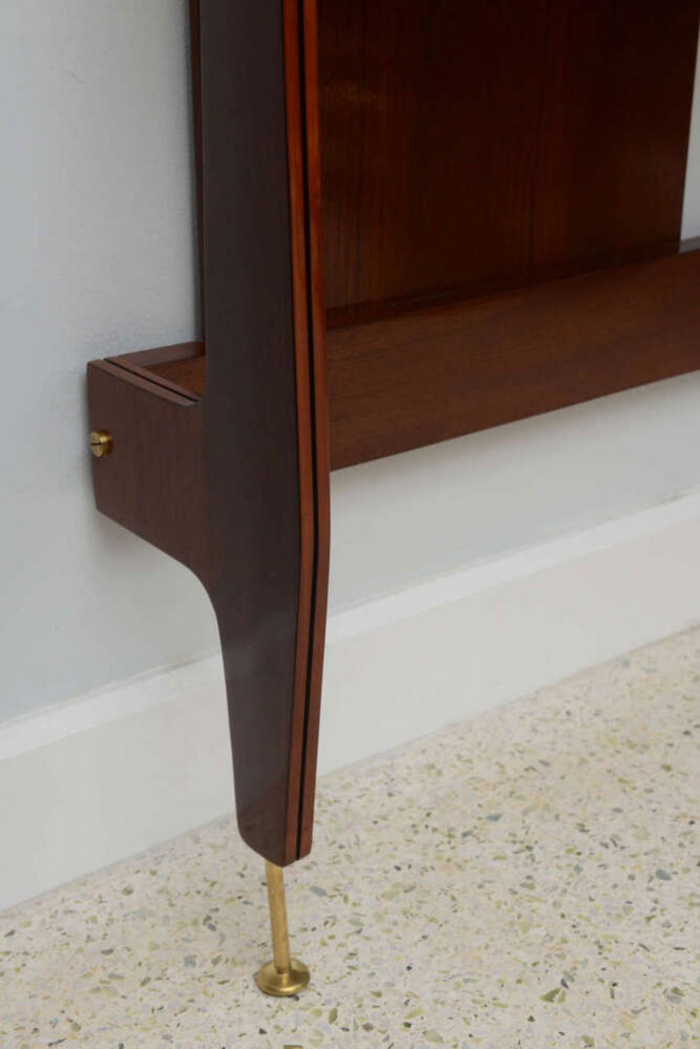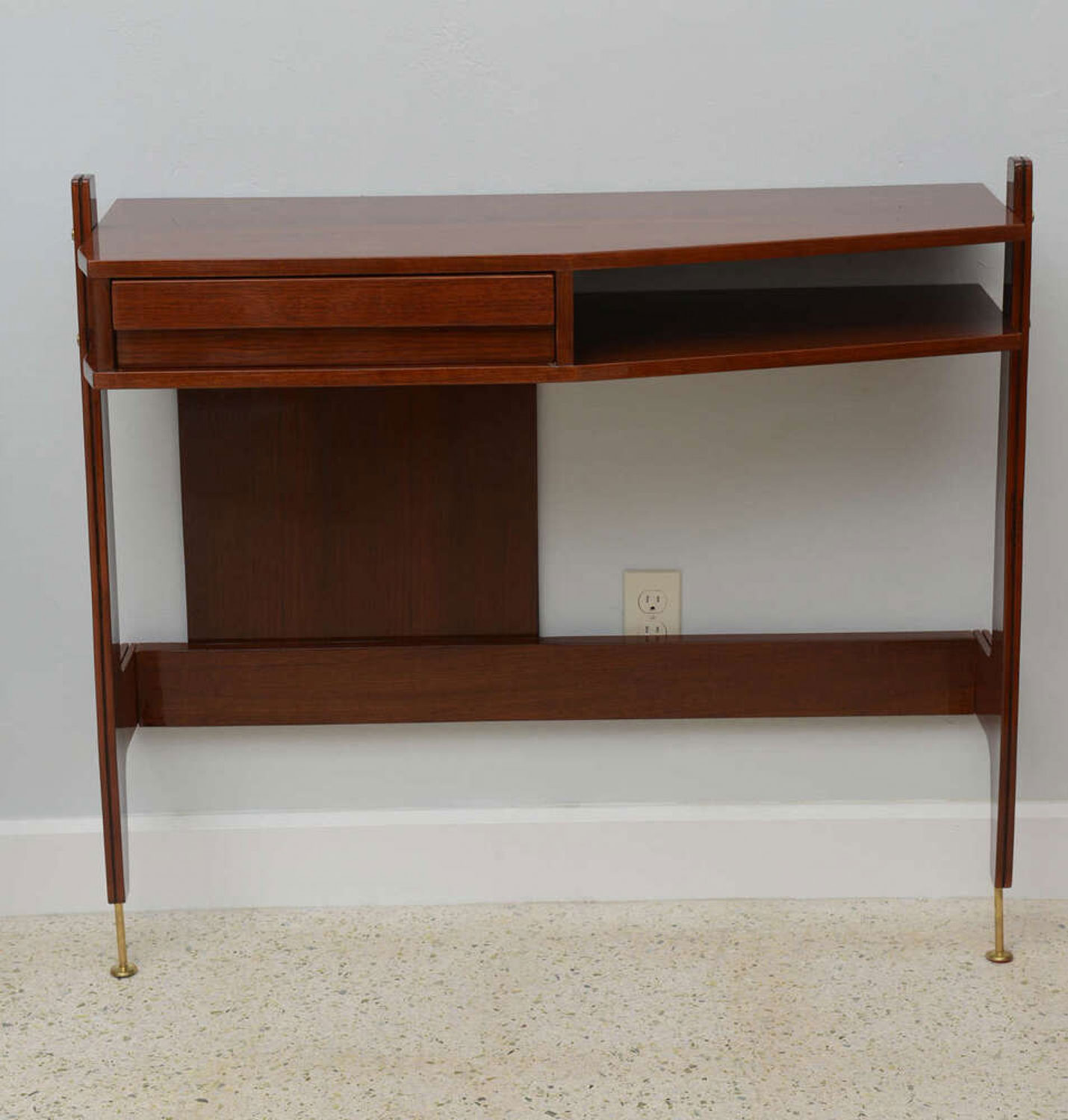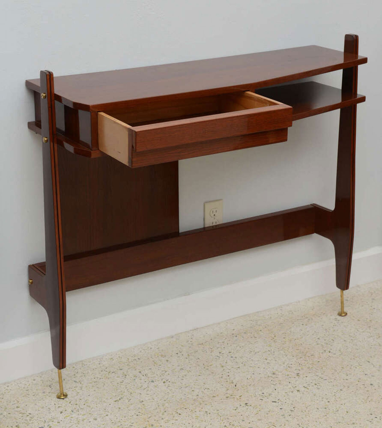 Italian Mid-Century Modern mahogany wall mounted console table having a shelf with 1 drawer and resting on 2 brass feet. (Attributed to ICO PARISI).