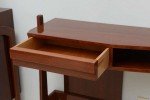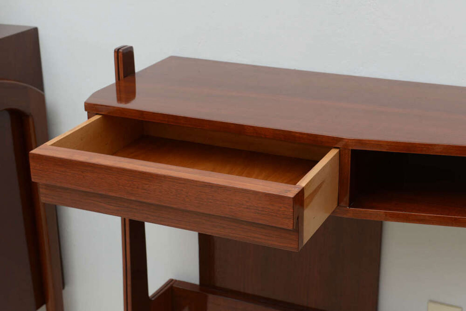 Italian Mid-Century Modern mahogany wall mounted console table having a shelf with 1 drawer and resting on 2 brass feet. (Attributed to ICO PARISI)