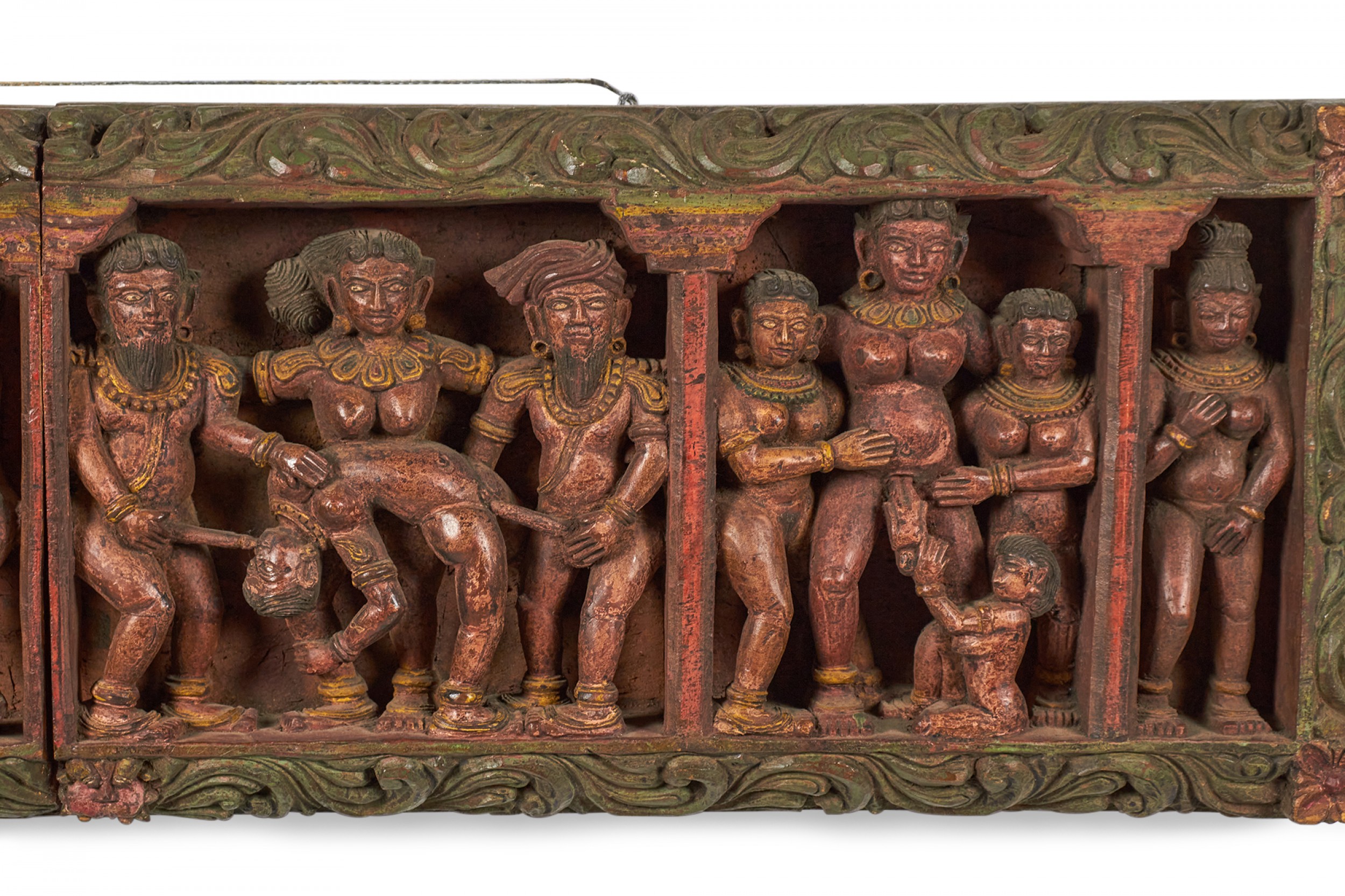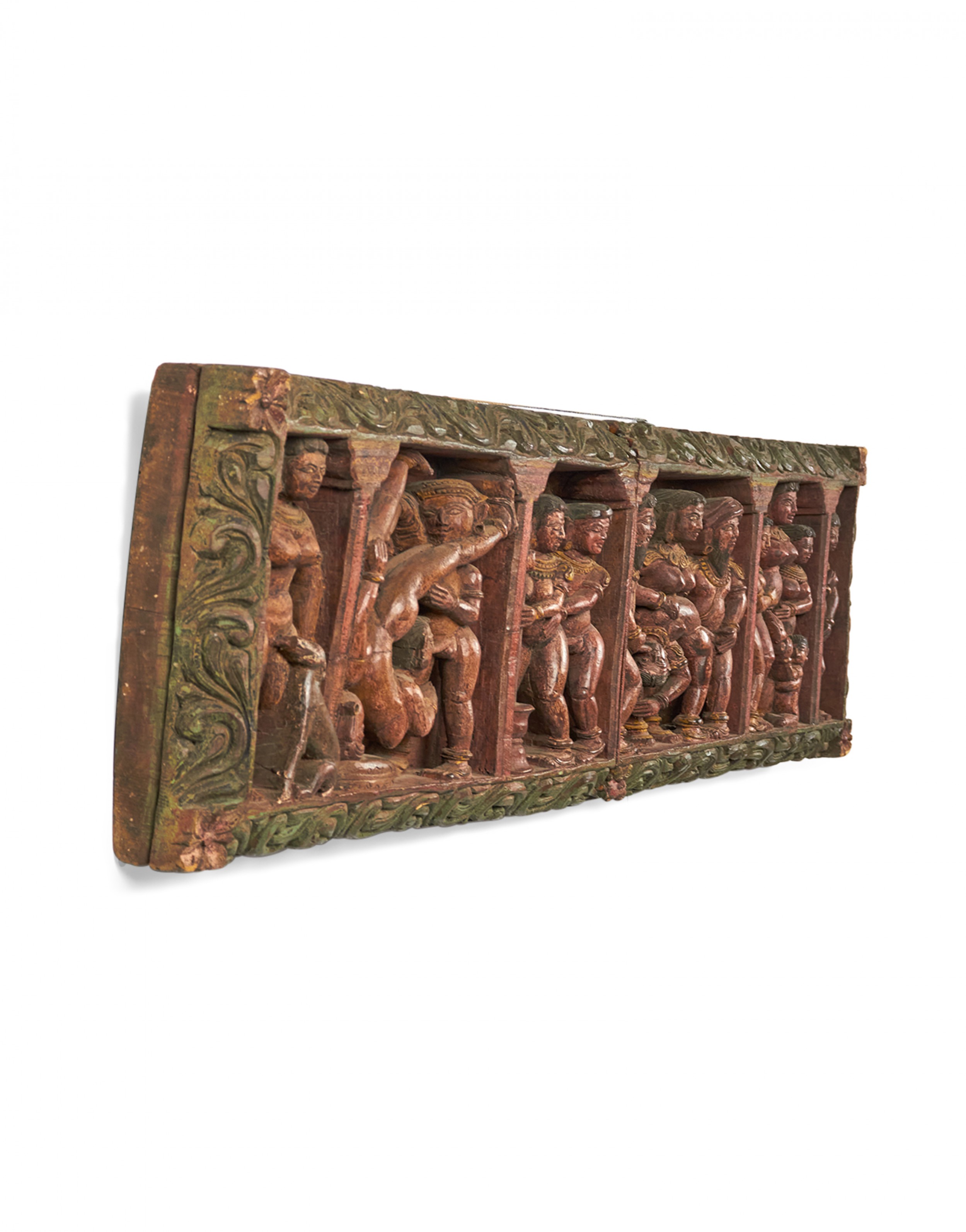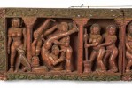 Asian Indian (19th Century) painted and carved horizontal wall plaque with 6 erotic scenes. From the Love Temple, Khajuraho, North India..