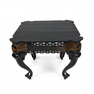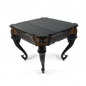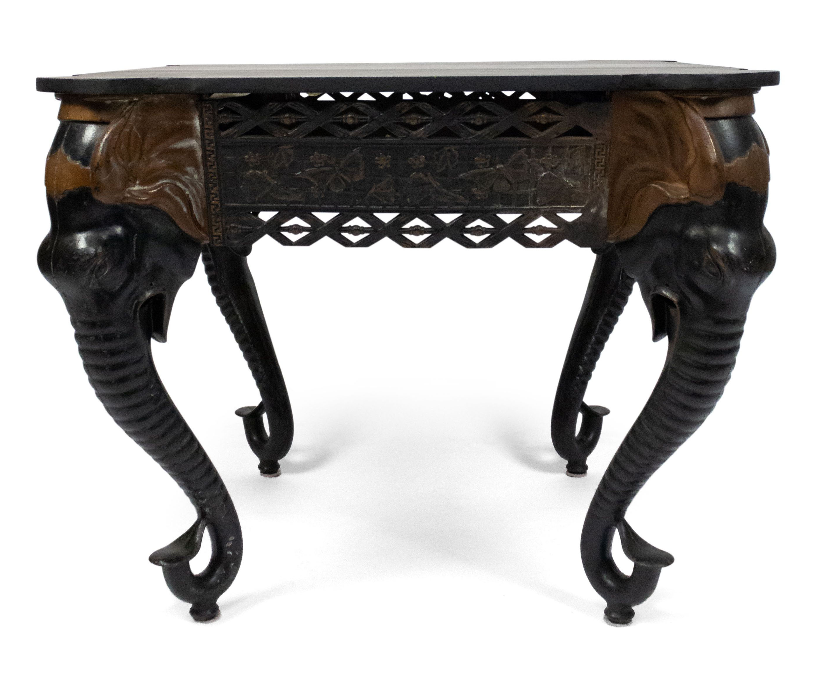 Asian Indian style (19th Century) square black and gold decorated iron center table with filigree apron of butterfly design on elephant head legs. With shaped and ebonized top.