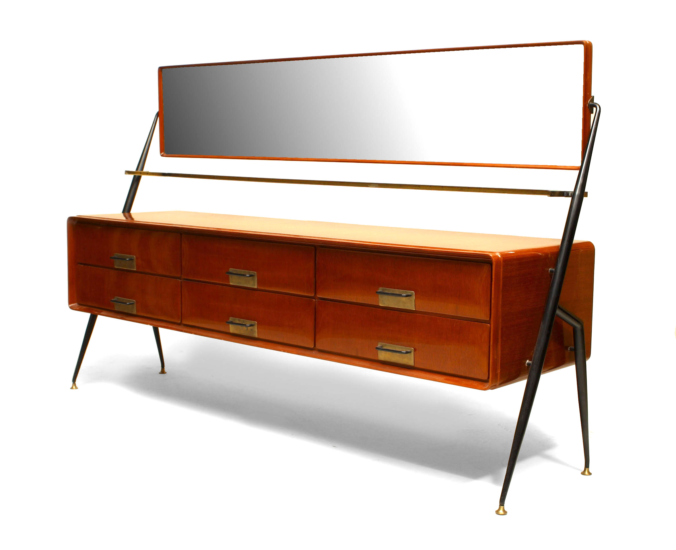 Italian 1960s mahogany chest with 6 drawers having a glass shelf under a swivel horizontal bevelled glass mirror supported by ebonized metal side supports (SILVIO CAVATORTA)