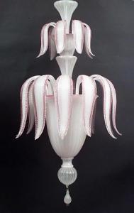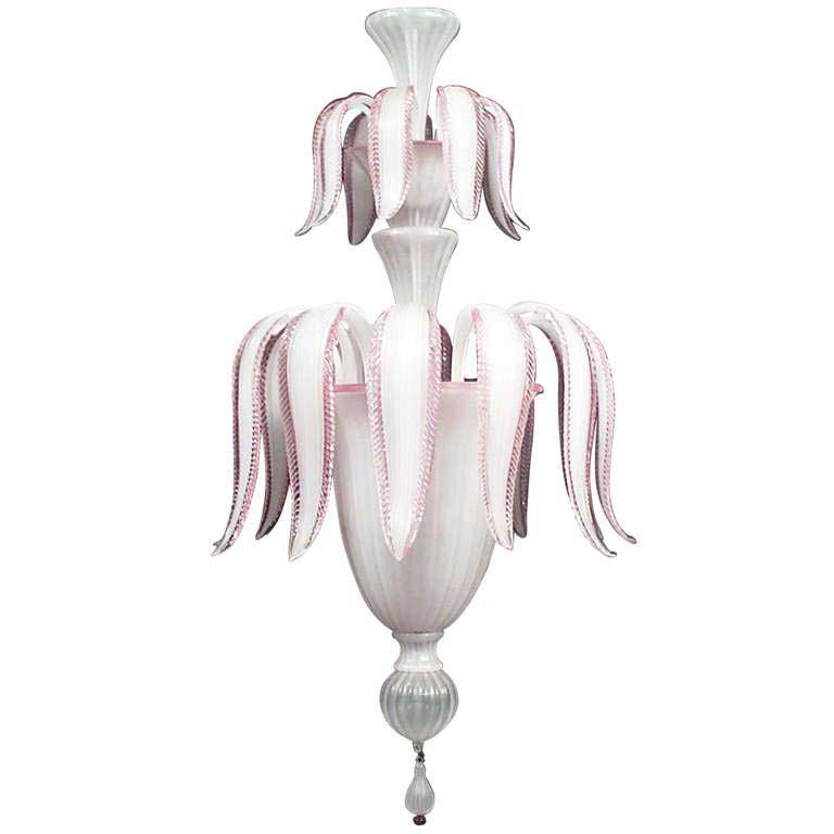 Italian Mid-Century Venetian (1940s) Murano white opaline glass chandelier with a 2 tier feather design and applied pink glass edge trim with finial a bottom..