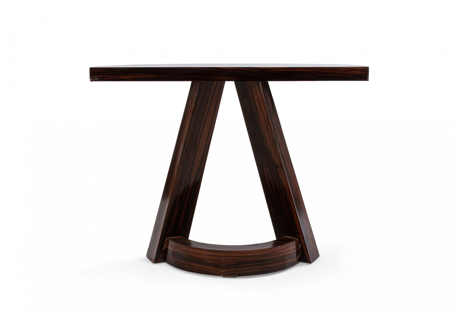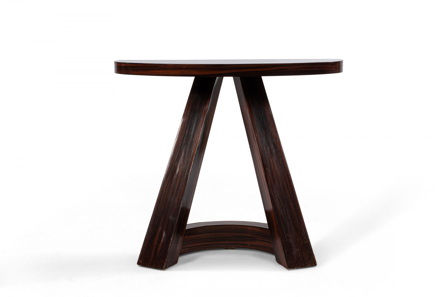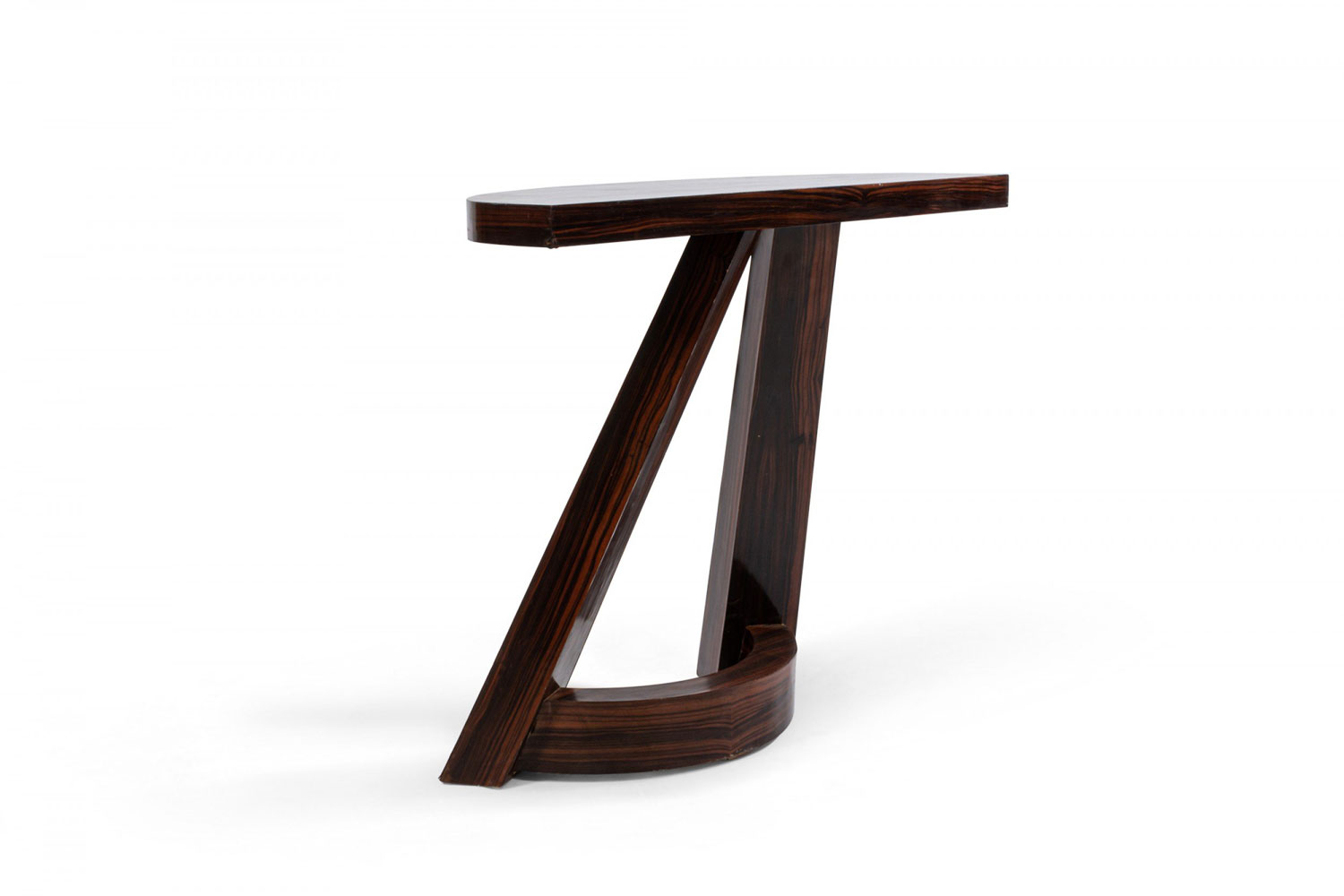 Italian Mid-Century (1940s) rosewood console table with a demilune top above 2 extended front legs with a curved stretcher