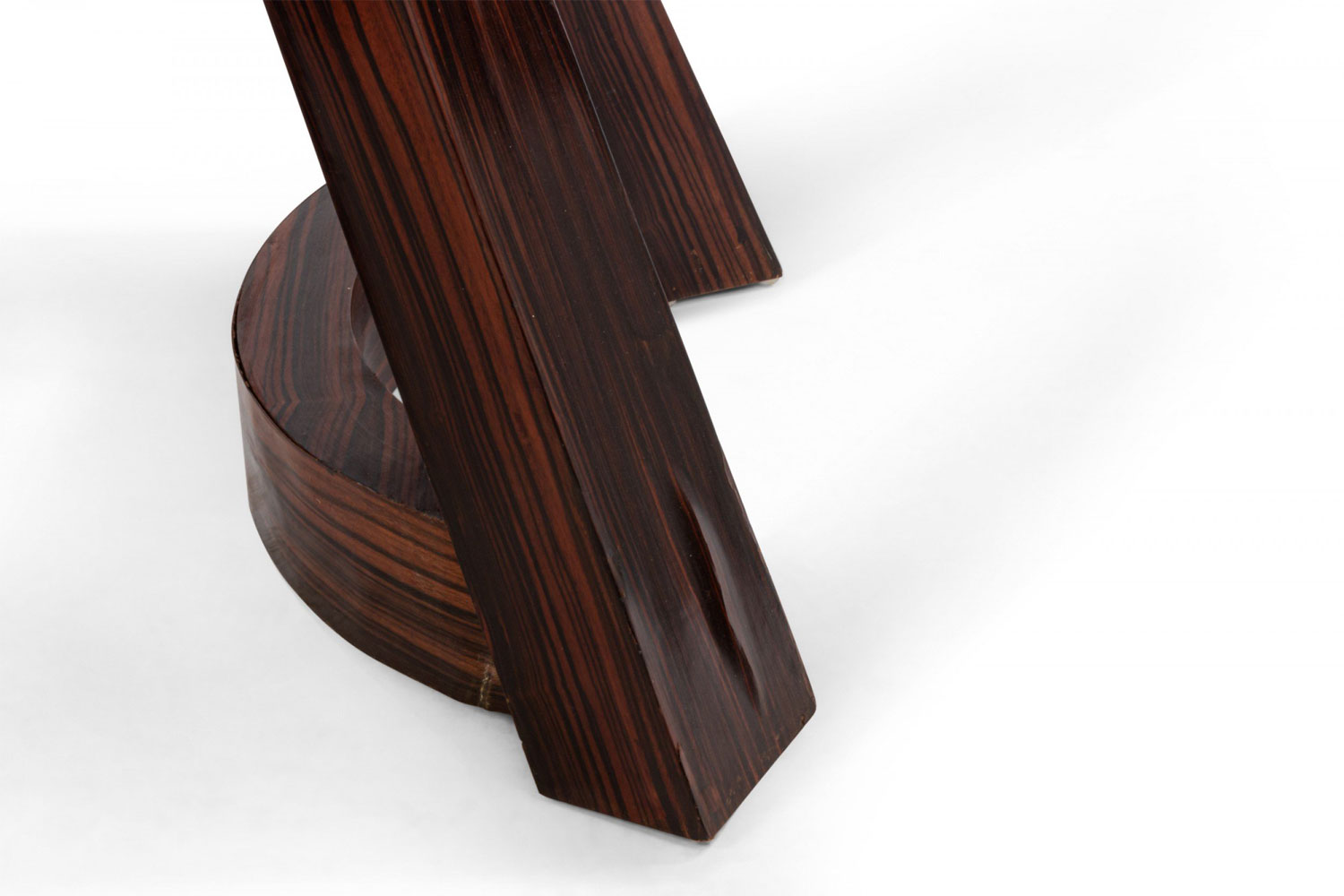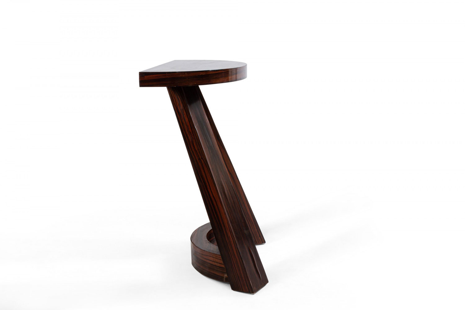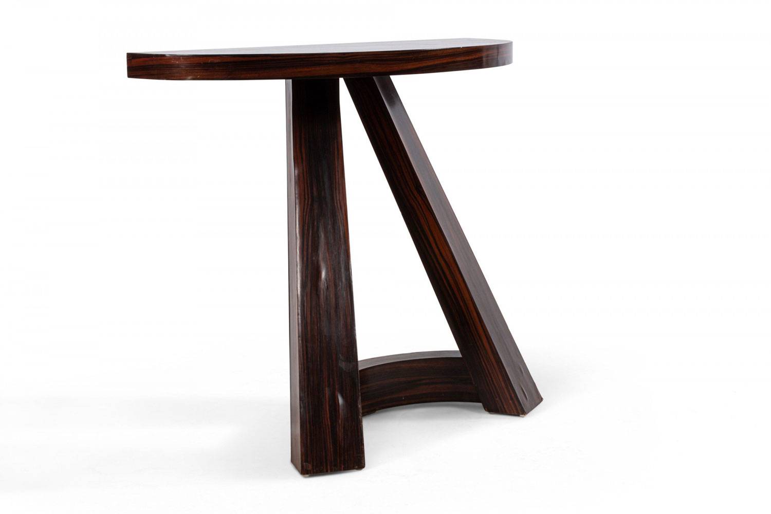 Italian Mid-Century (1940s) rosewood console table with a demilune top above 2 extended front legs with a curved stretcher
