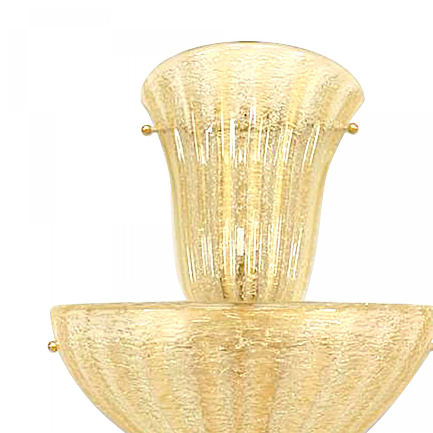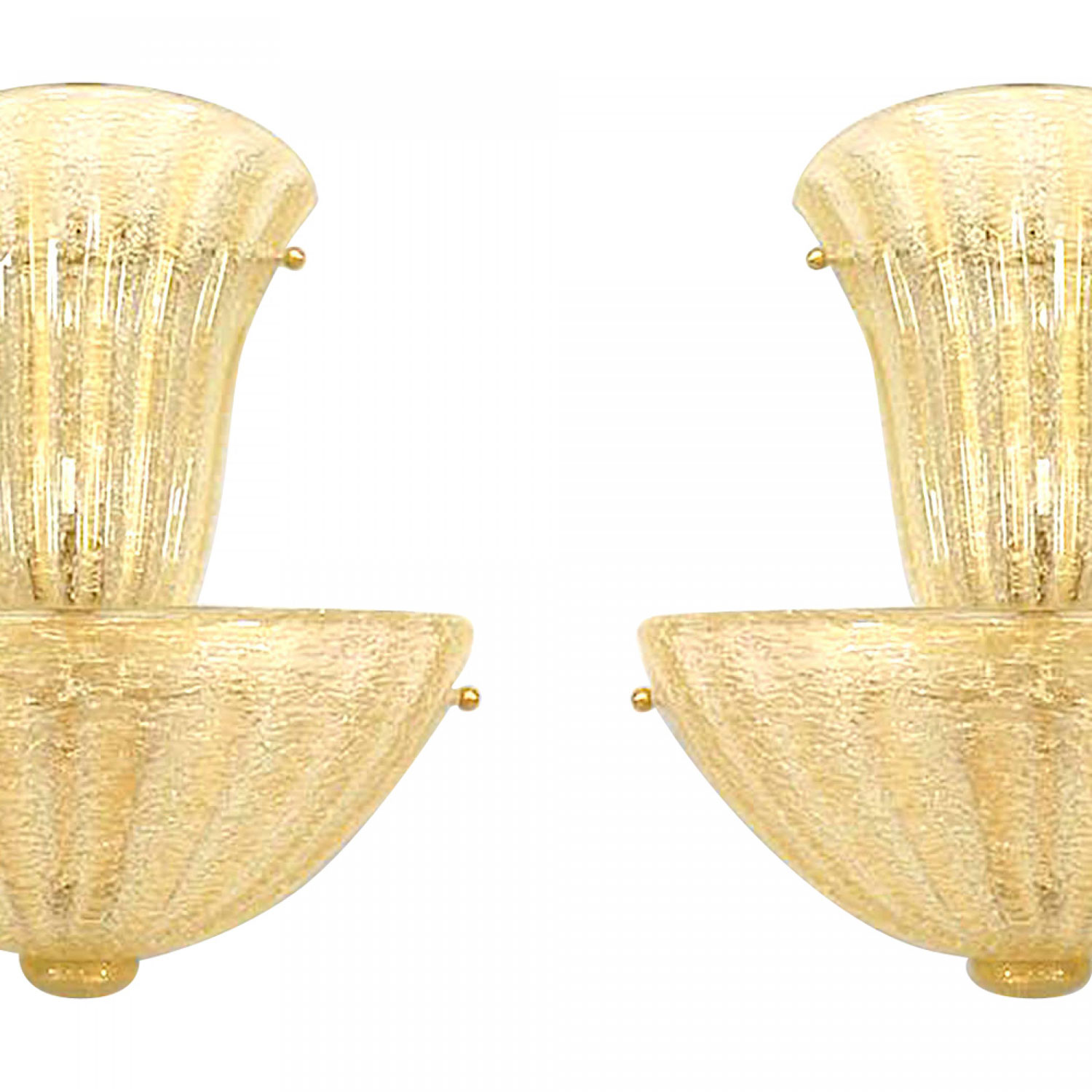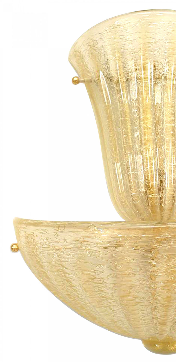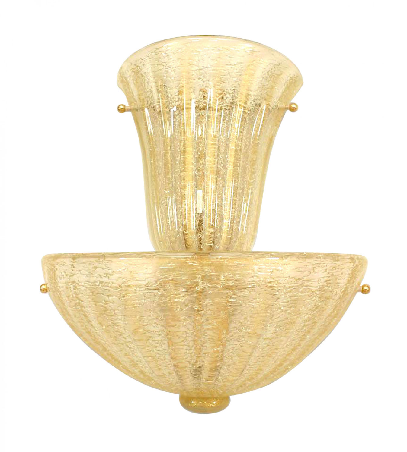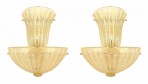 PAIR of Italian Venetian Murano 1940s-Style "RUGIADA" 2 section wall sconces with fluted design clear gold and textured glass with bowl shaped base (PRICED AS PAIR) (Identical pair: NWL6128).