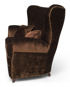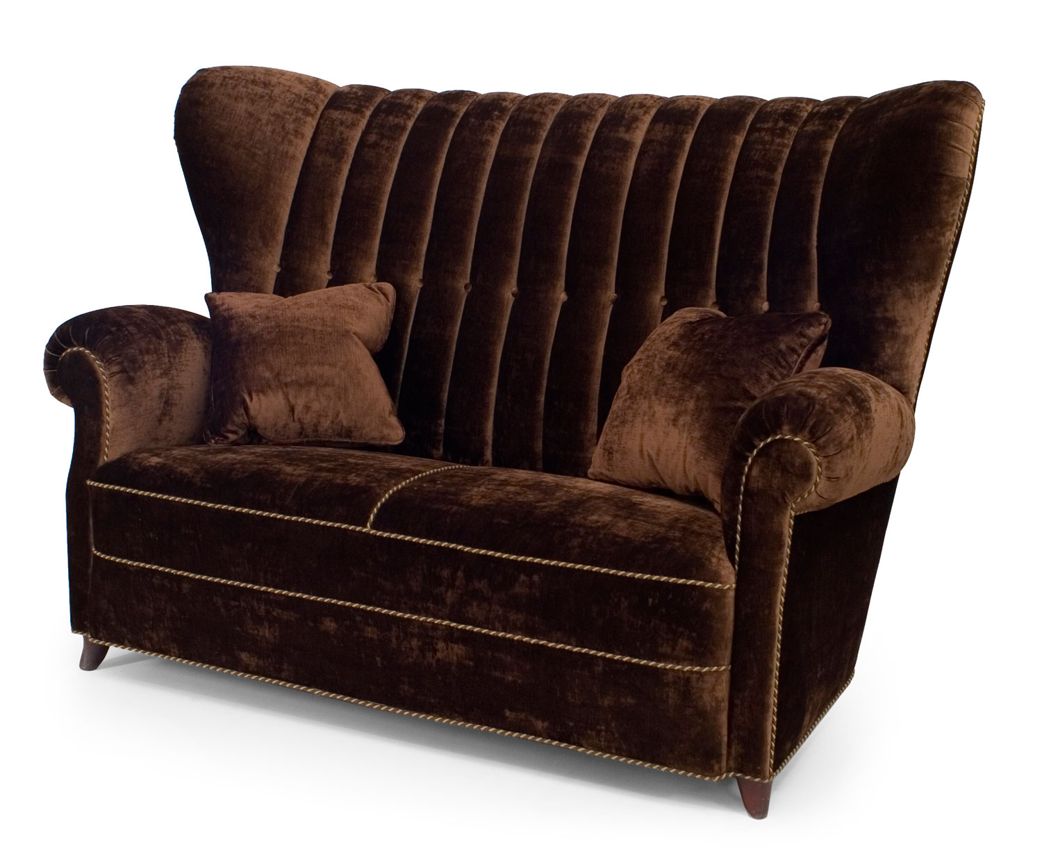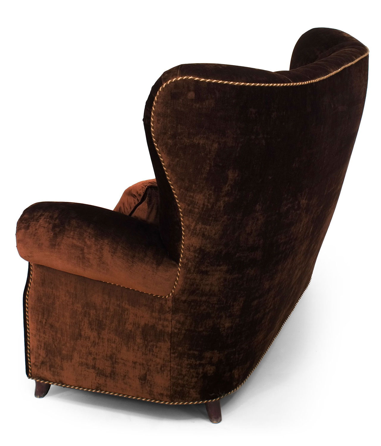 Italian 1940s wing back loveseat with brown velvet upholstery and ribbon twist cord resting on short beechwood legs (style of GIORGIO RAMPONI) (ref: fig. 72, Roberto Aloi "ESEMPI Arredamento Moderno di tutto il mondo"
