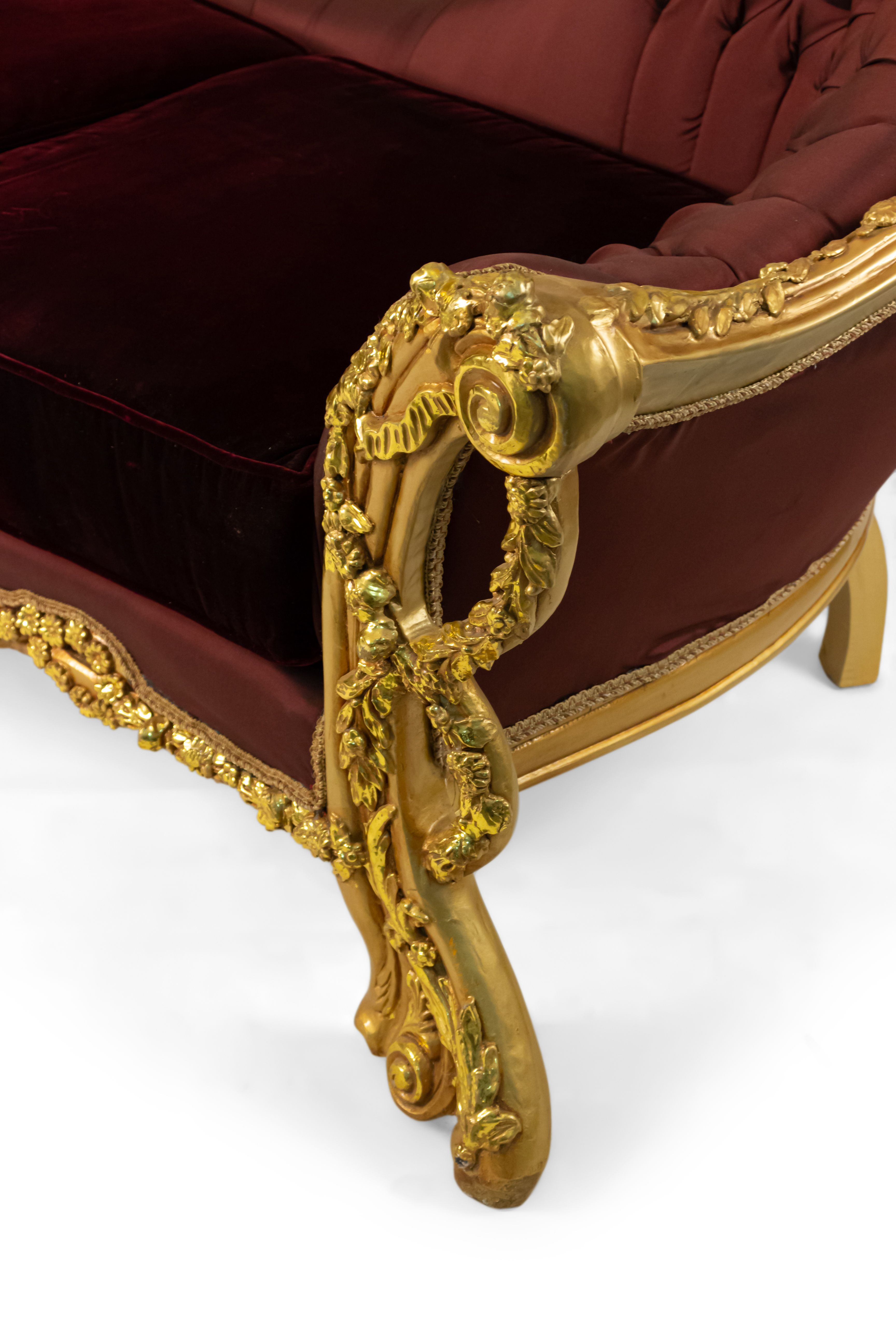 Italian Baroque style 20th c. large settee with gilt wood filigree frame & button-tufted burgundy & cream upholstery with embroidered flowers (Matching settee: AGO056, chairs: AGO053, AGO057, Set: AGO053A)