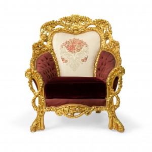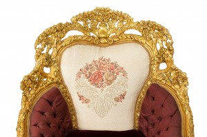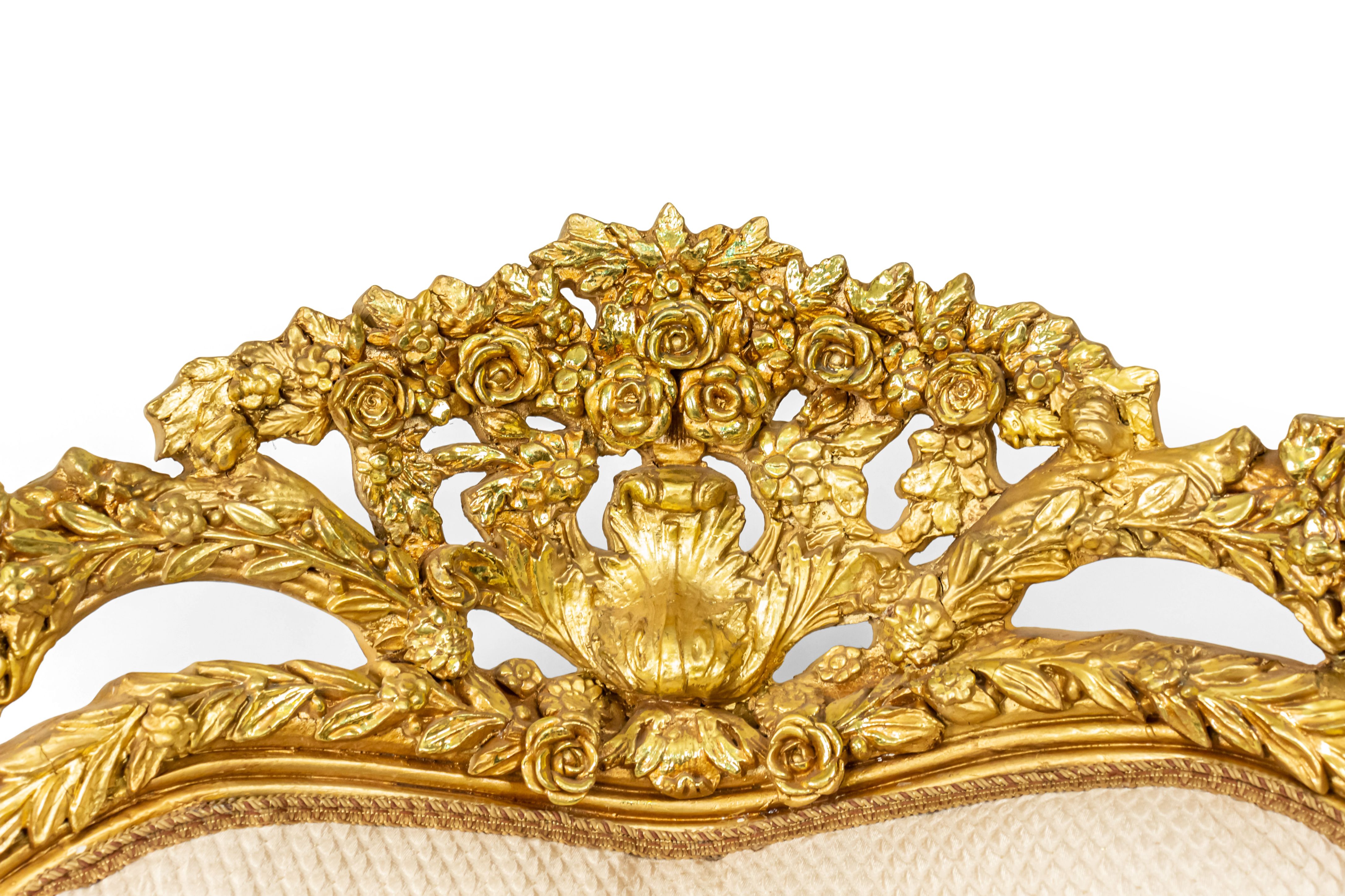 Style: Italian Materials & Techniques: Button, embroidered, gilt / giltwood, tufted, wood Category: Seating Condition: Minimal cracking on giltwood; front and top of chair back. Good; Wear consistent with age and use