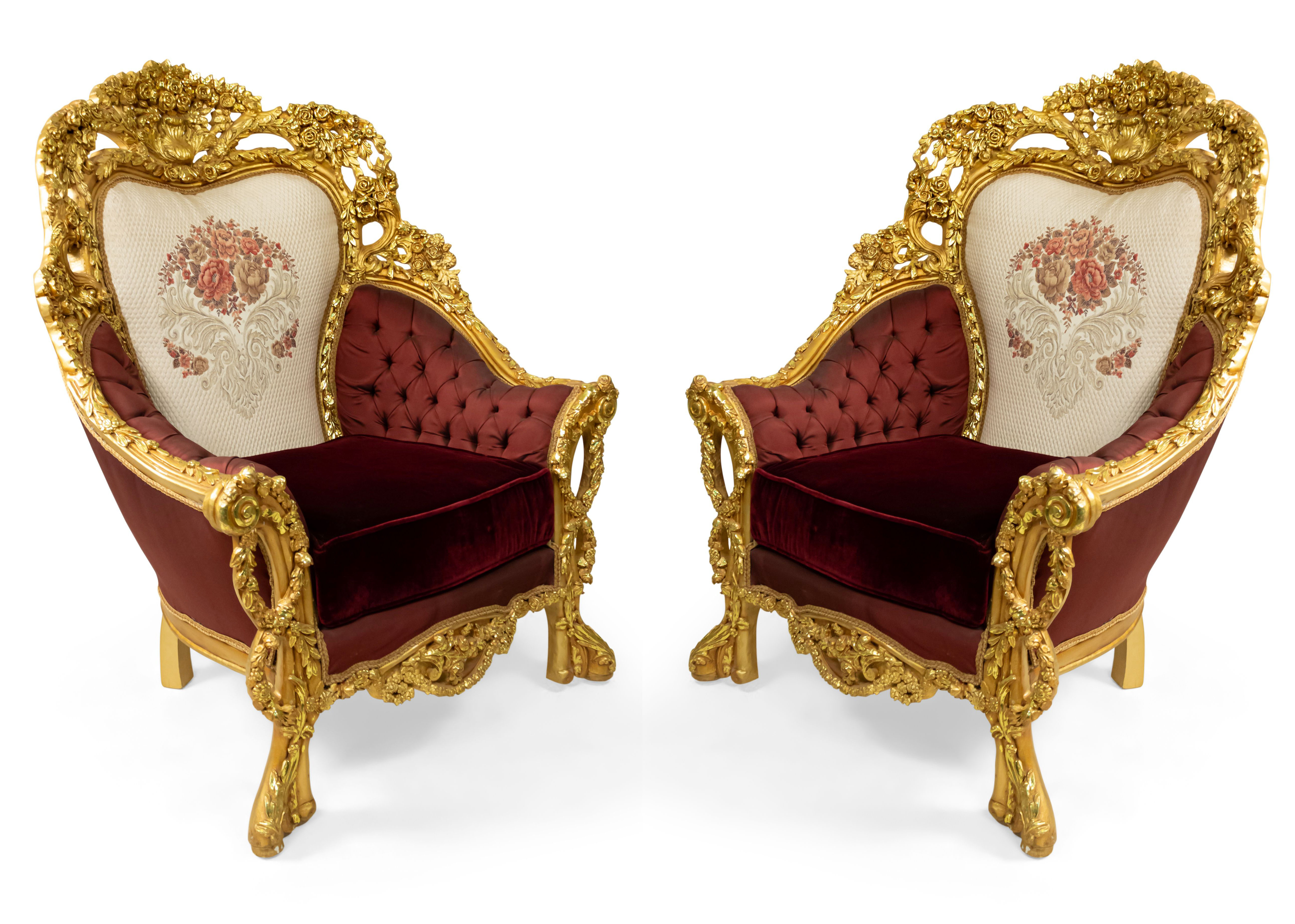 PAIR of Italian Baroque-style (20th Century) Armchairs with gilt wood filigree frames, button-tufted burgundy and cream upholstery with embroidered flowers. (PRICED AS PAIR) (Related items: AGO054, AGO056, AGO057).