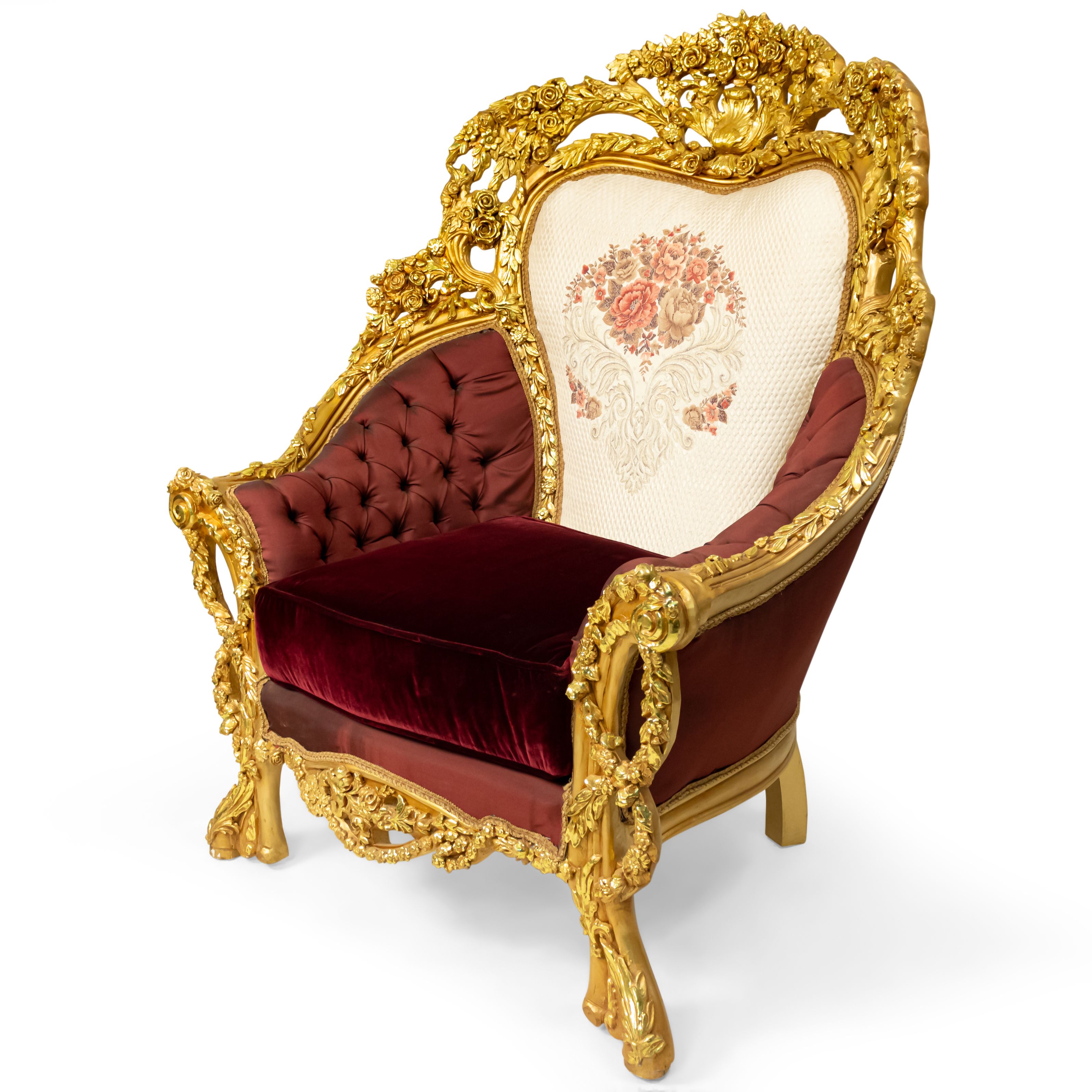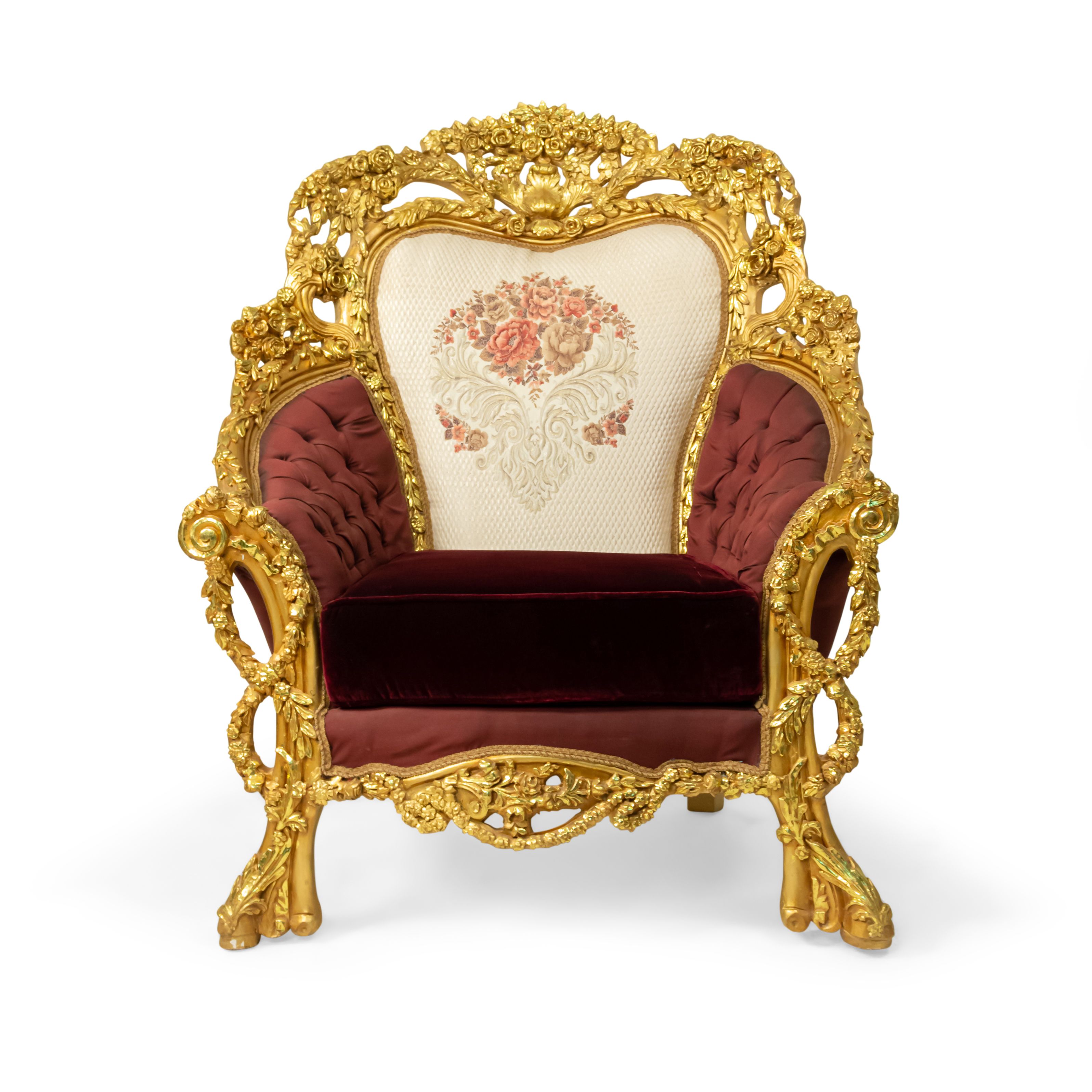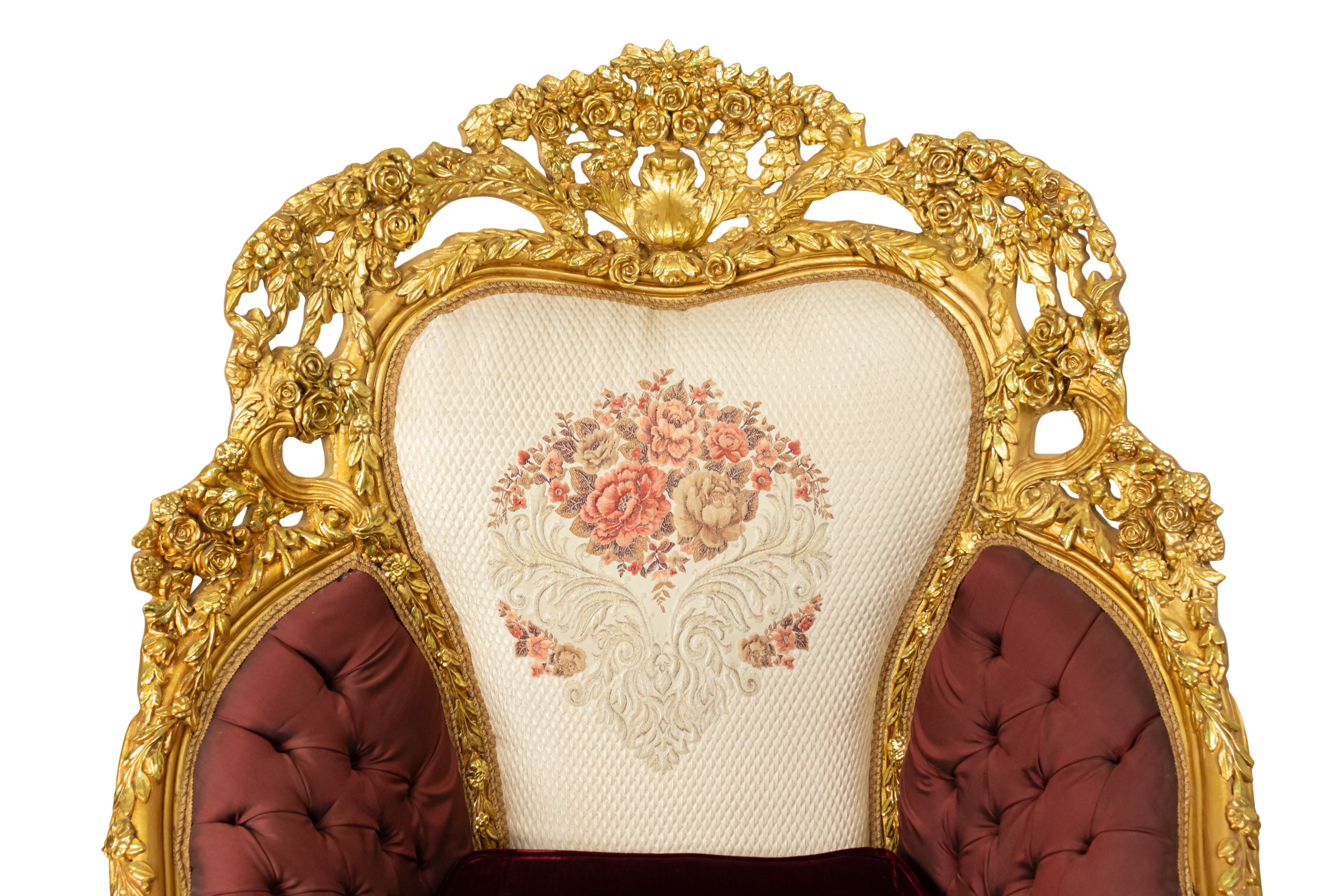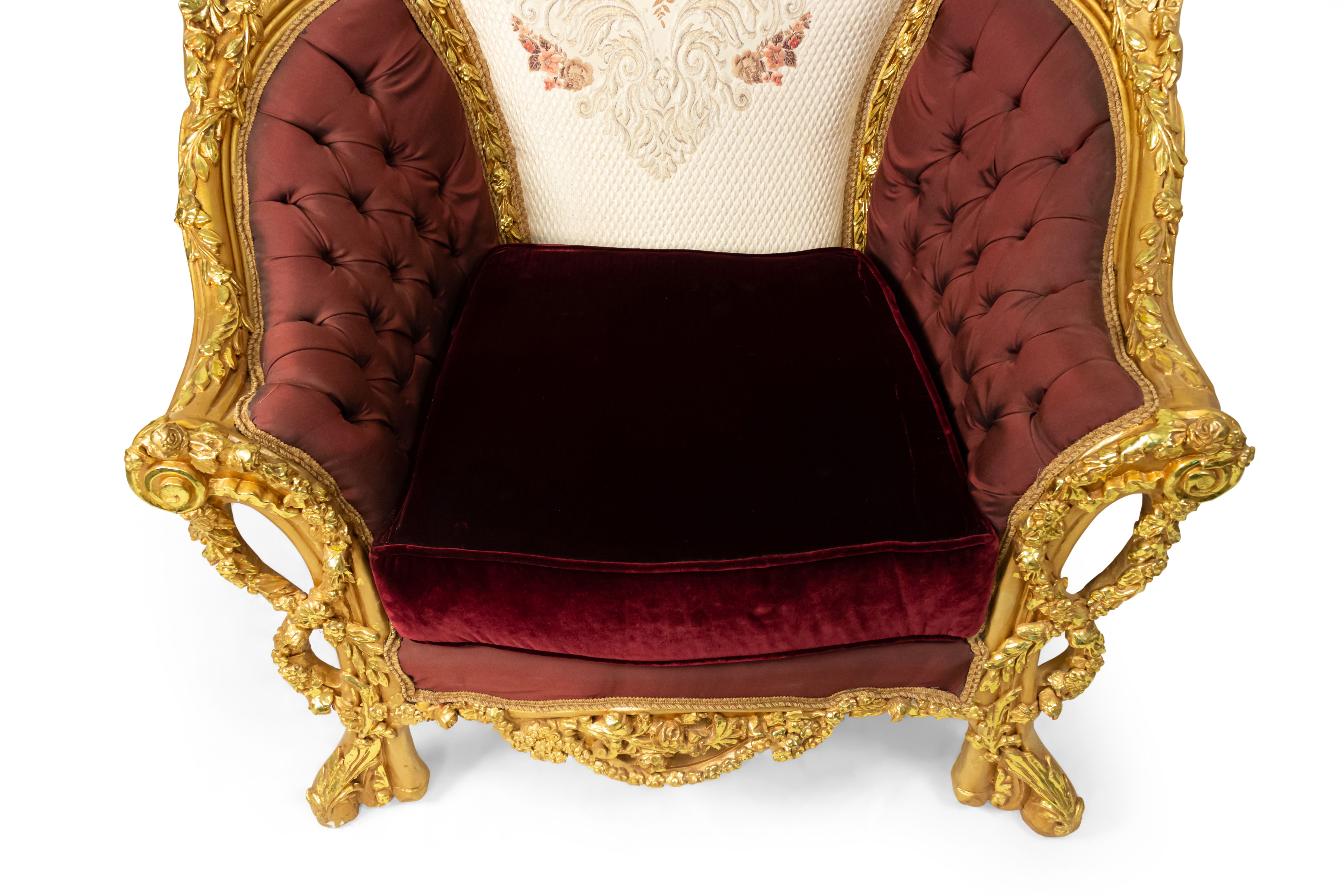 PAIR of Italian Baroque-style (20th Century) Armchairs with gilt wood filigree frames, button-tufted burgundy and cream upholstery with embroidered flowers. (PRICED AS PAIR) (Related items: AGO054, AGO056, AGO057)