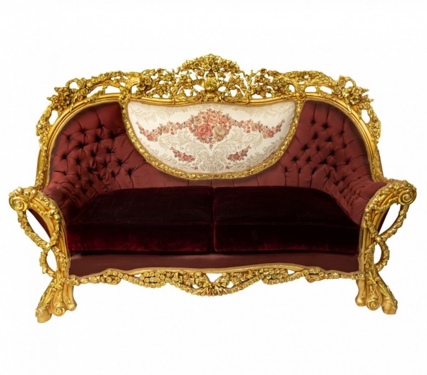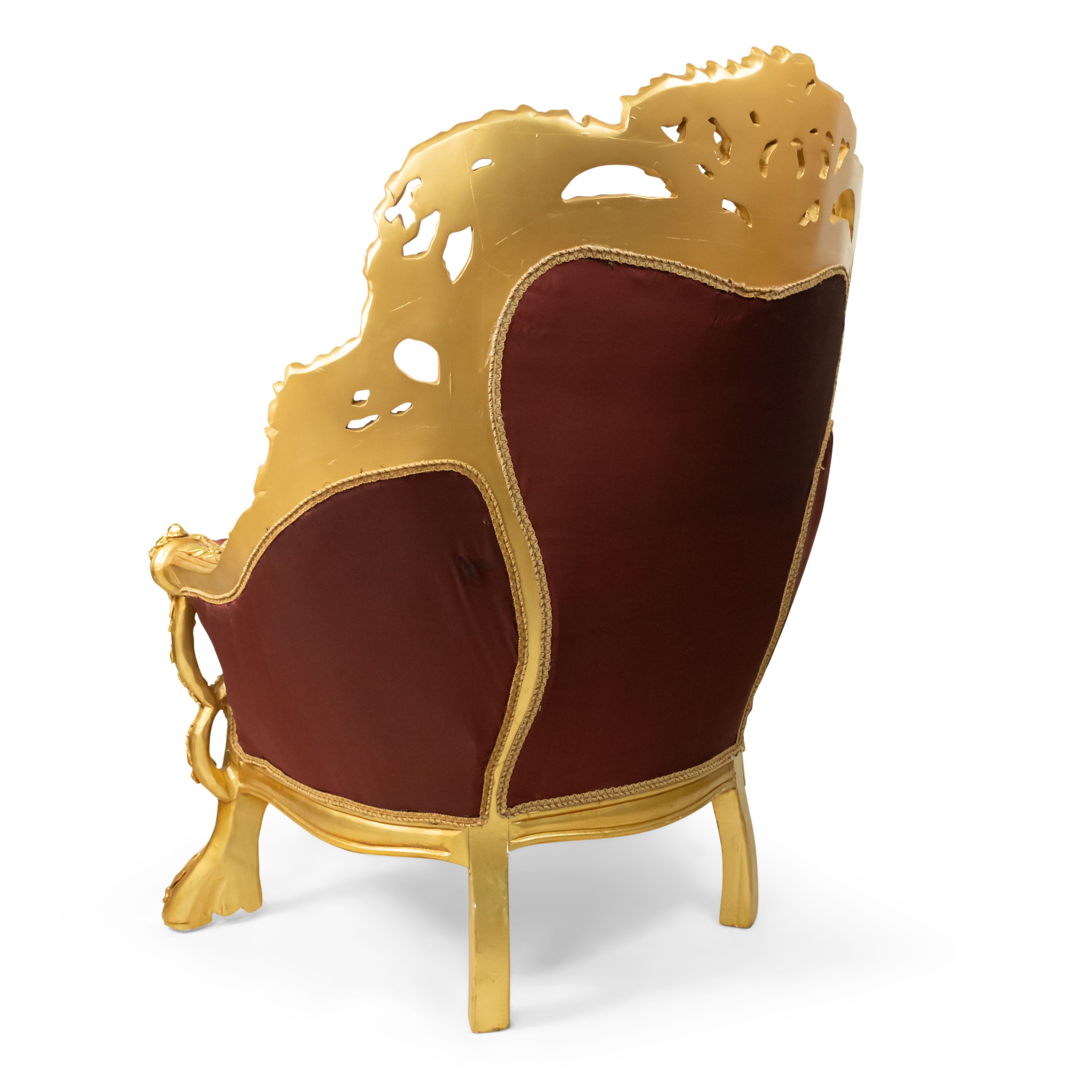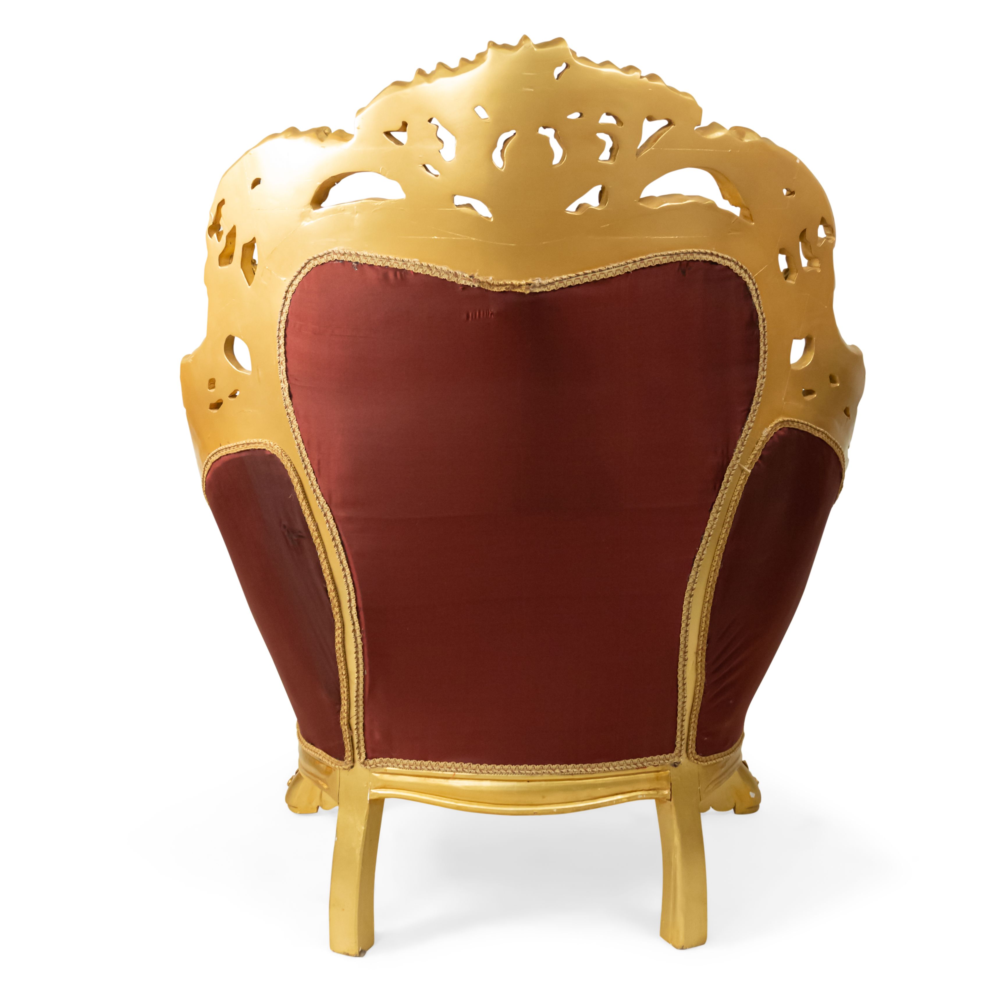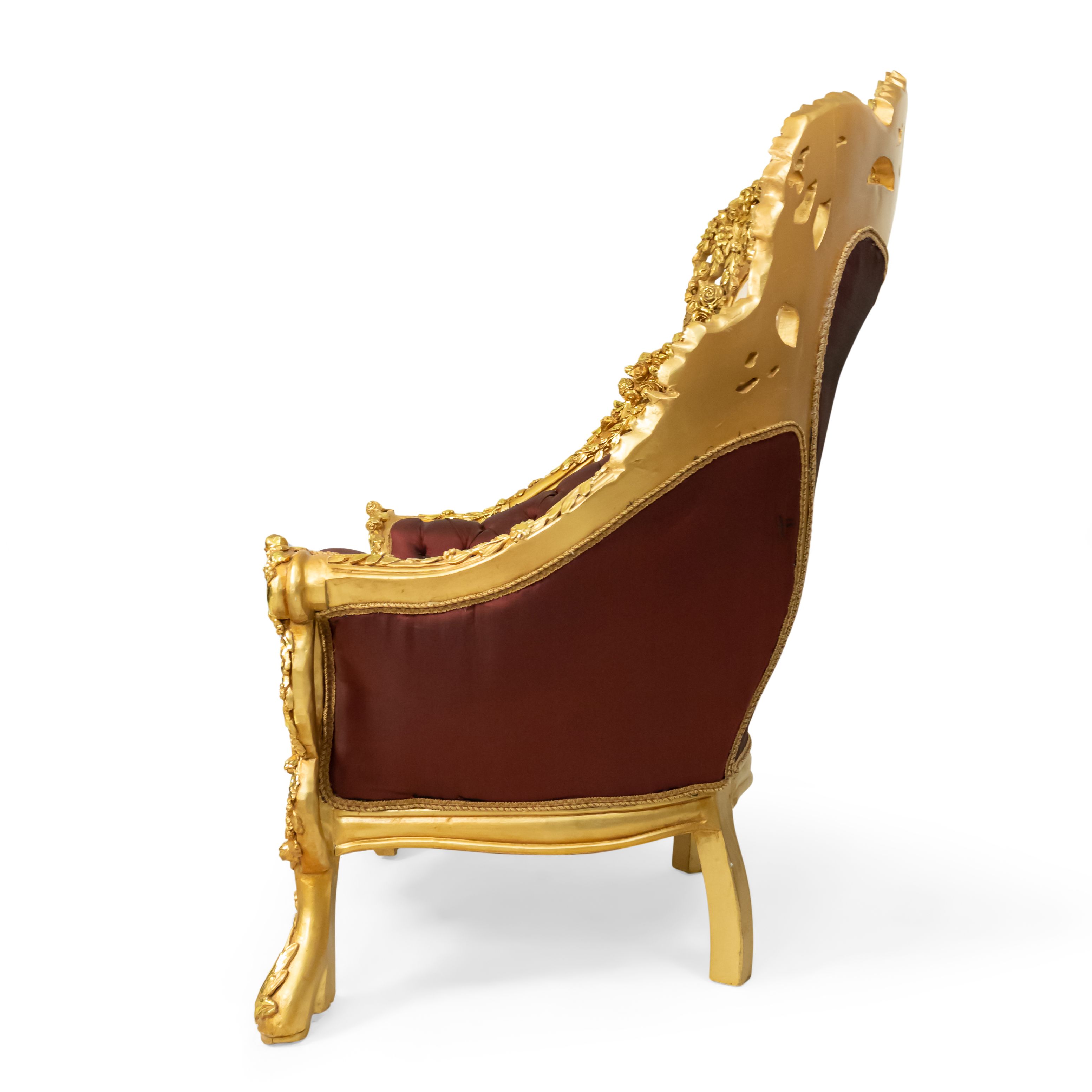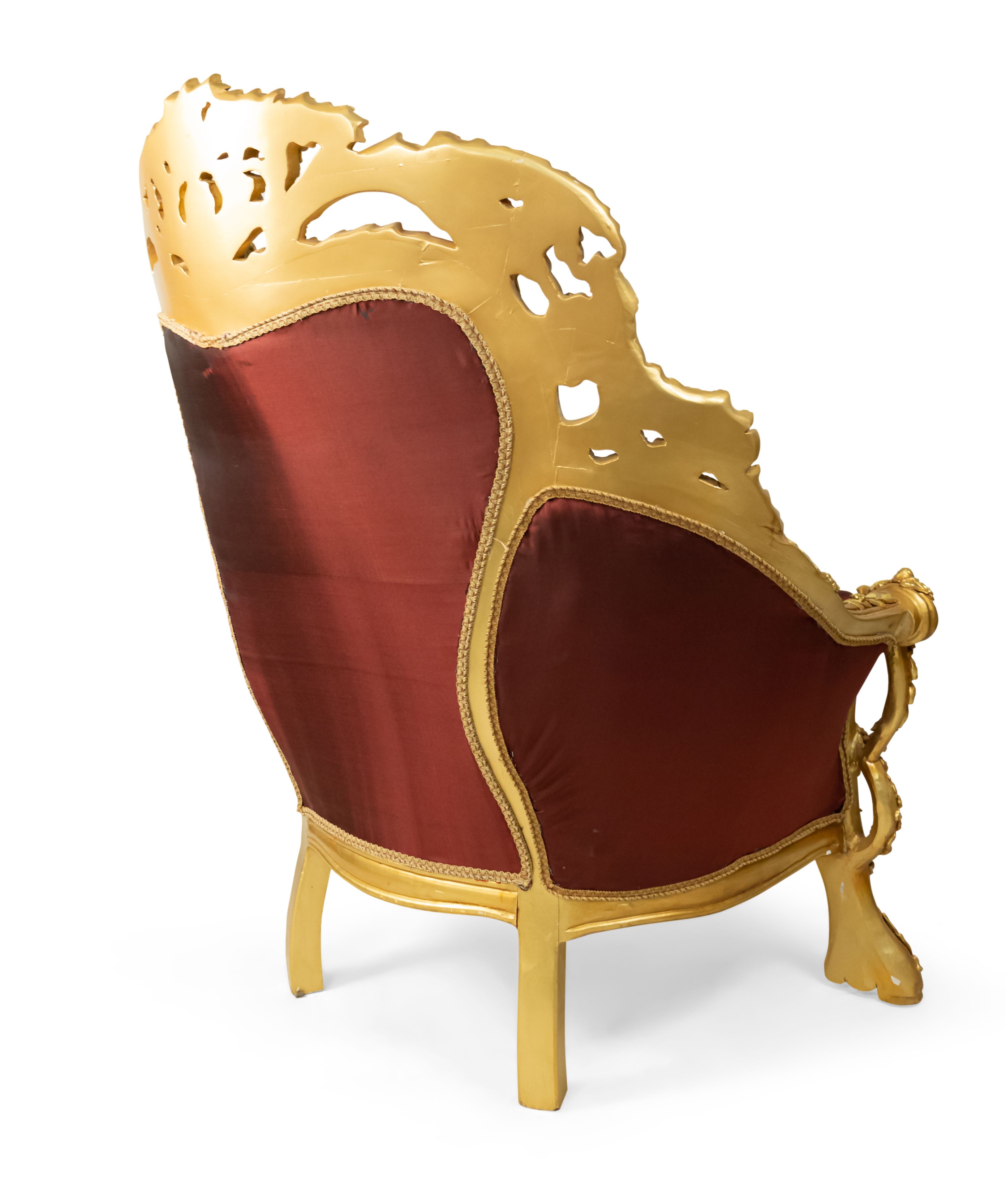 PAIR of Italian Baroque-style (20th Century) Armchairs with gilt wood filigree frames, button-tufted burgundy and cream upholstery with embroidered flowers. (PRICED AS PAIR) (Related items: AGO054, AGO056, AGO057)