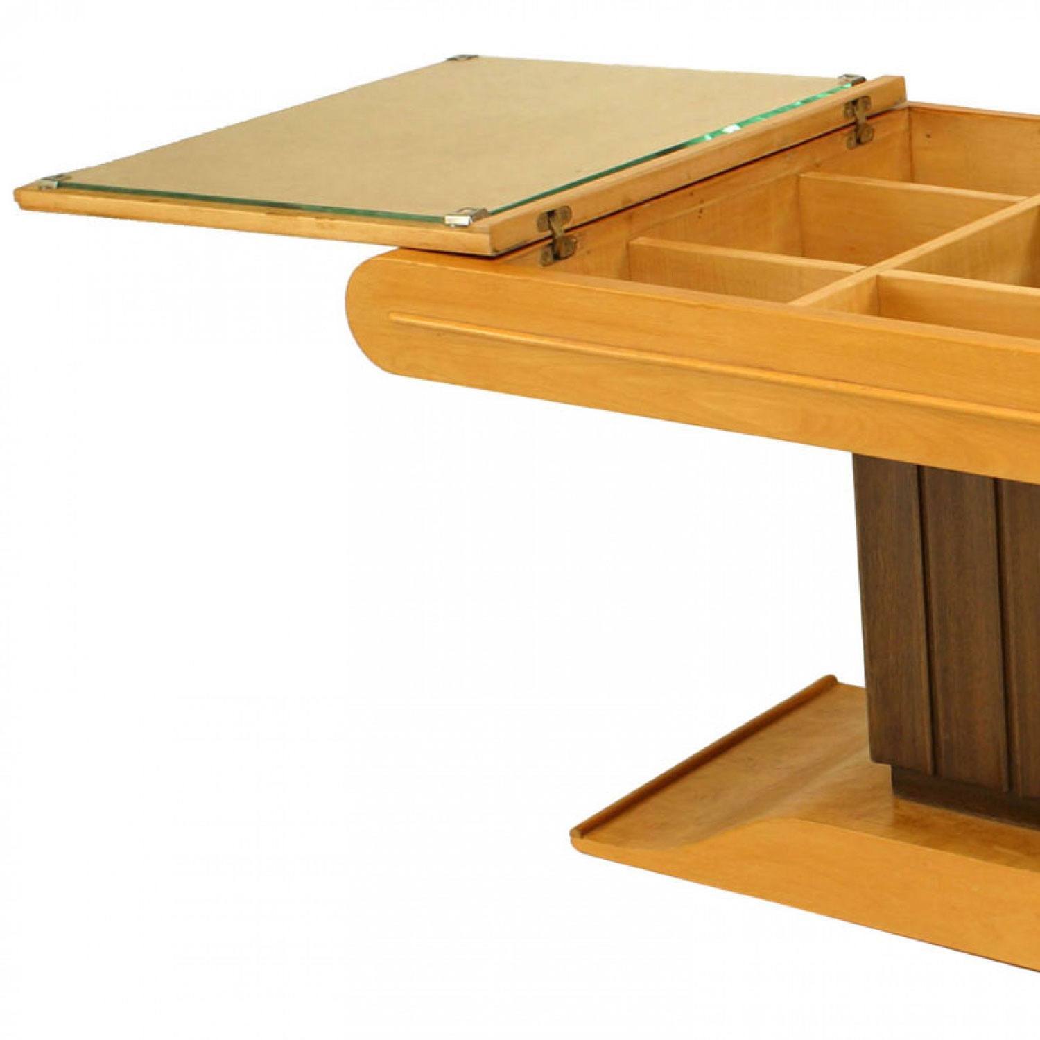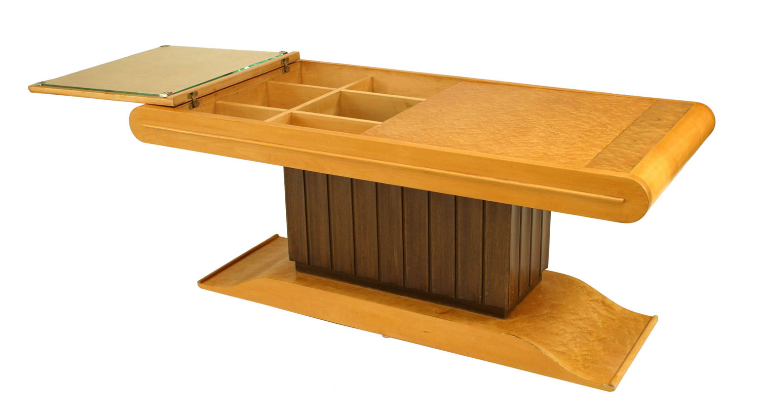 Italian Art Deco (1930s) rectangular birdseye maple coffee table with two top doors that open up to a central fluted pedestal section with a dark stained finish that contains a bar cabinet..