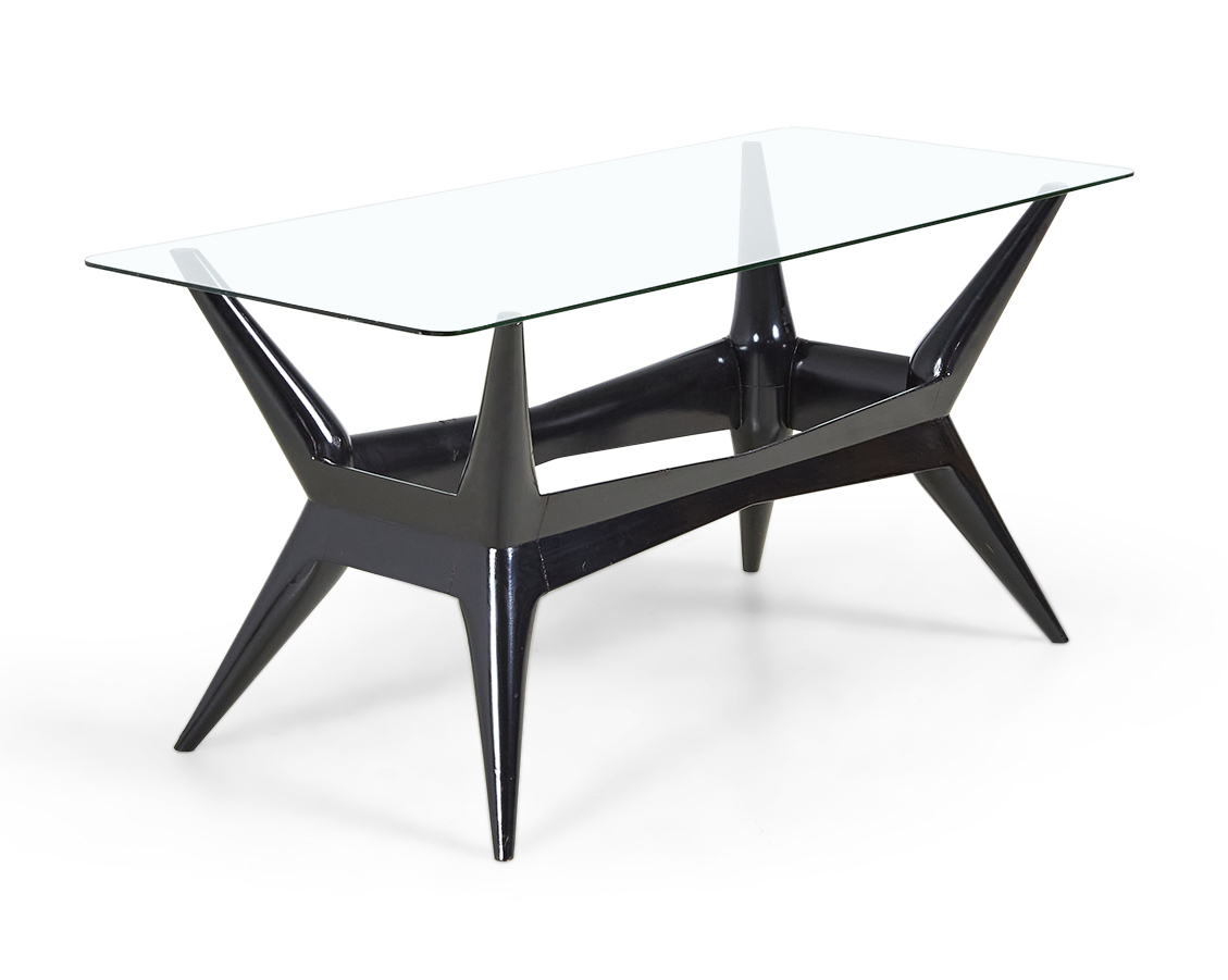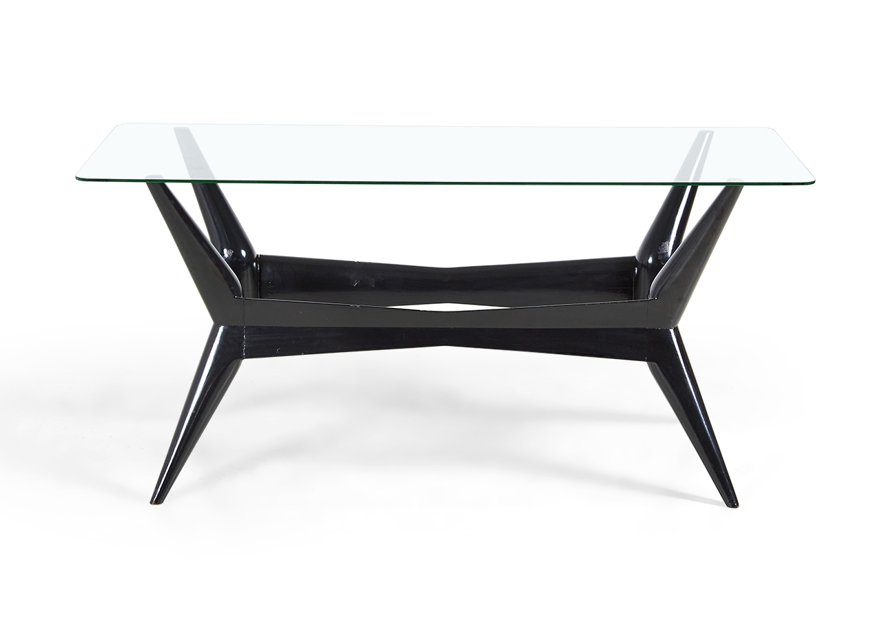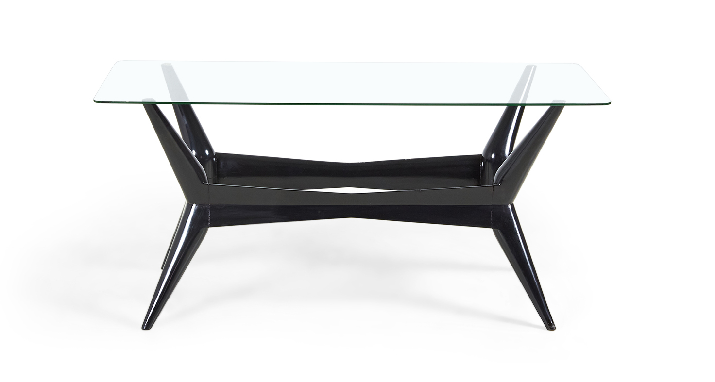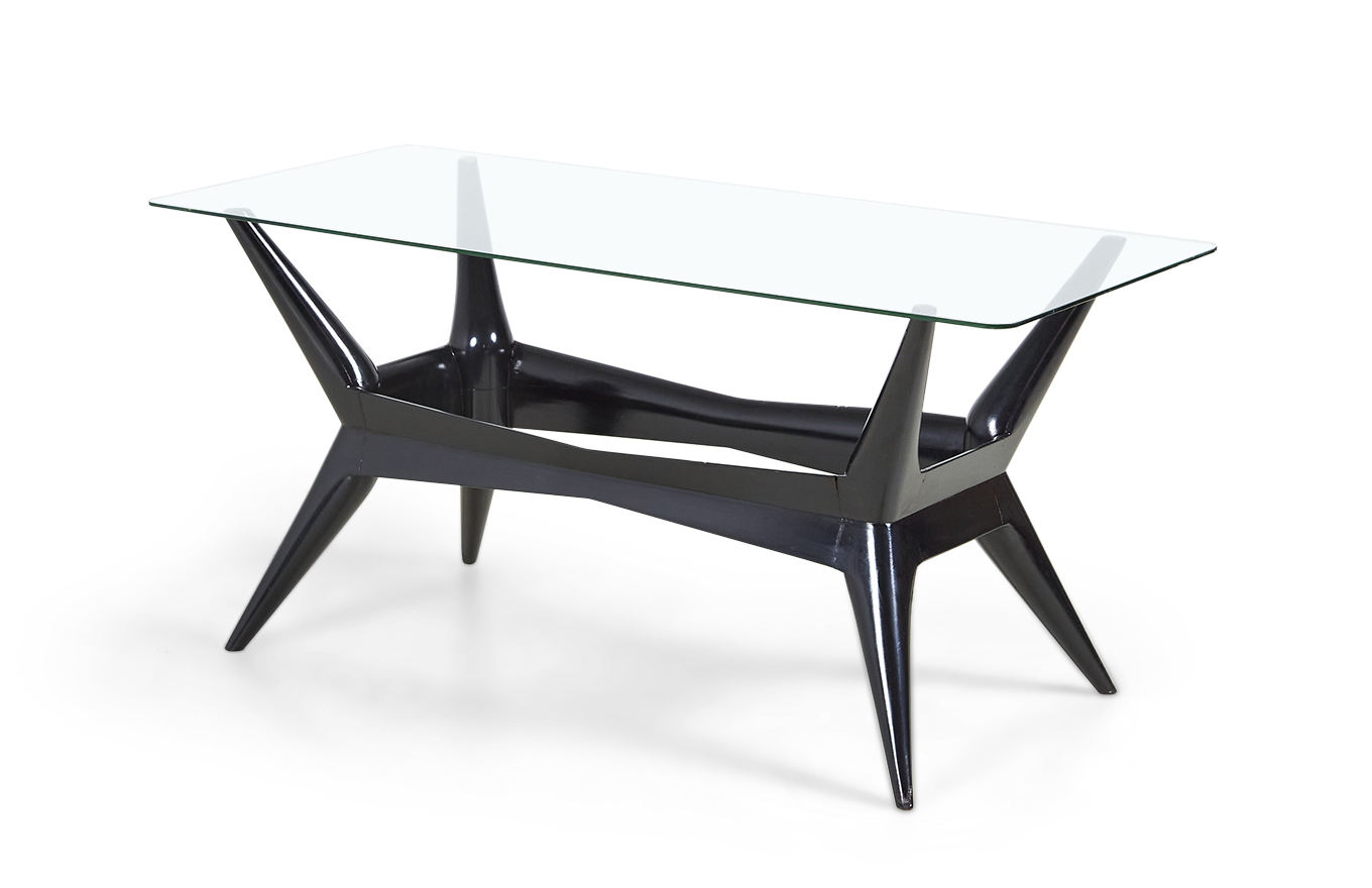 Italian Mid-Century black painted coffee table with tapered legs and carved edges supporting a rectangular glass top..