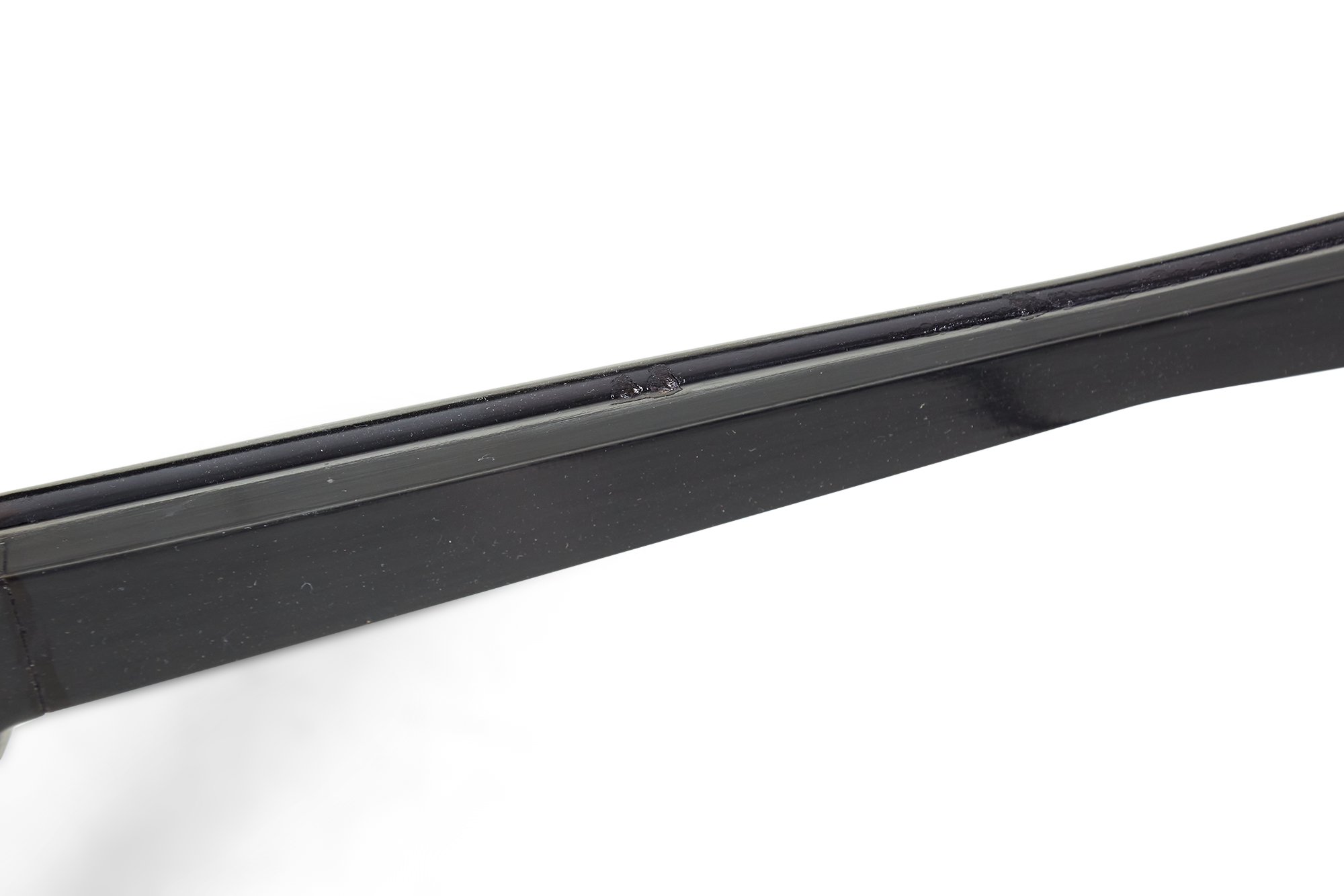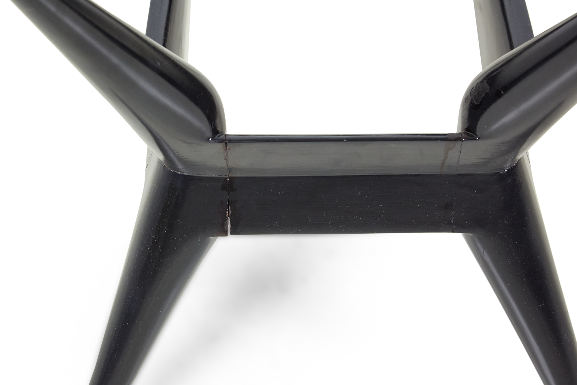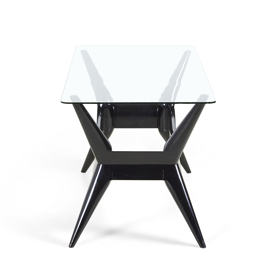 Italian Mid-Century black painted coffee table with tapered legs and carved edges supporting a rectangular glass top.