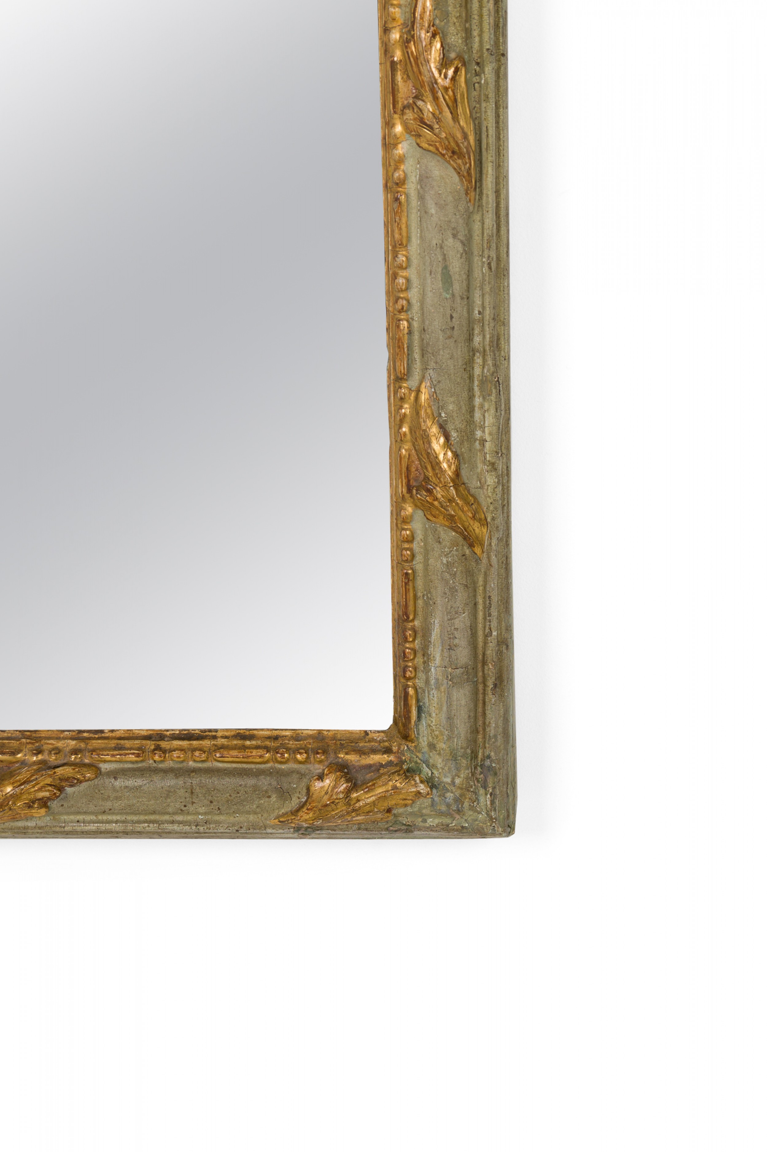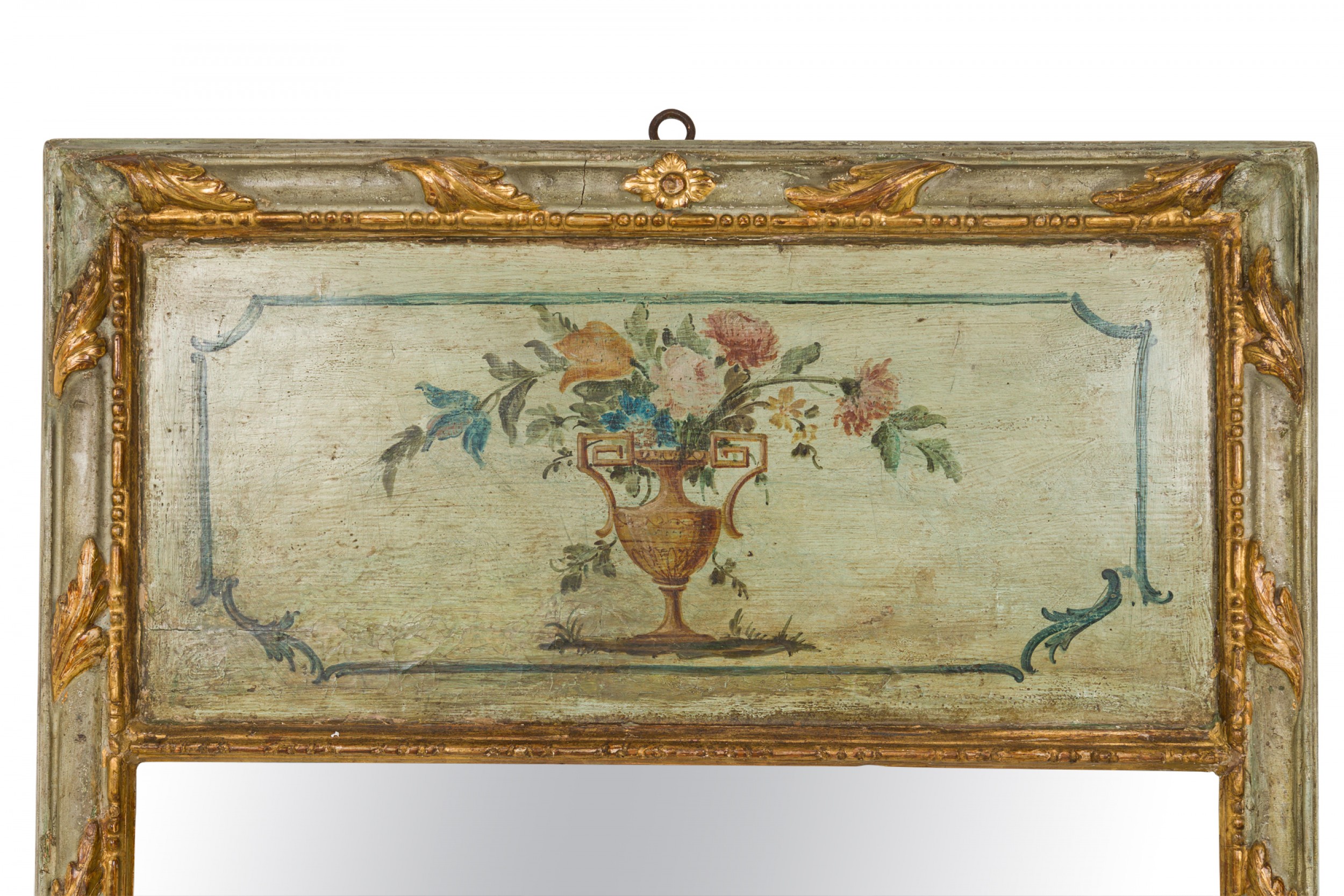 Italian Genoese Rococo (18th Century) trumeau mirror with an upper section that includes a recessed painted reserve displaying an urn overflowing with flowers, a gilt-painted relief acanthus leaf dot-dash border surrounding the exterior..