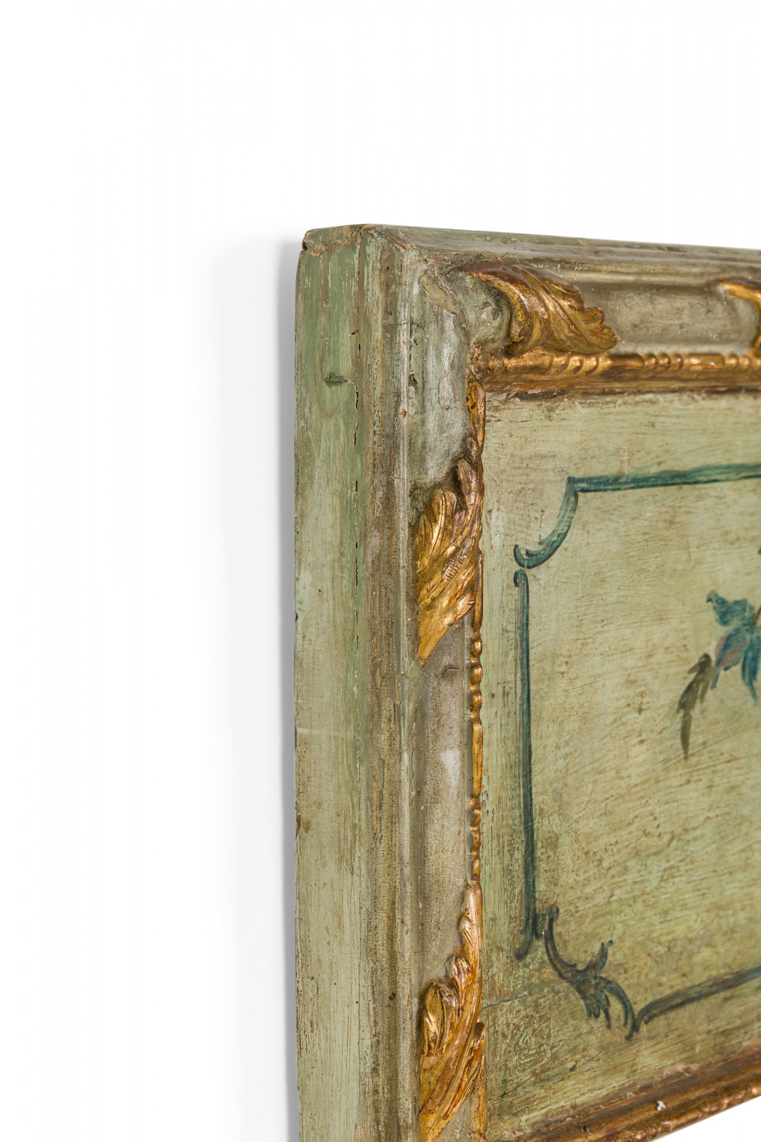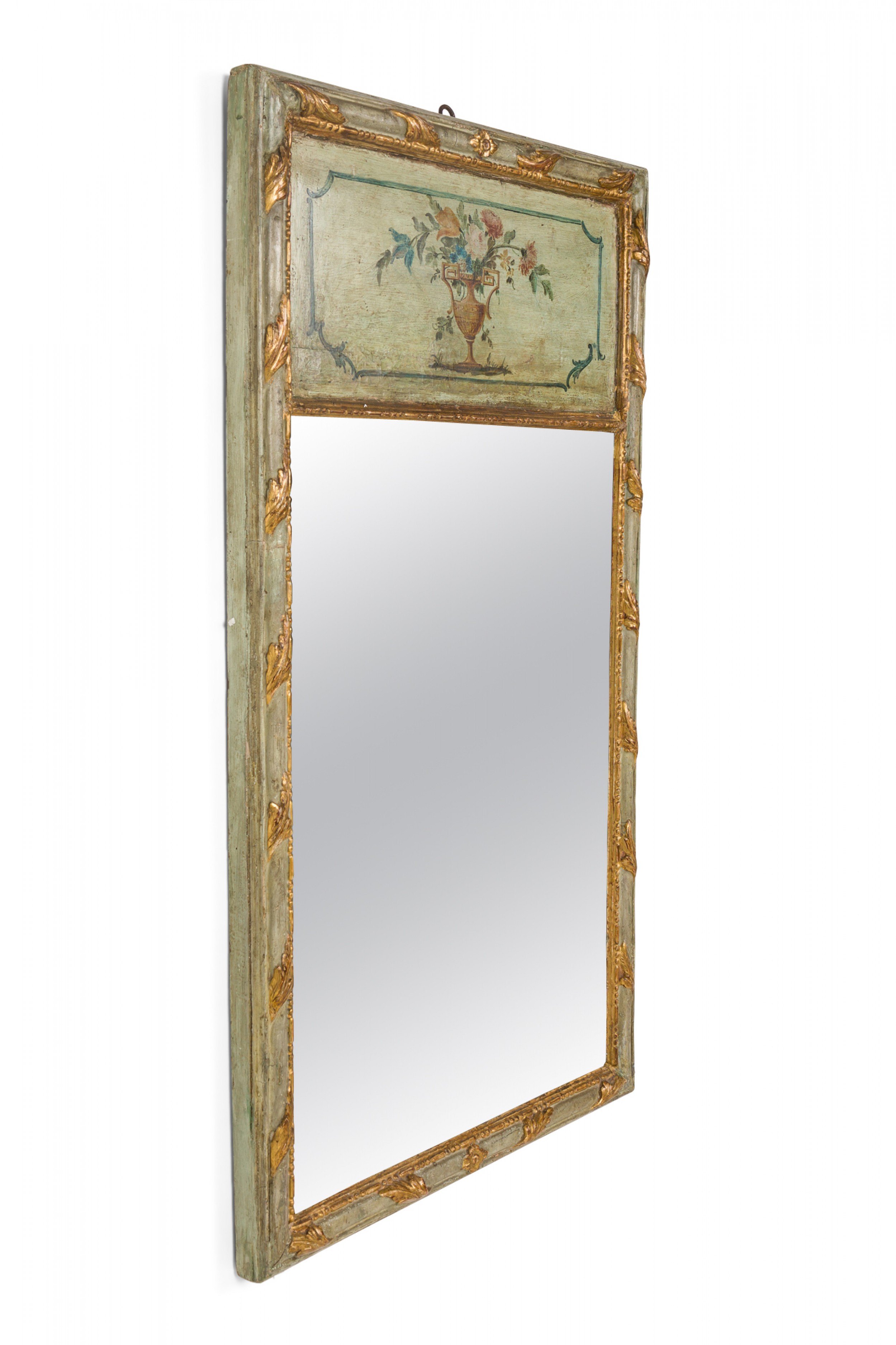 Italian Genoese Rococo (18th Century) trumeau mirror with an upper section that includes a recessed painted reserve displaying an urn overflowing with flowers, a gilt-painted relief acanthus leaf dot-dash border surrounding the exterior.
