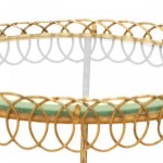 Italian 1940s gold painted metal pedestal with a round bevelled glass top surrounded by an open circular border and supported on 3 crossed legs with a round base..