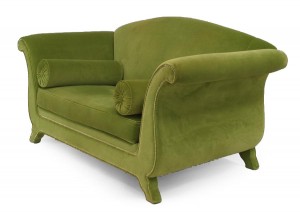 Italian 1940s style loveseat with camel back design and flared arms upholstered in light green velvet with 1 large seat cushion, 2 bolsters, and brass nail head trim.