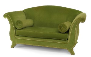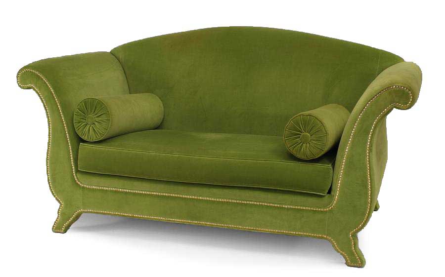 Italian 1940s style loveseat with camel back design and flared arms upholstered in light green velvet with 1 large seat cushion, 2 bolsters, and brass nail head trim