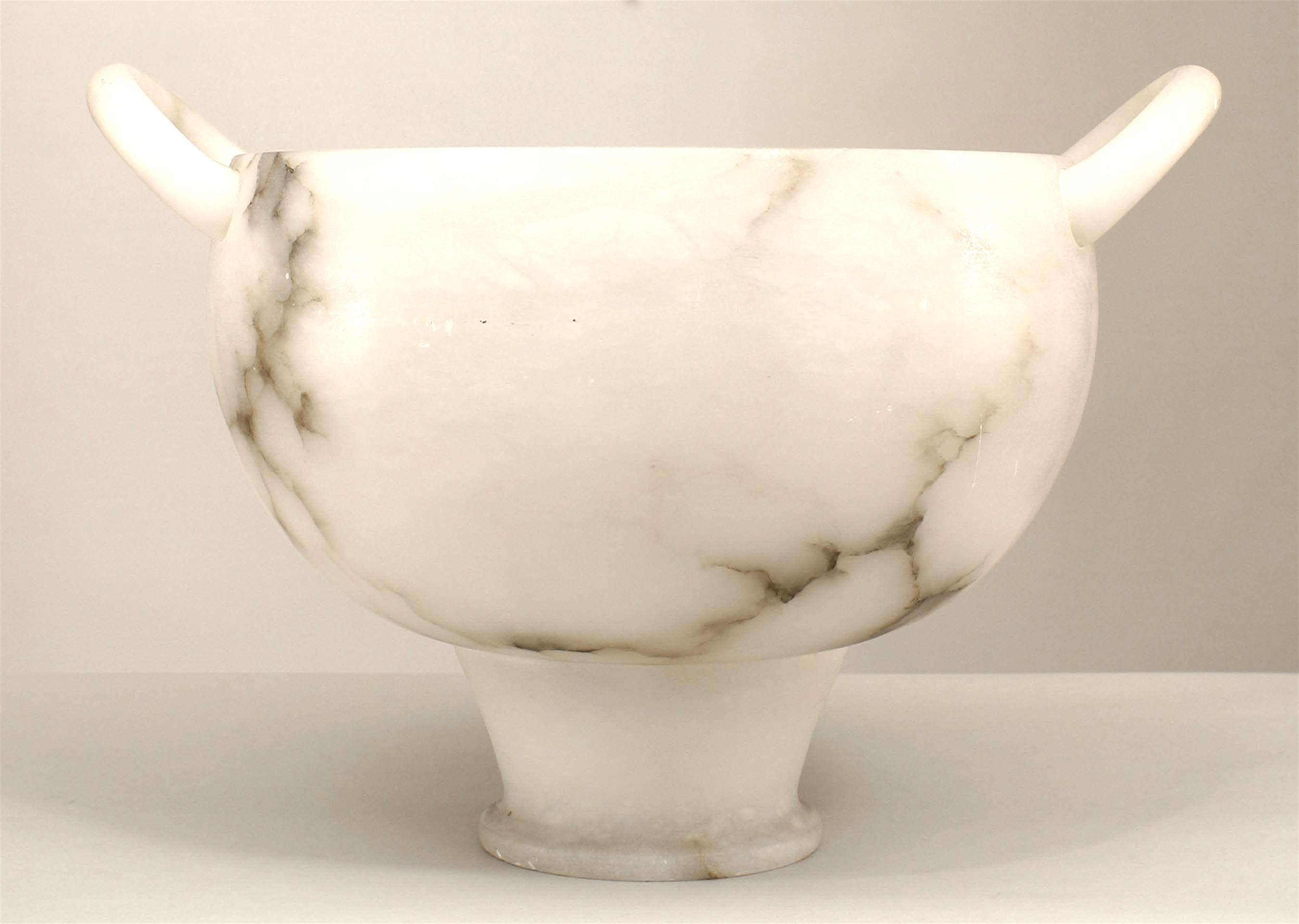 Italian Mid-Century (1940s) large alabaster round bowl (jardiniere) with handles supported on a solid conical shaped base