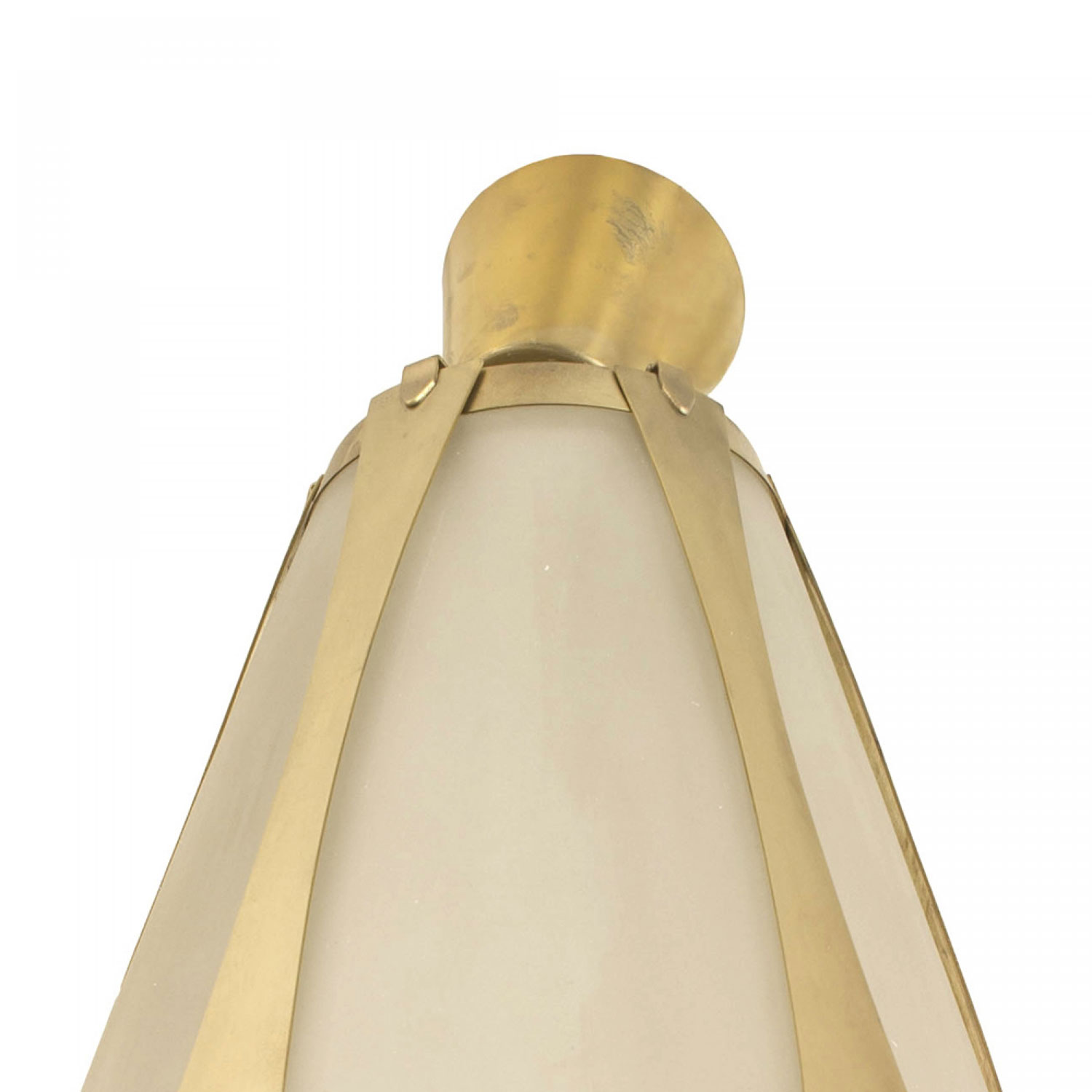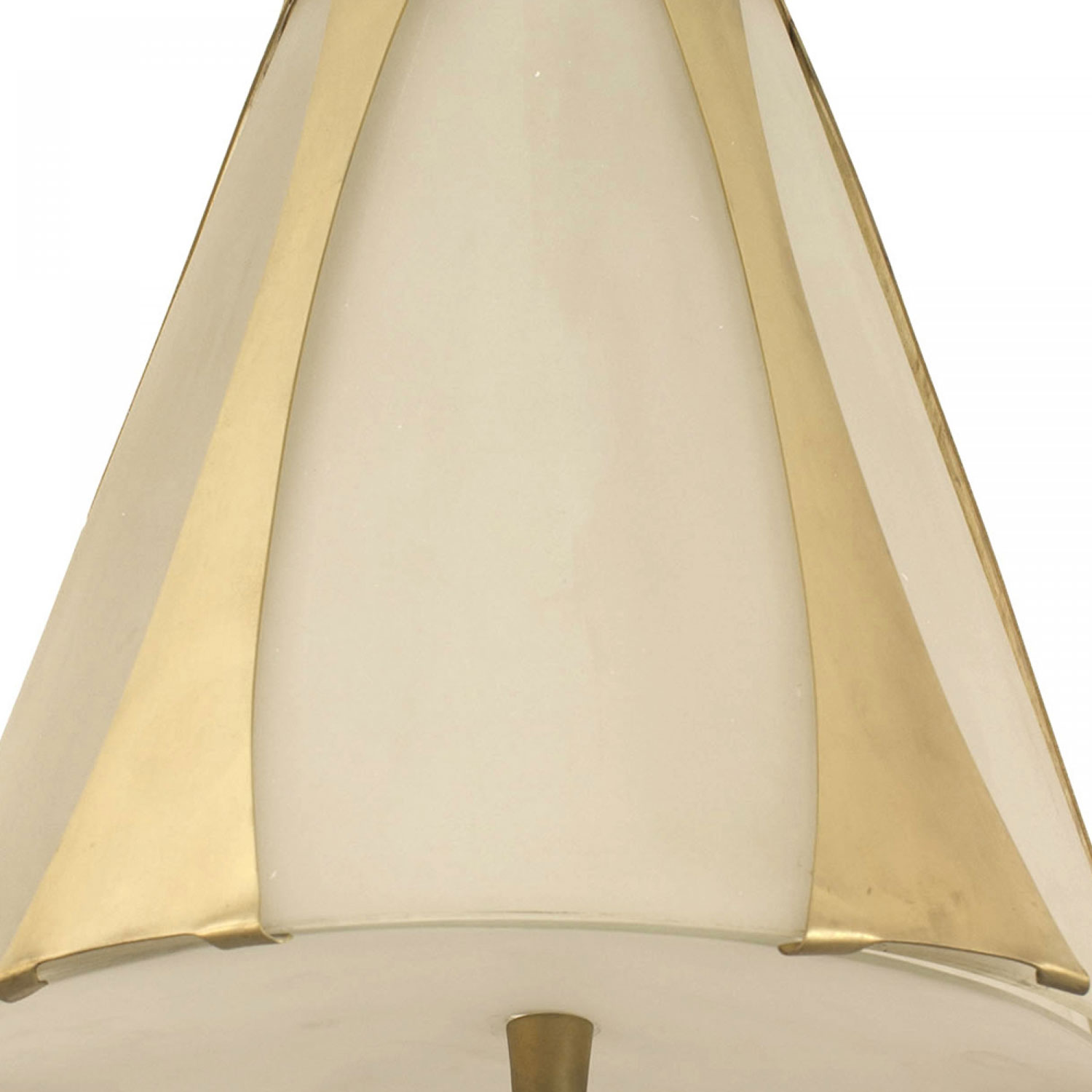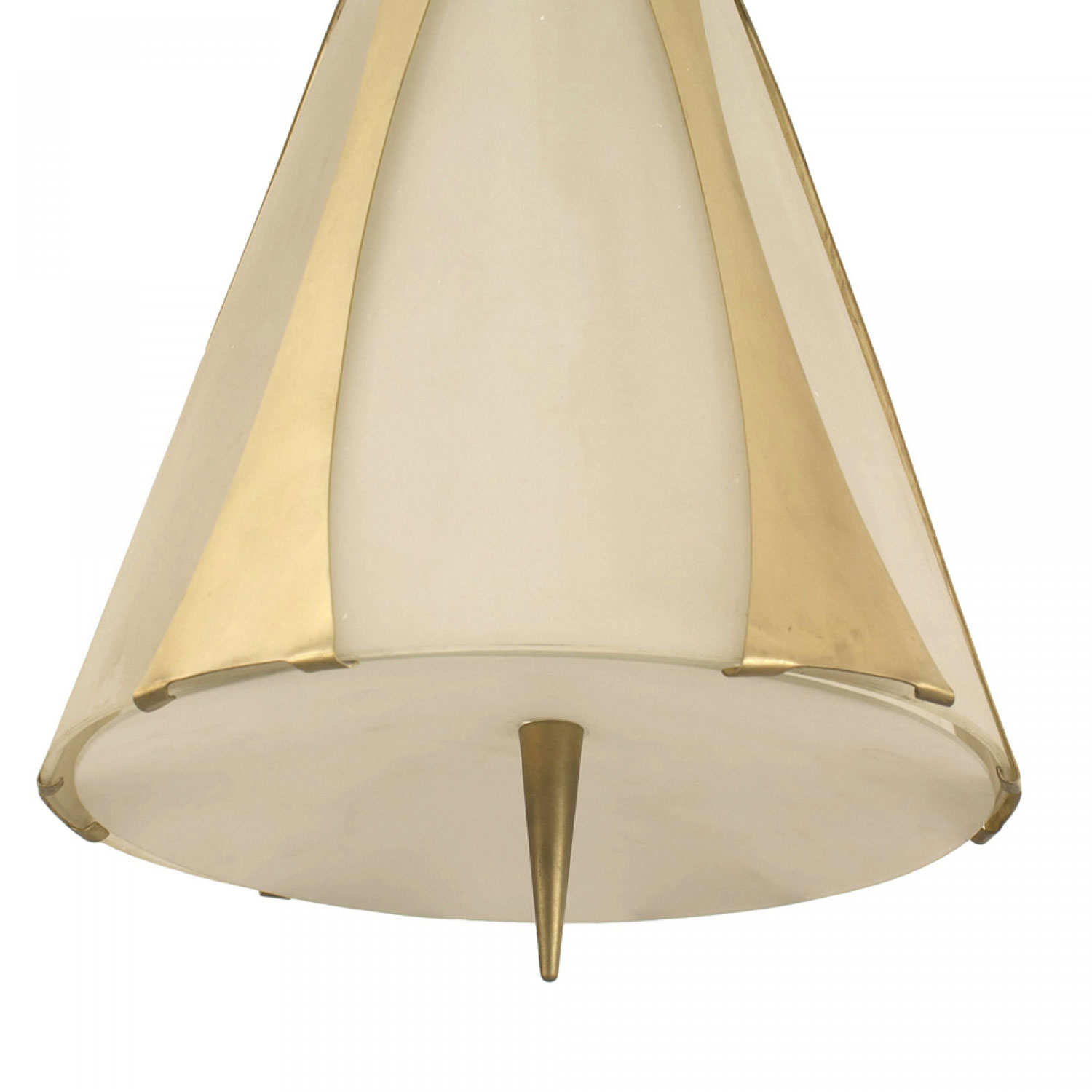 Italian 1940s gilded brass conical formed lantern with ovoid shaped white glass panels and a round glass bottom having a pointed finial.