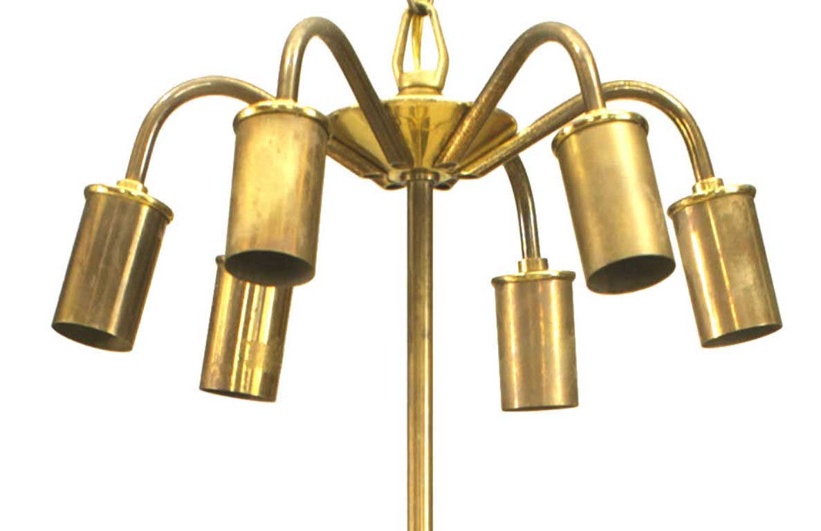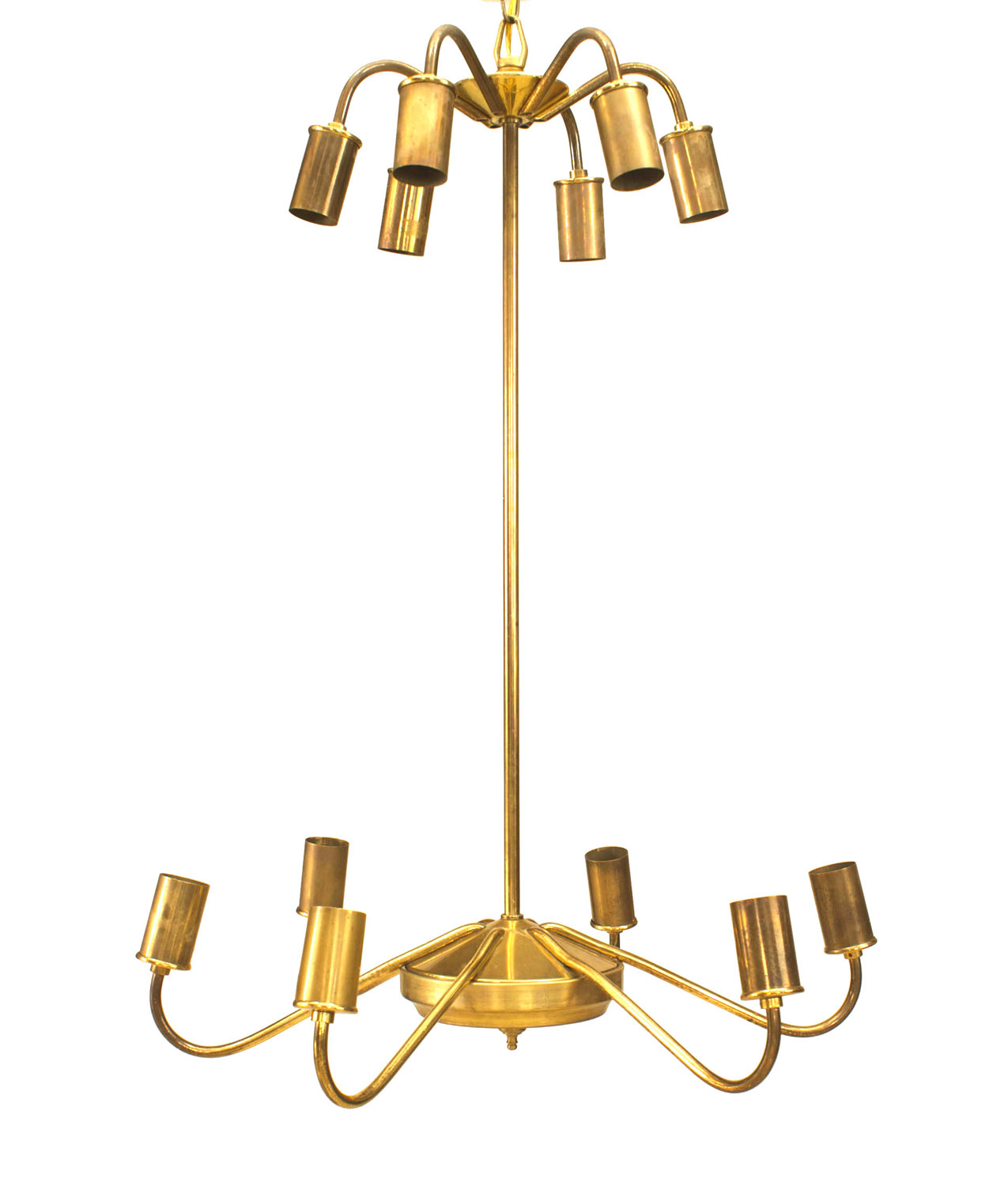 Italian Mid-Century (1950s) brass chandelier with 6 lights on bottom facing up and 6 lights on top facing down..