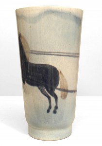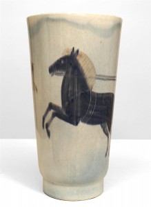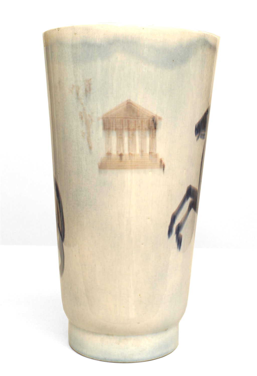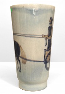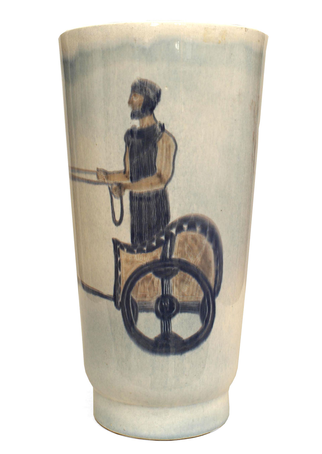 Italian 1940s llight blue glazed porcelain vase with a scene of a Roman figure riding a chariot with horse (signed & dated 1940).