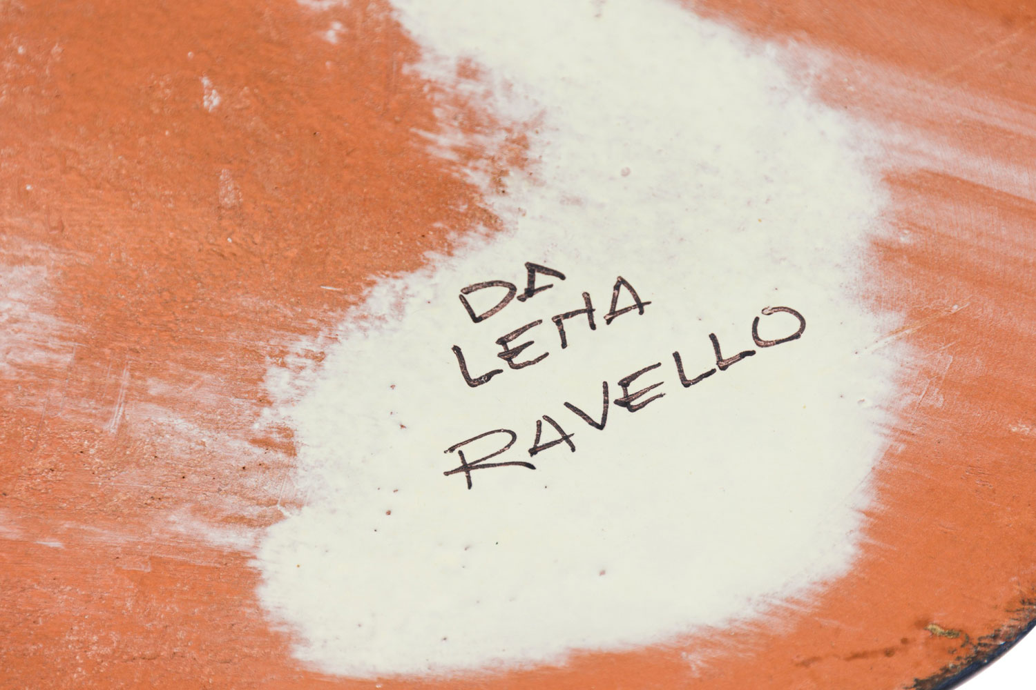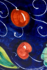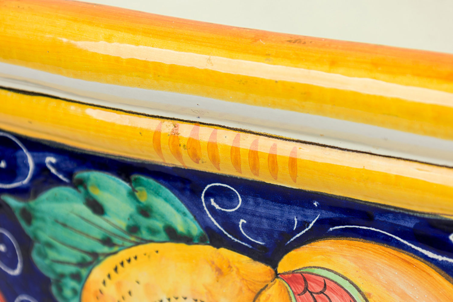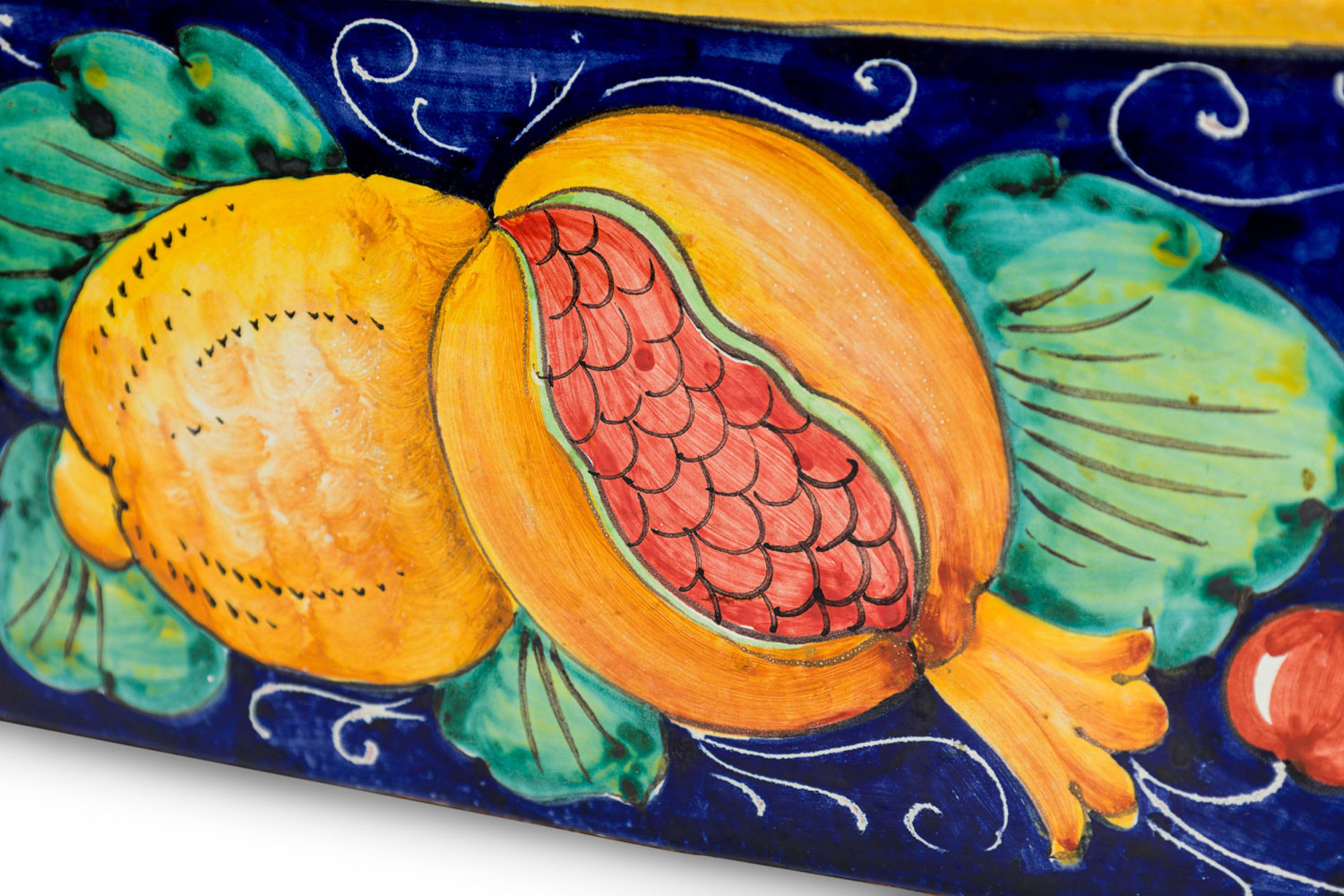 Italian Mid-Century decorative oblong bowl featuring pomegranate and cherries with a lion head handles (Signed on bottom: Da Lena Ravello).