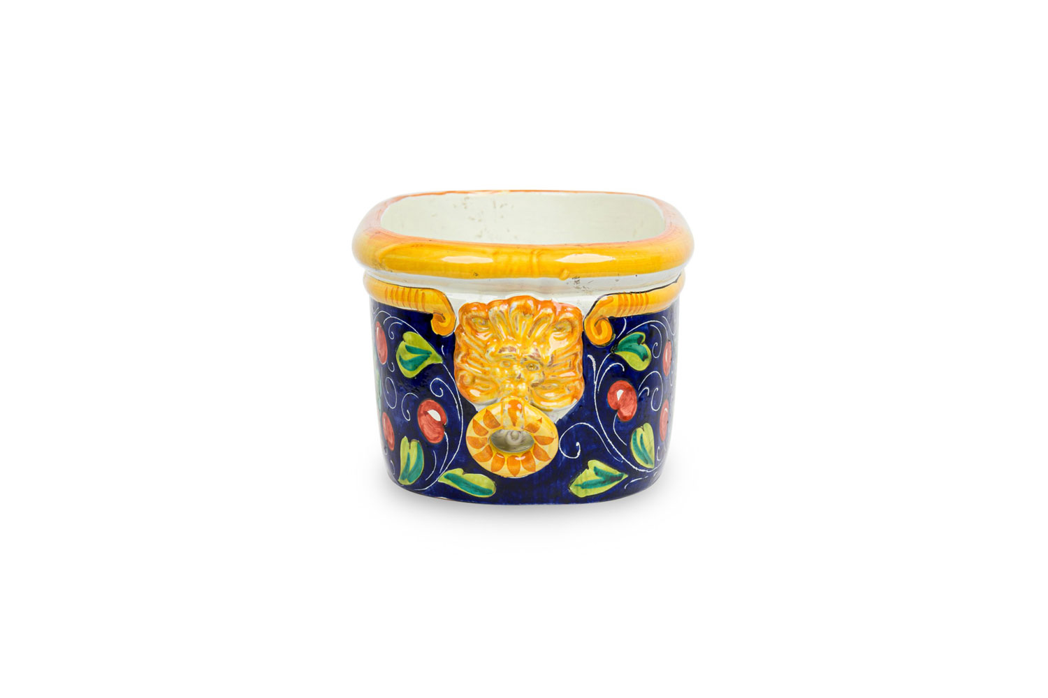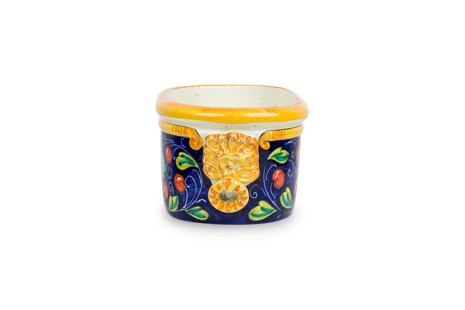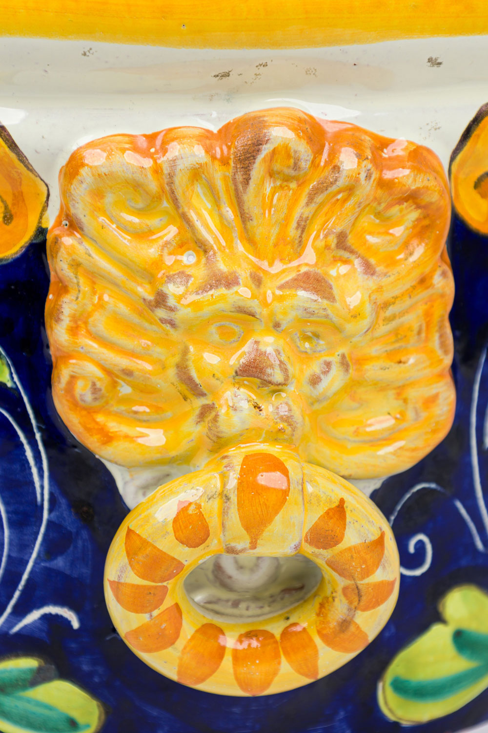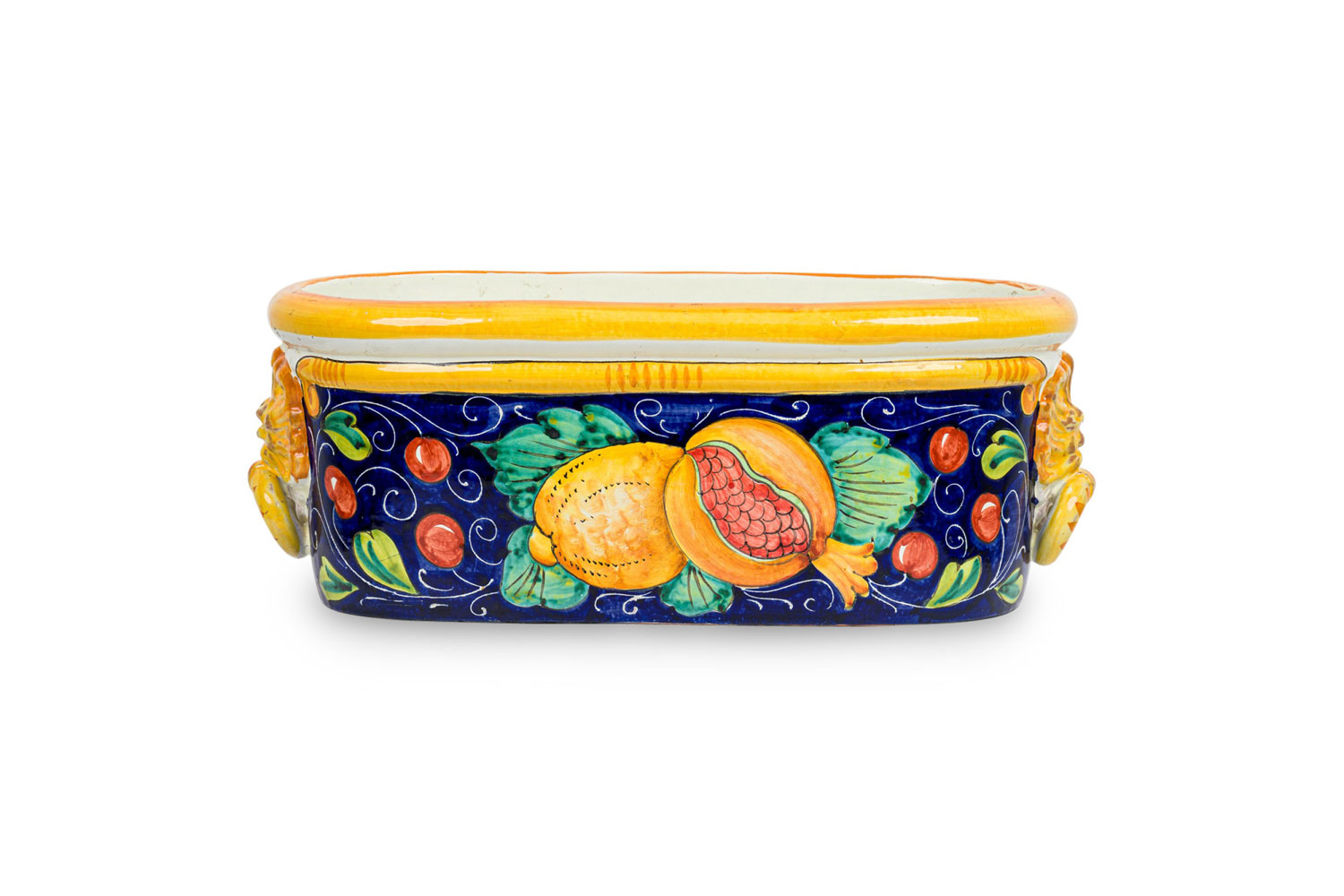 Italian Mid-Century decorative oblong bowl featuring pomegranate and cherries with a lion head handles (Signed on bottom: Da Lena Ravello)