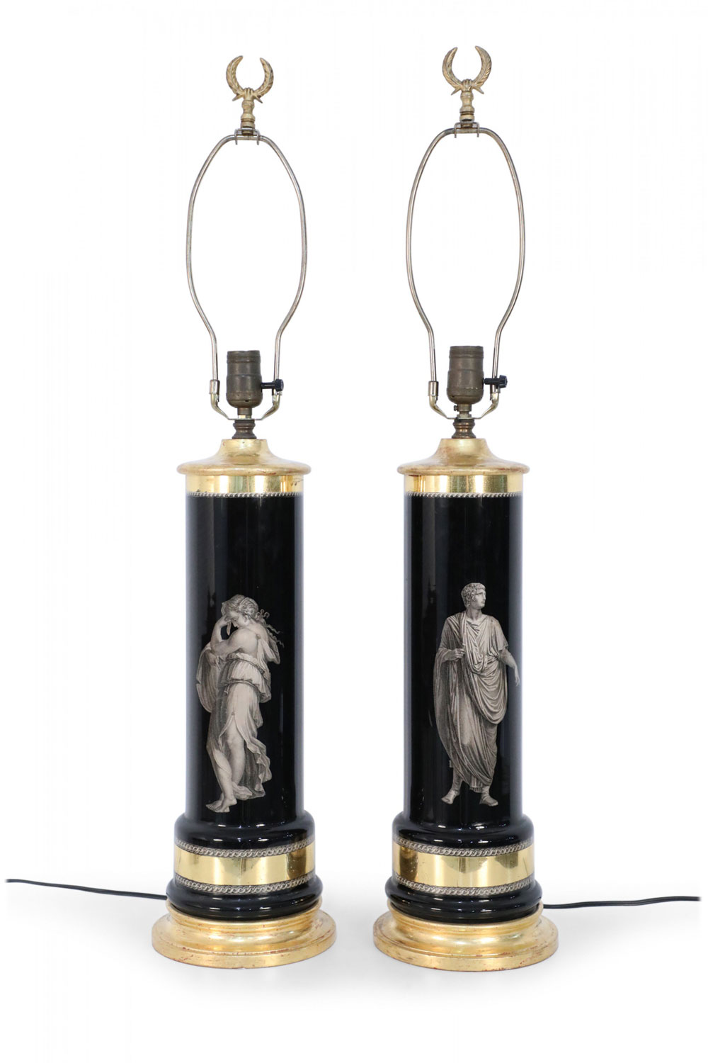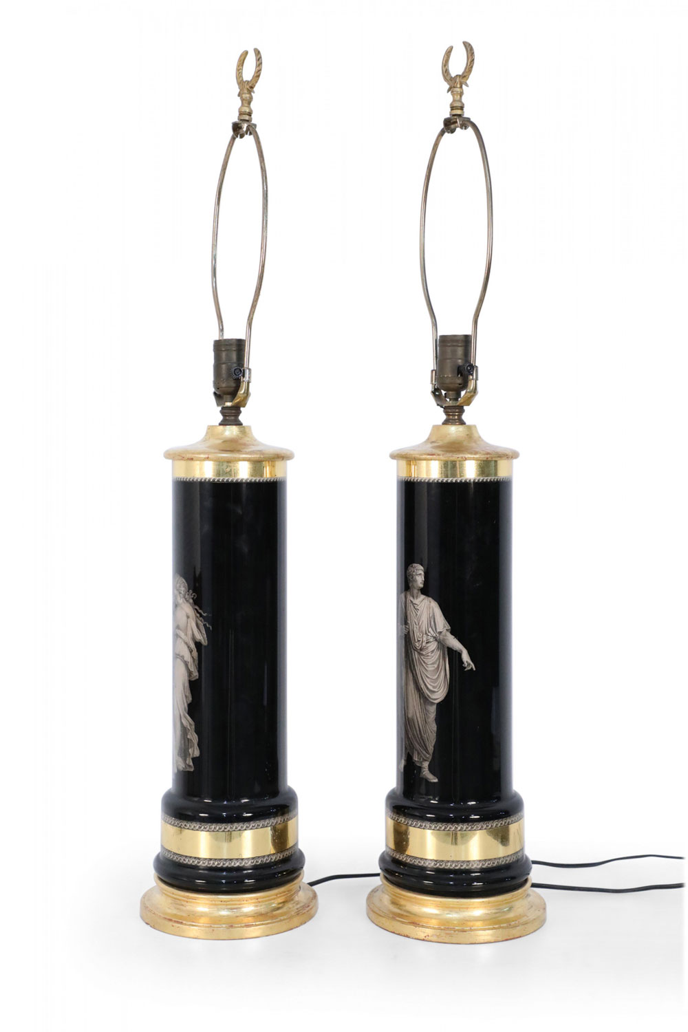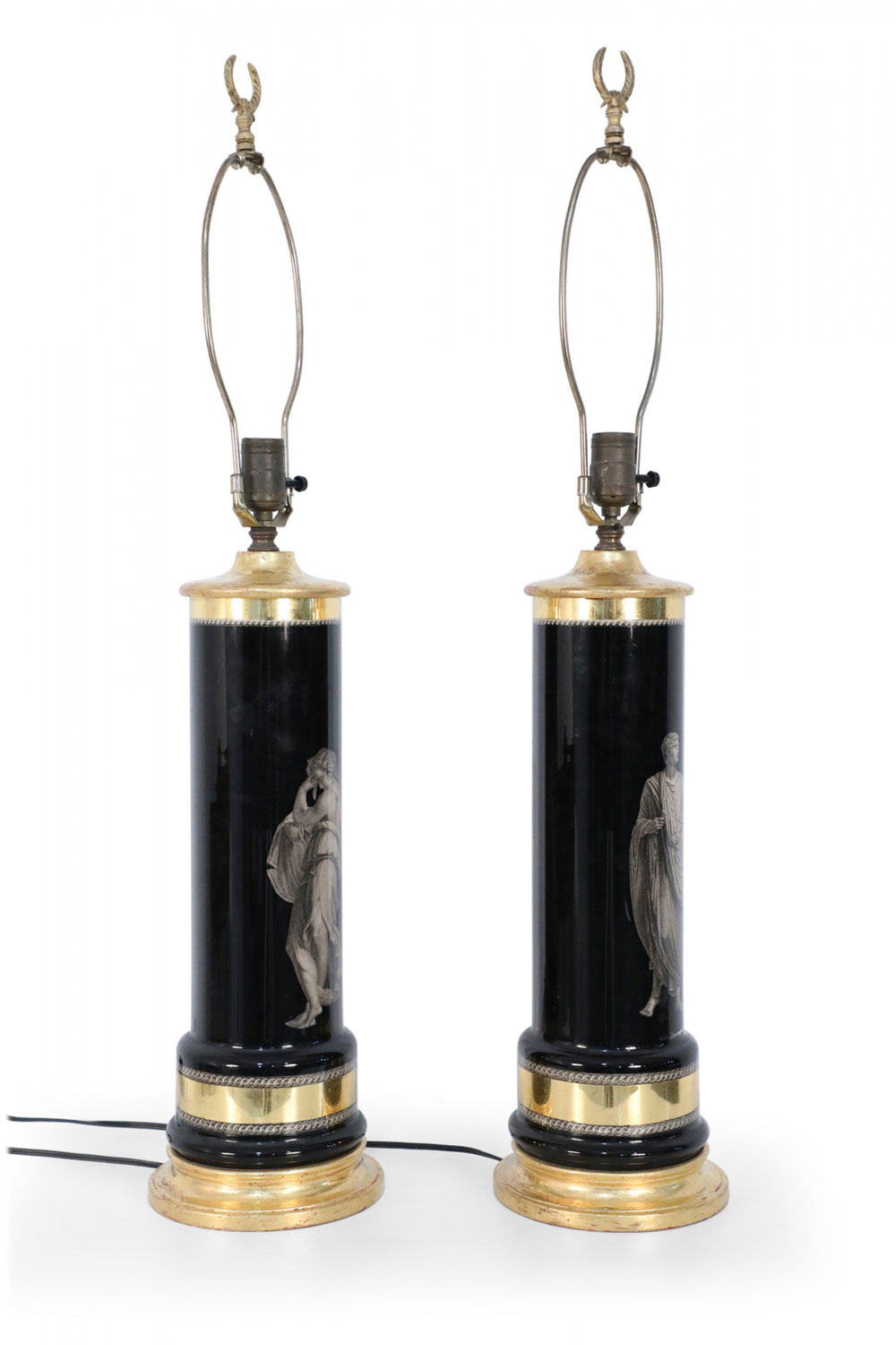 PAIR of Italian 1940/50s black cylindrical eglomise glass table lamps with classical figures of a man and lady on a round gilt wood base (PRICED AS PAIR).