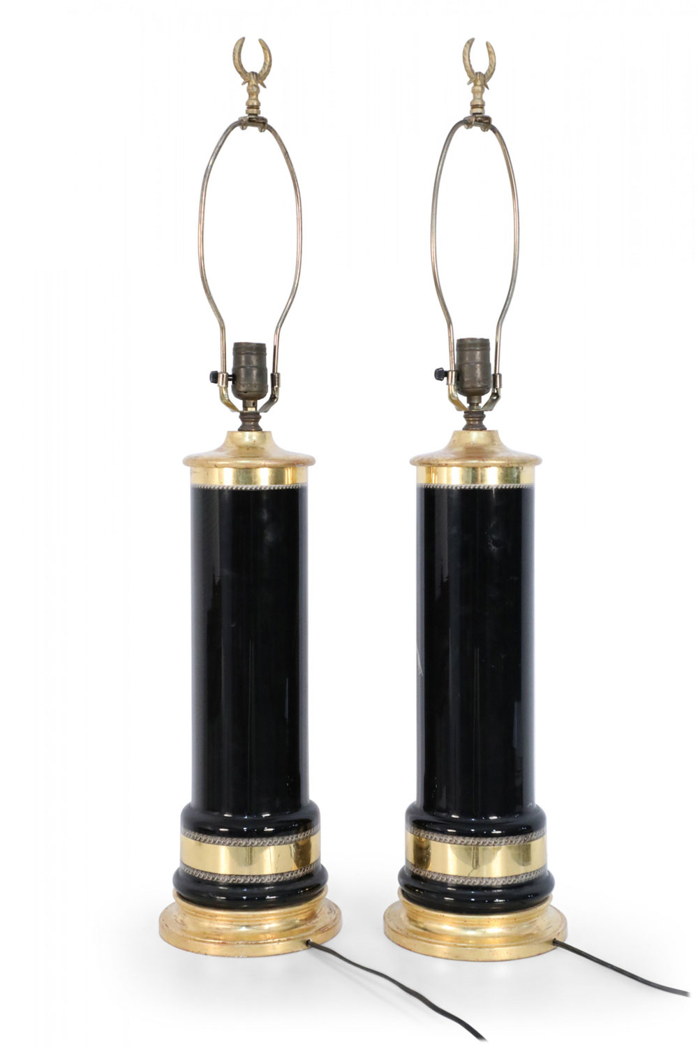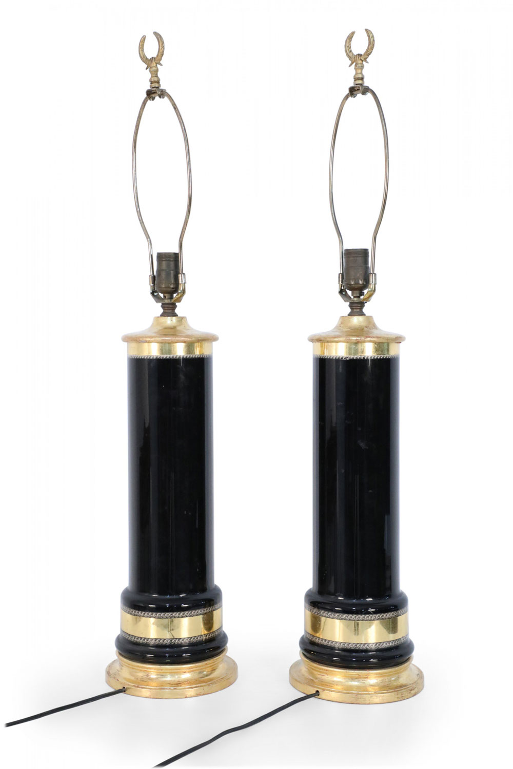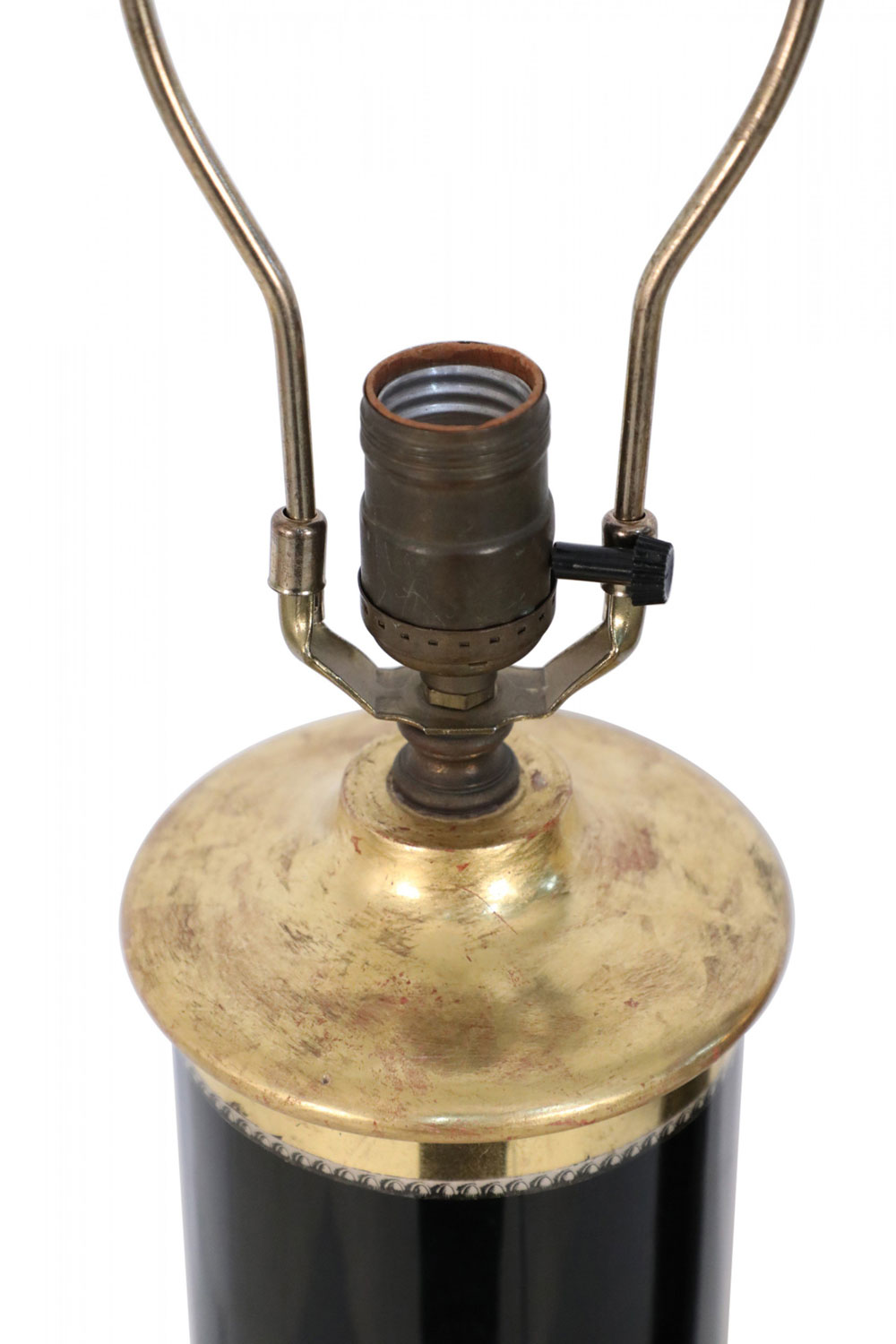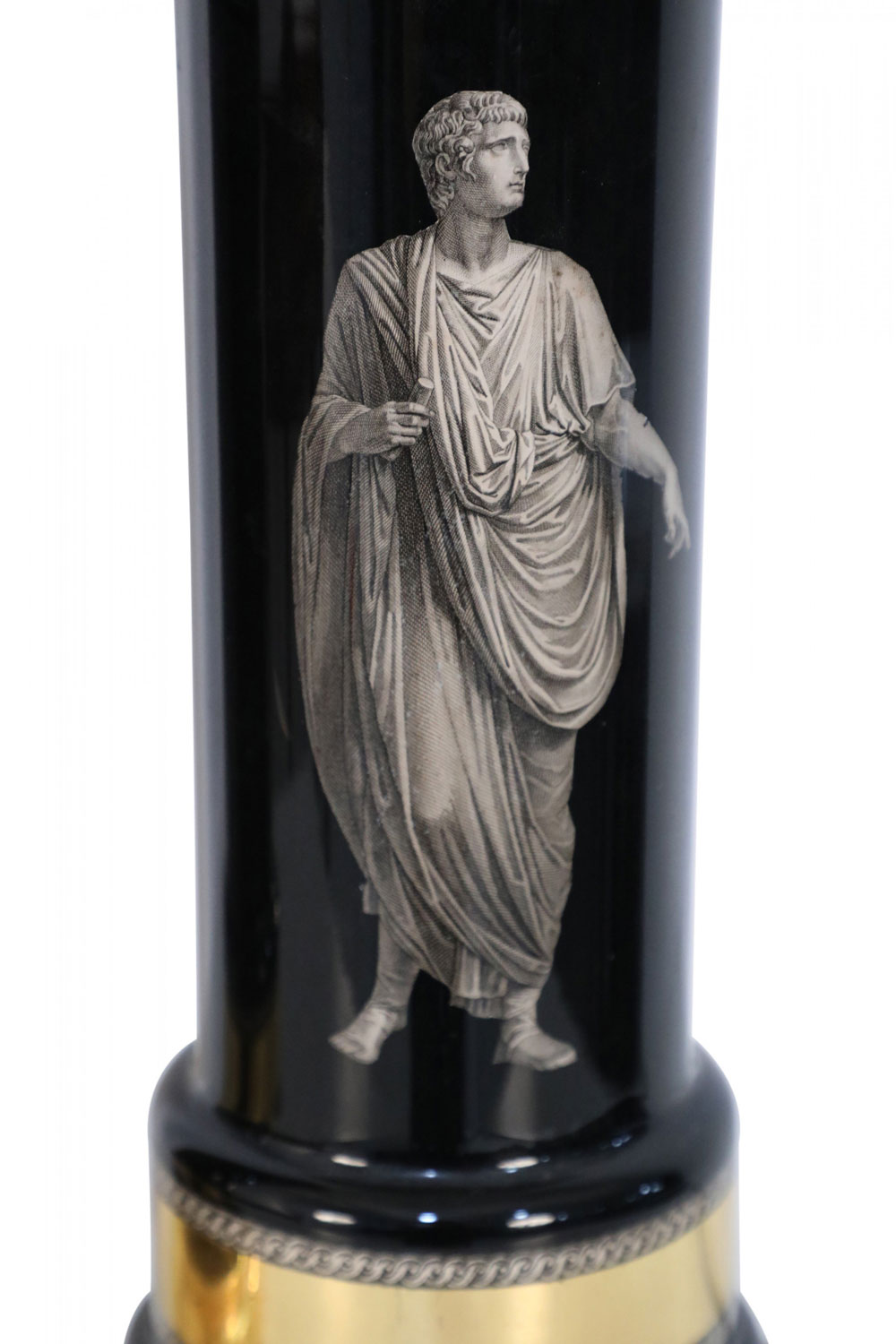 PAIR of Italian 1940/50s black cylindrical eglomise glass table lamps with classical figures of a man and lady on a round gilt wood base (PRICED AS PAIR).