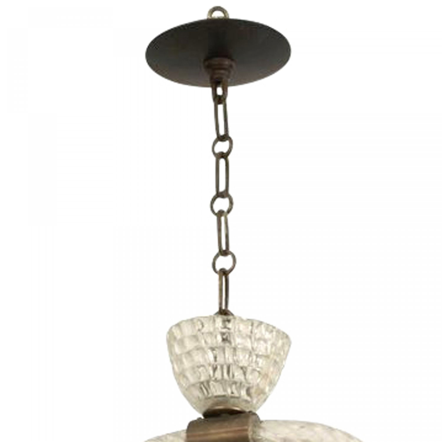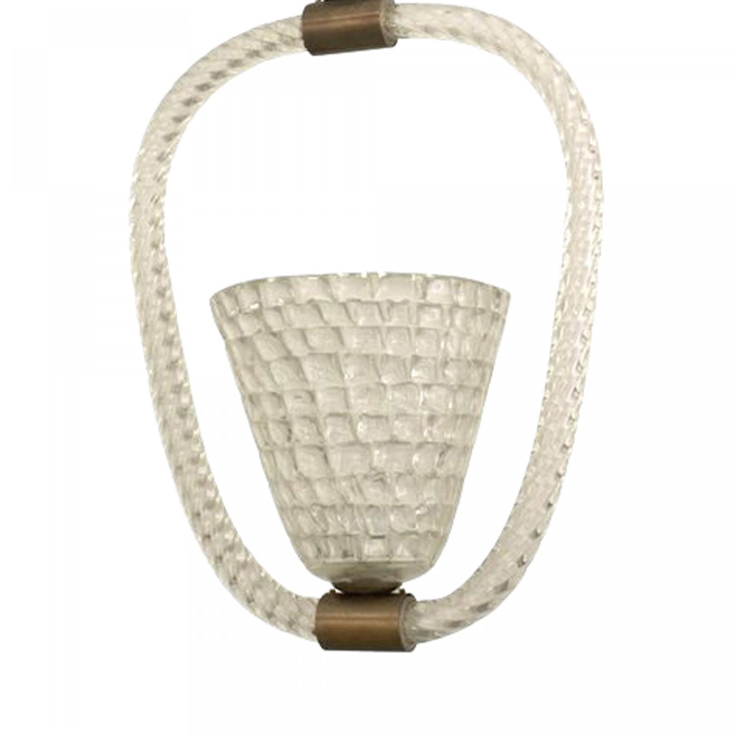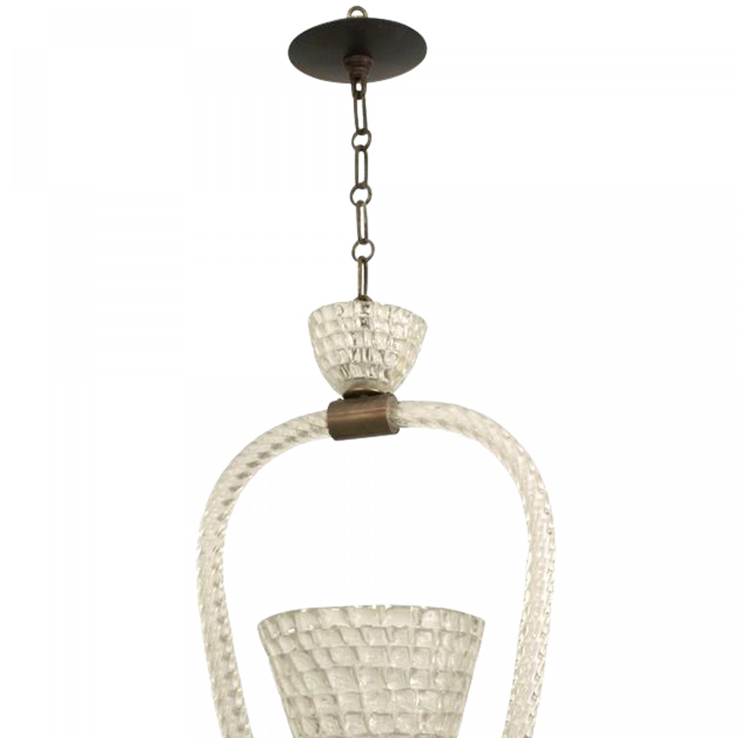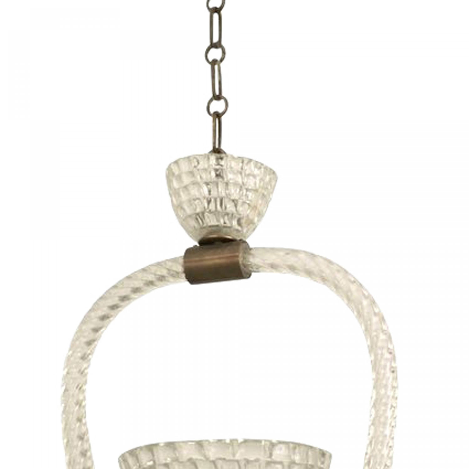 Italian 1940s lantern with a conical shaped centered woven form clear glass shade surrounded by a clear swirl glass ring with metal fittings (BAROVIER ET TOSO)..