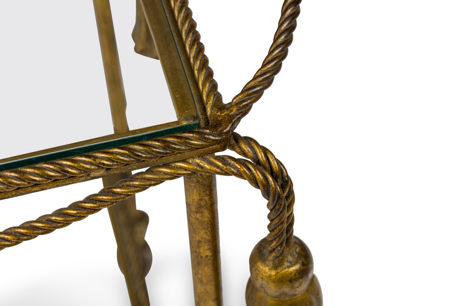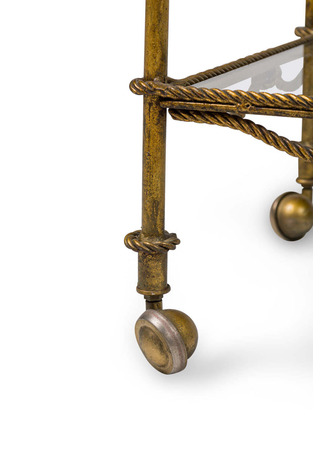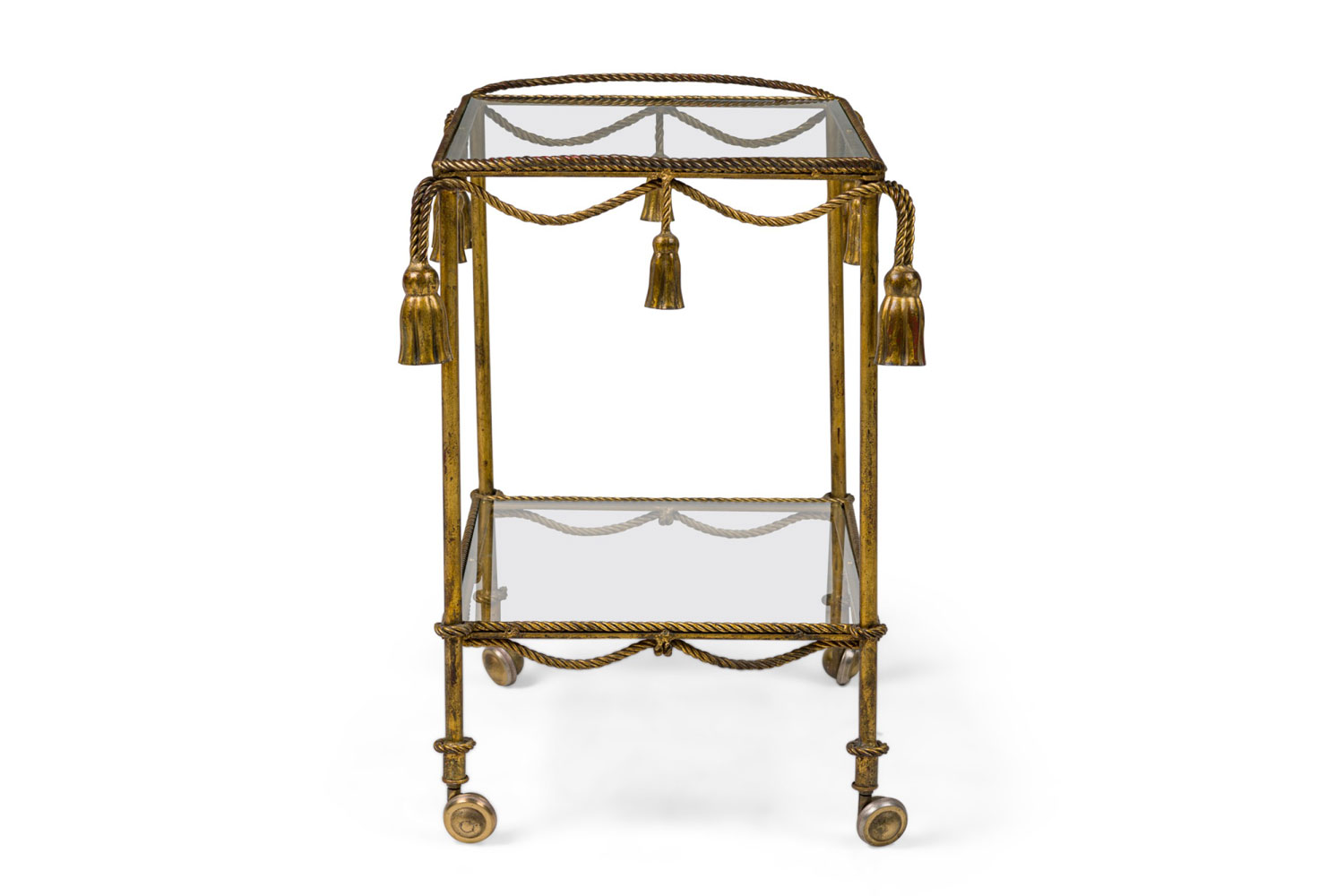 Italian Mid-Century Rope and Tassel design two tiered bar-cart with a glass top and shelf on casters