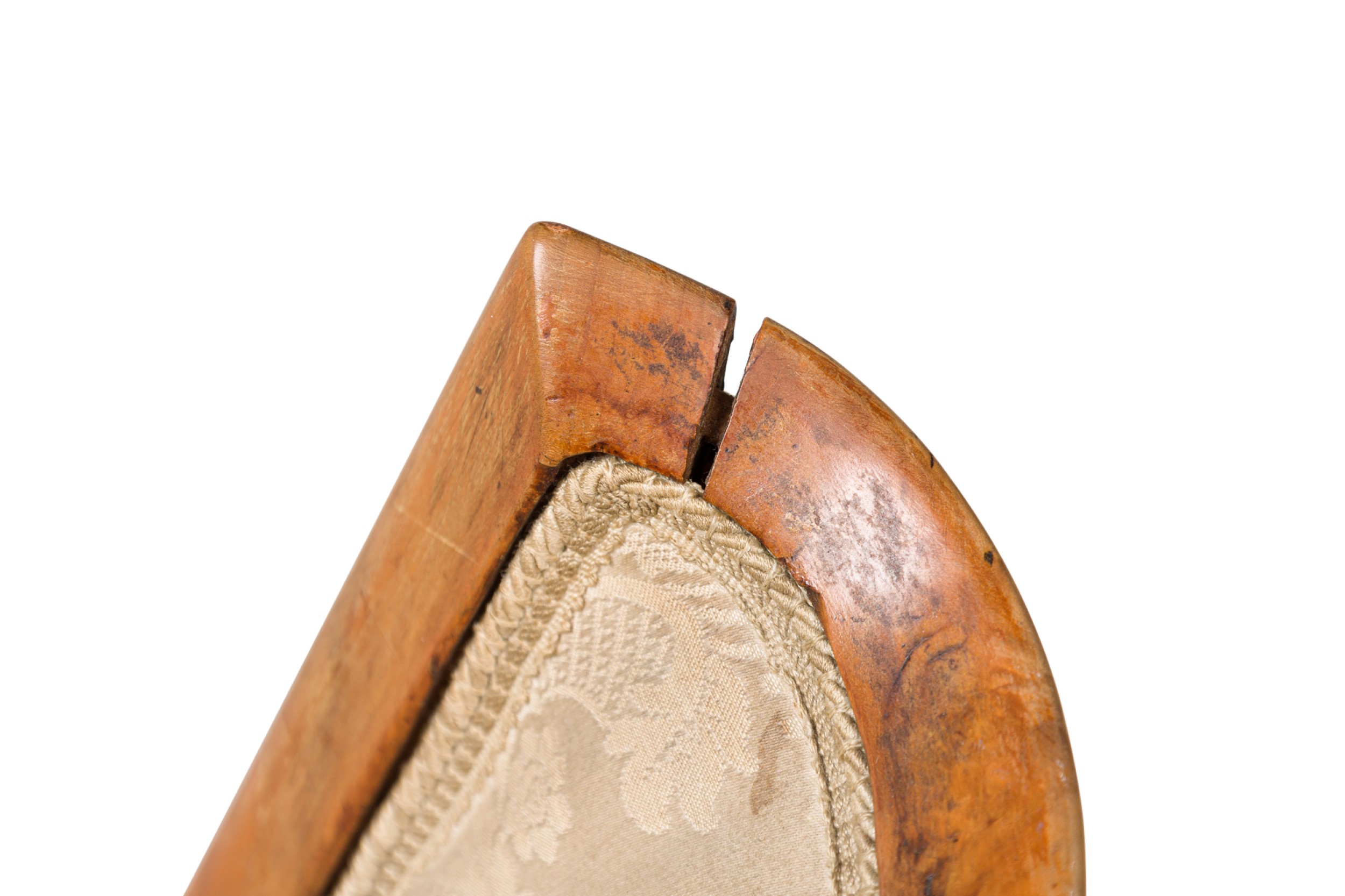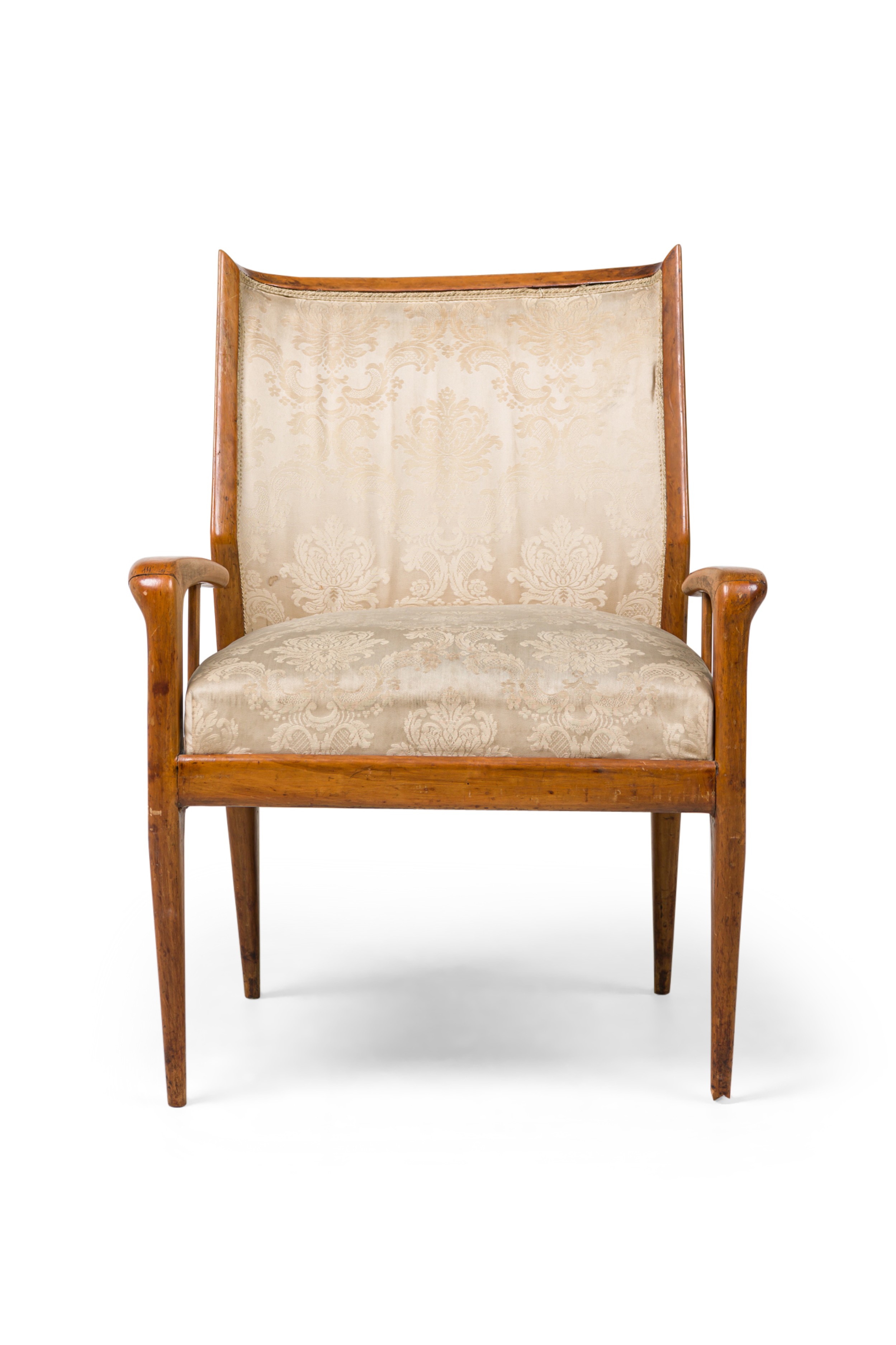 Italian Mid-Century Walnut armchair with a curved wingback form and tapering atomic style armrests with beige damask upholstery on the seat and back (style of GIO PONTI).