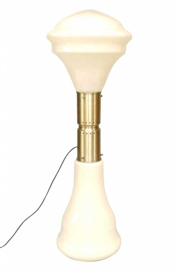 Italian Post-War Design (1960s) low floor lamp with 2 white glass sections separated by aluminum fittings with an aluminum base and round top cover.