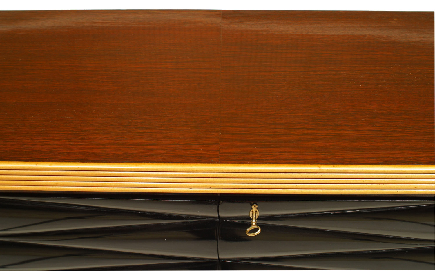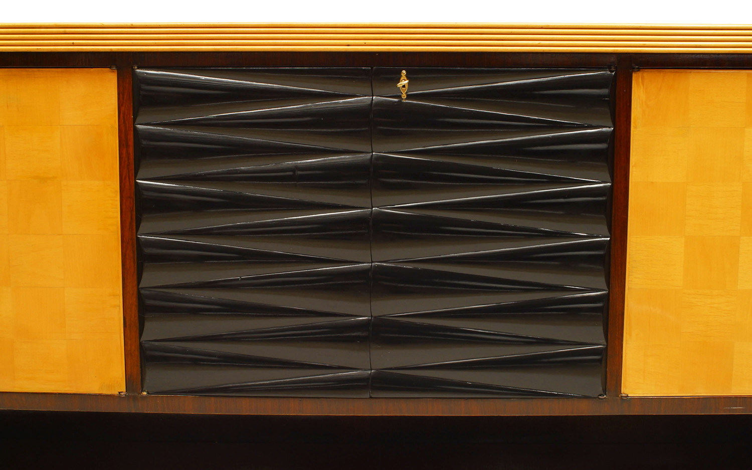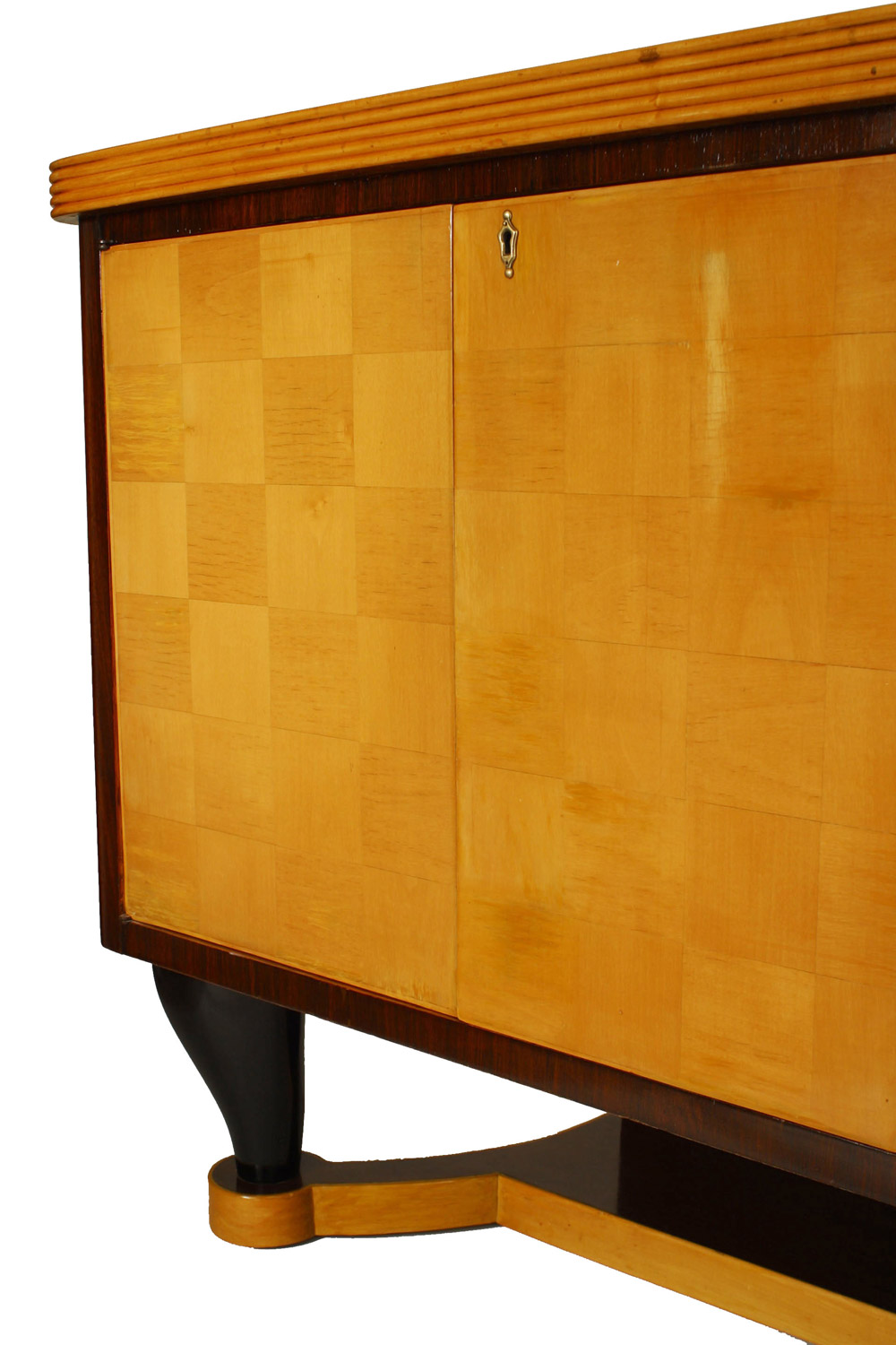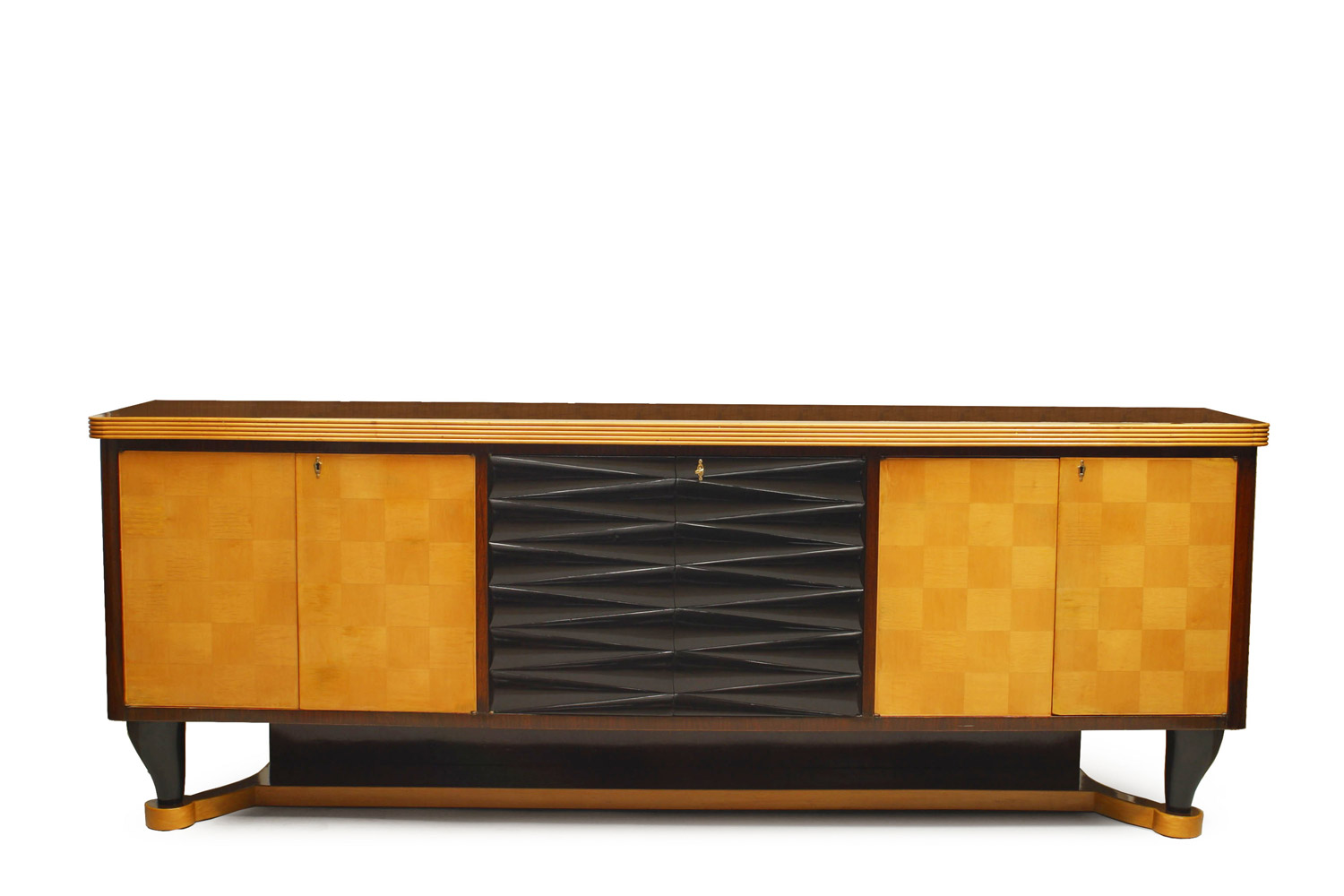 Italian Mid-Century (1940s) mahogany sideboard with 4 maple parquetry doors centering a pair of ebonized doors and supported on 4 ebonized legs over a platform base (Attributed to VITTORIO DASSI).