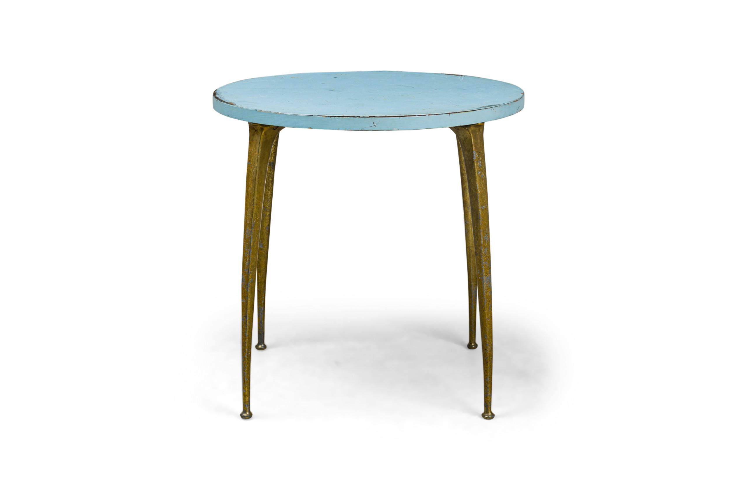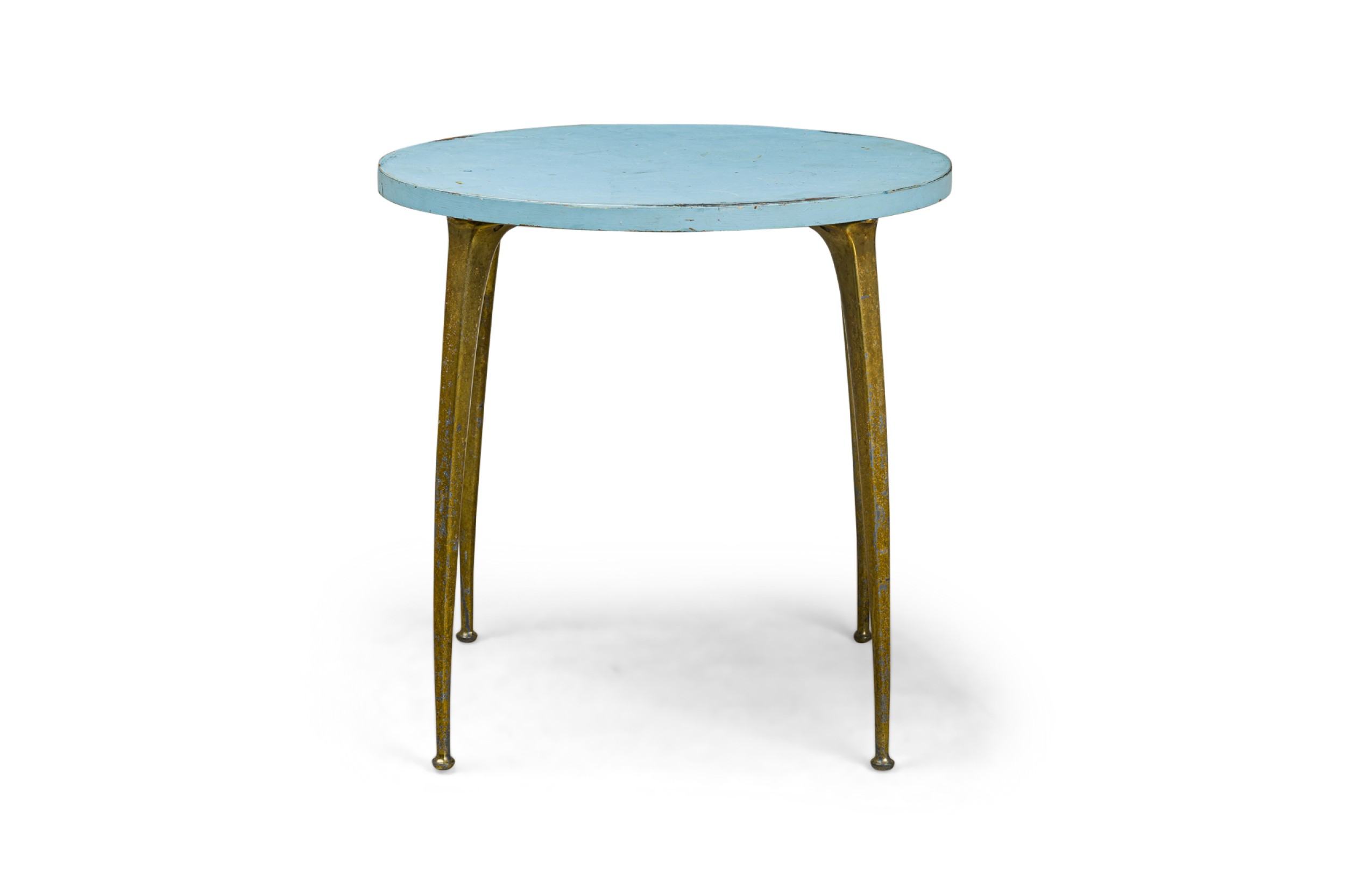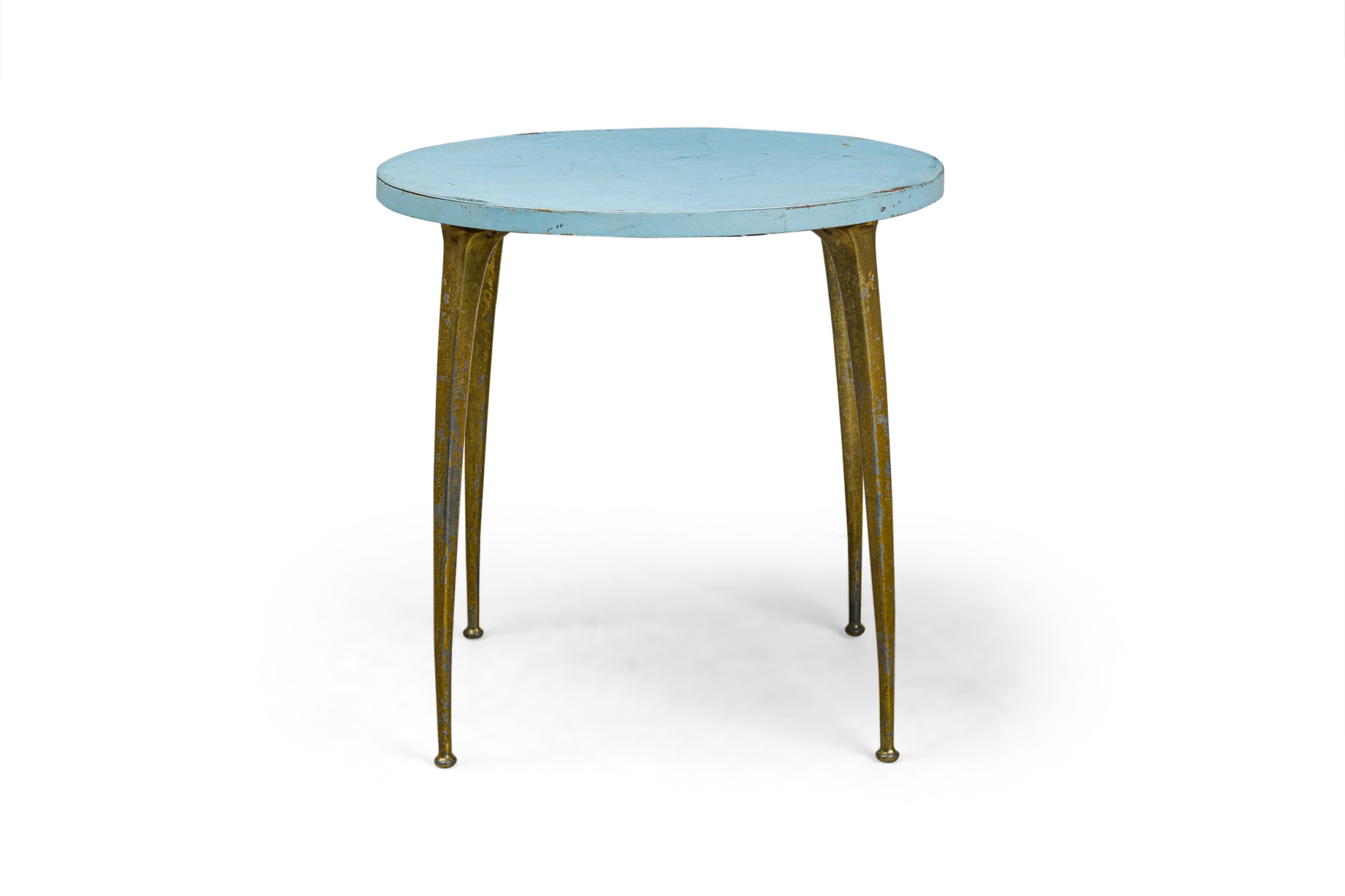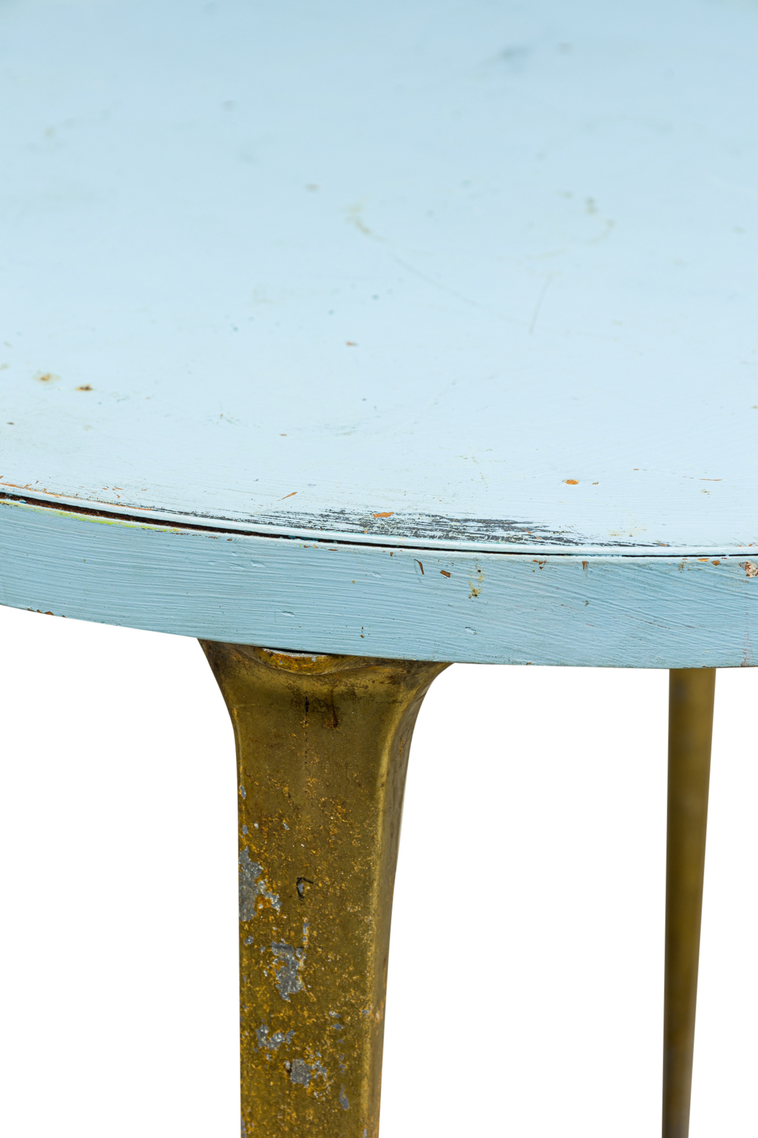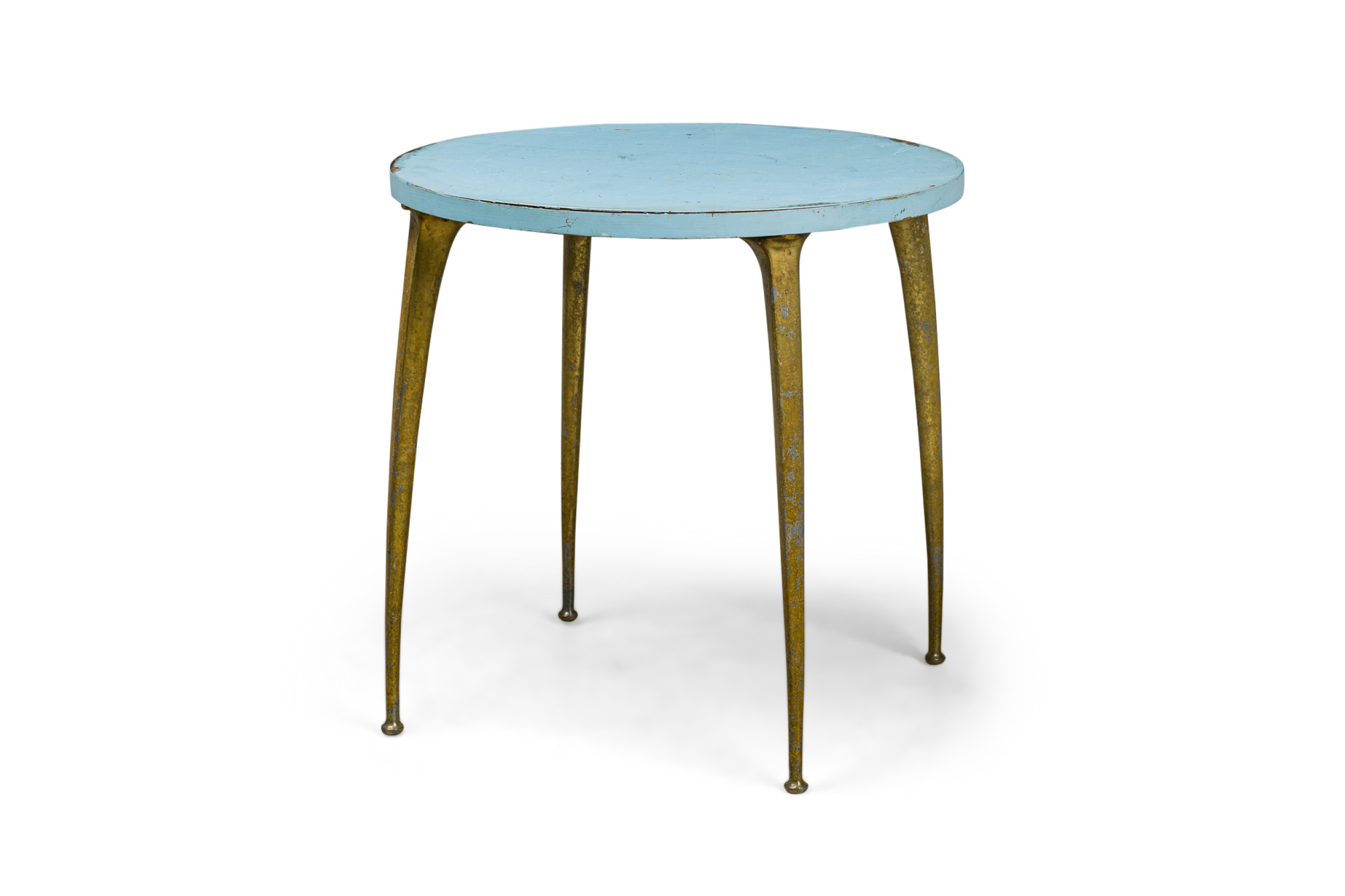 Italian Mid-Century Modern center / breakfast table with a sky blue enameled circular wood top, resting on four sculptural brass legs tapering toward the bottom. (in the style of GIO PONTI).