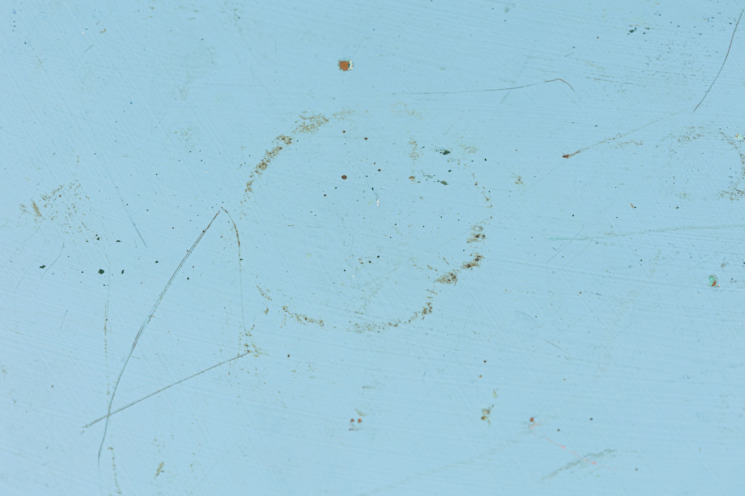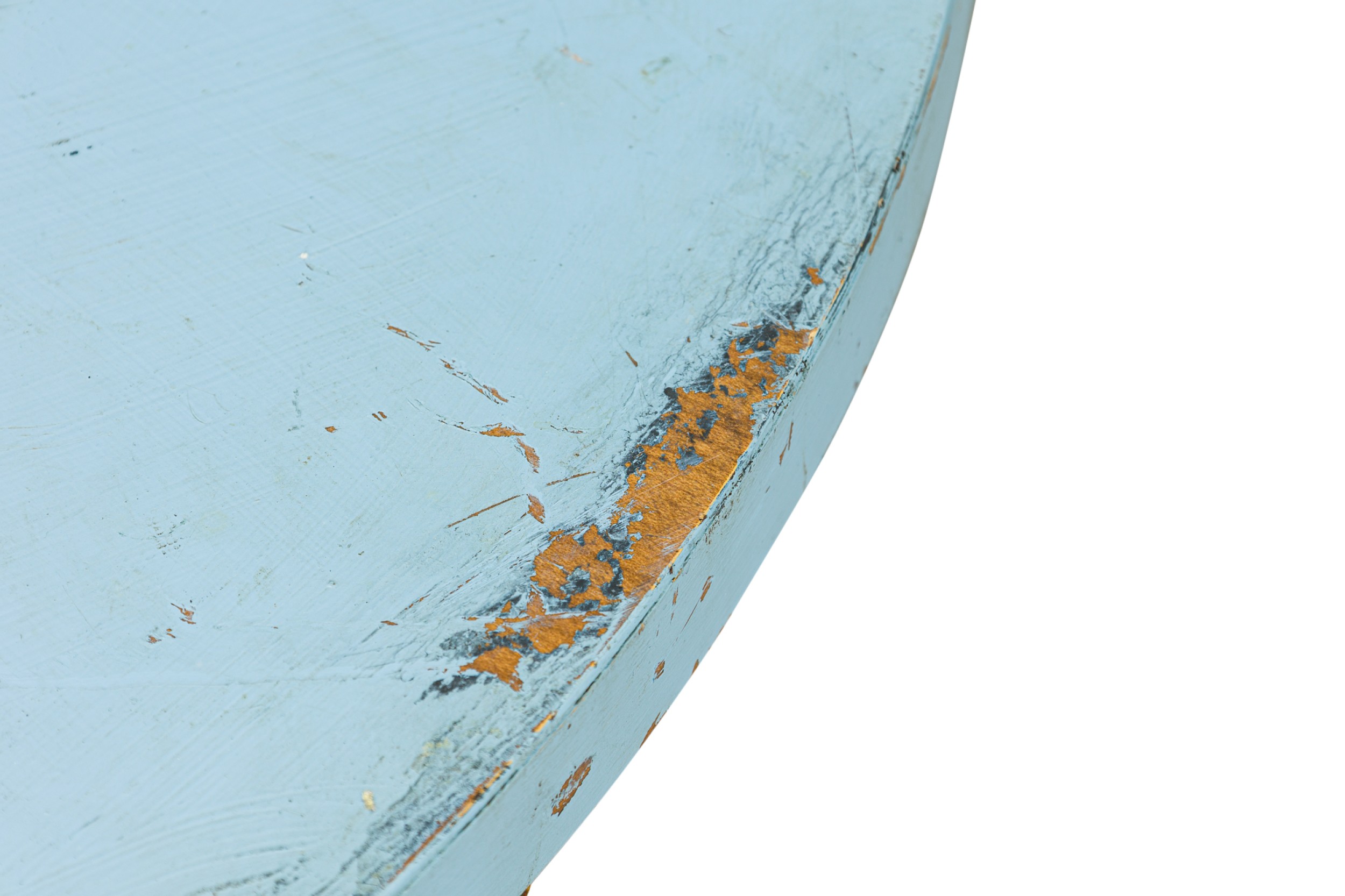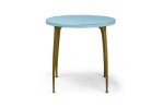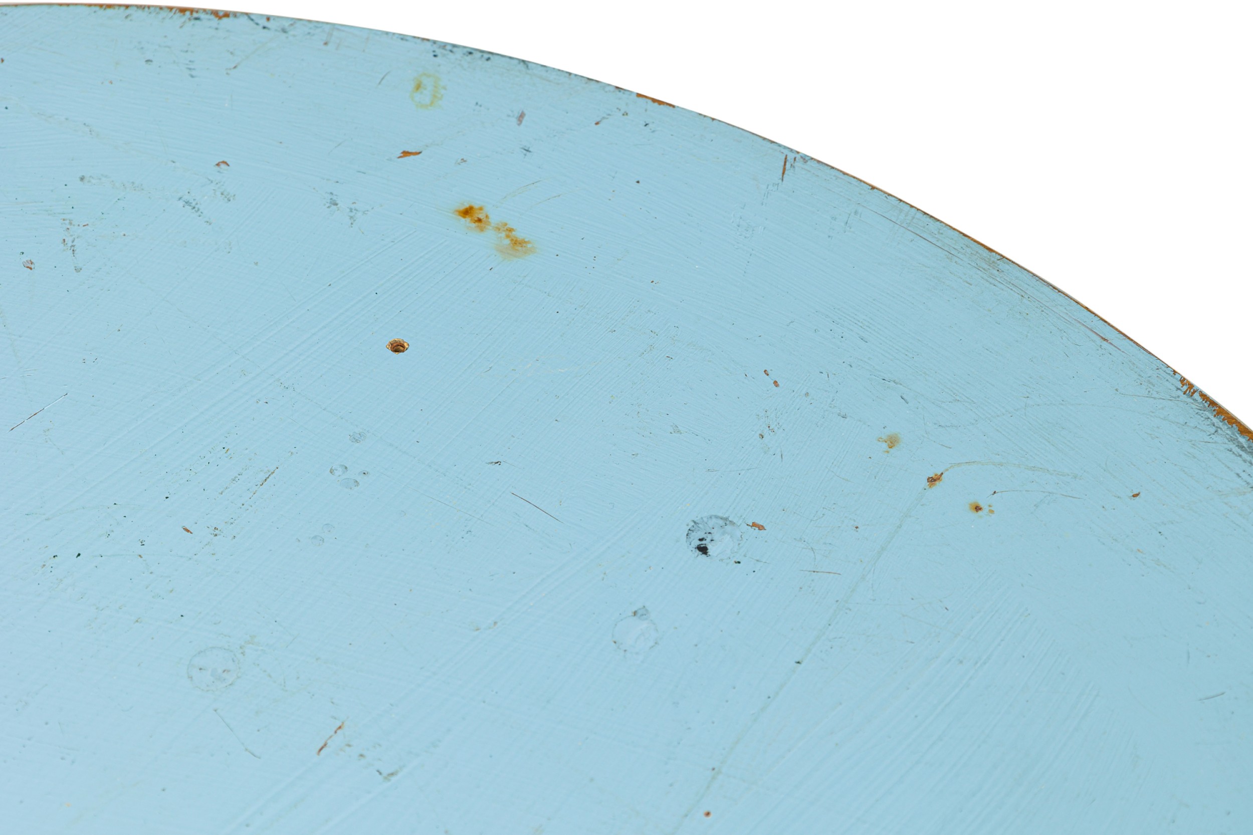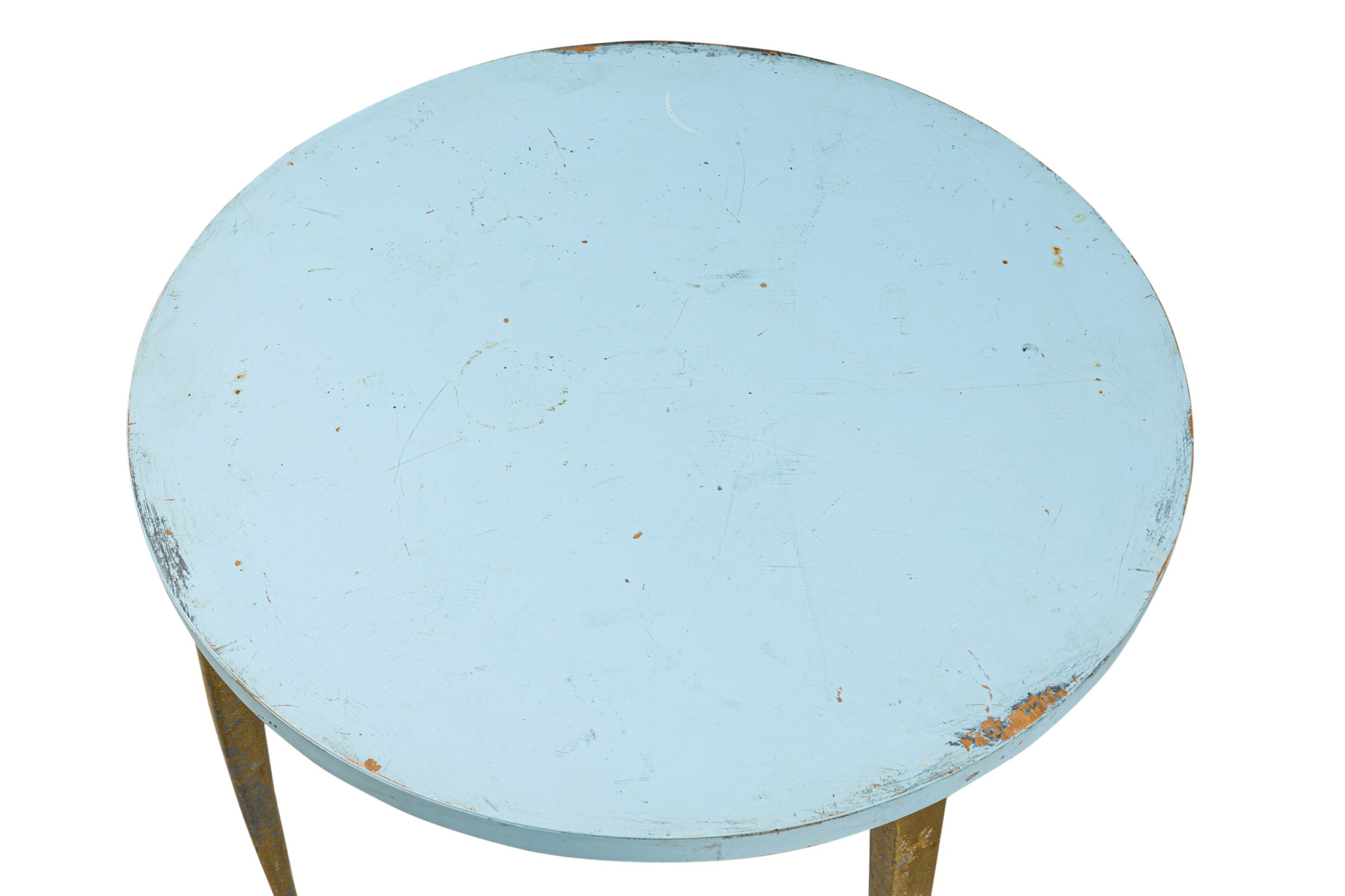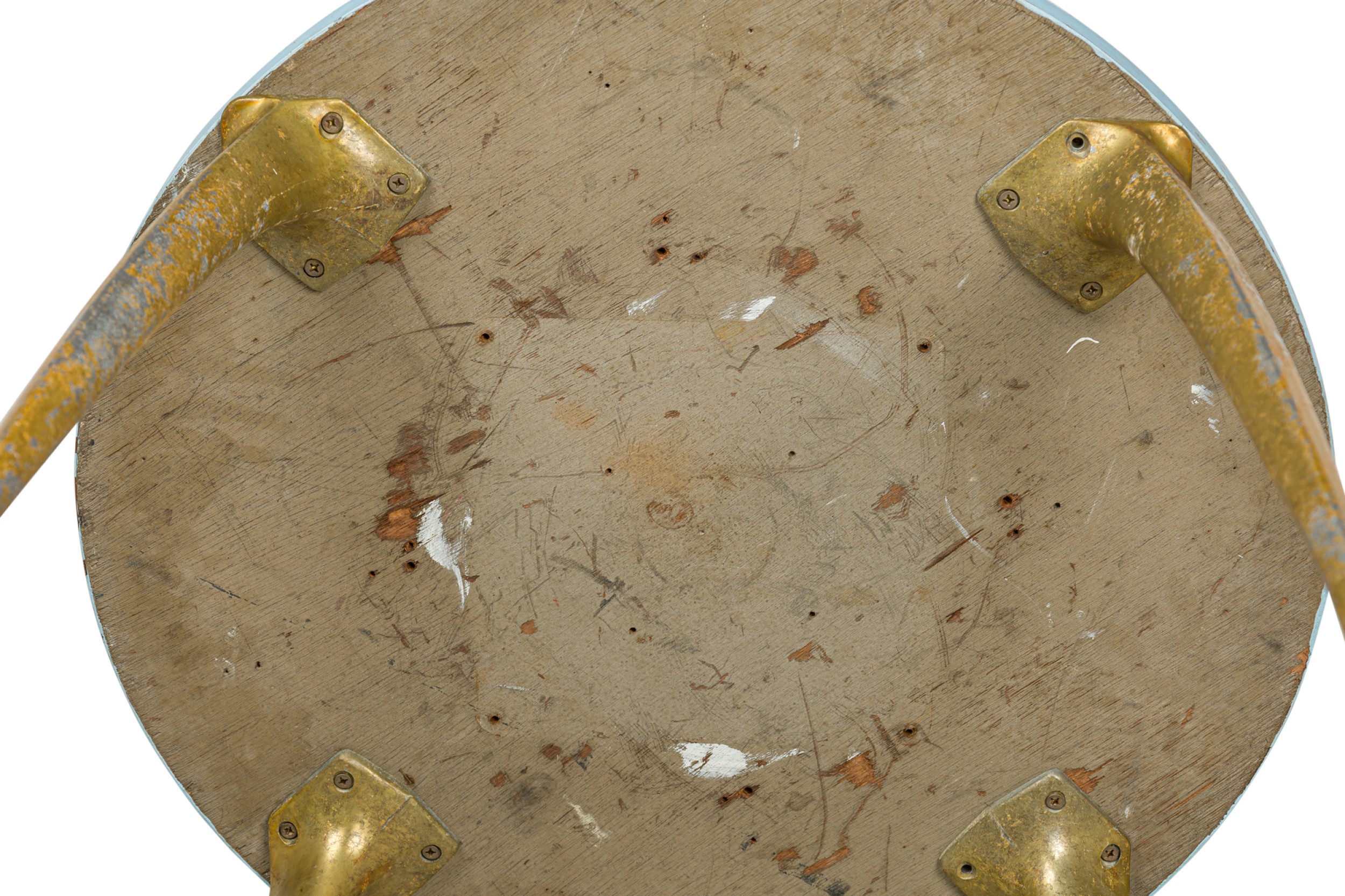 Italian Mid-Century Modern center / breakfast table with a sky blue enameled circular wood top, resting on four sculptural brass legs tapering toward the bottom. (in the style of GIO PONTI).