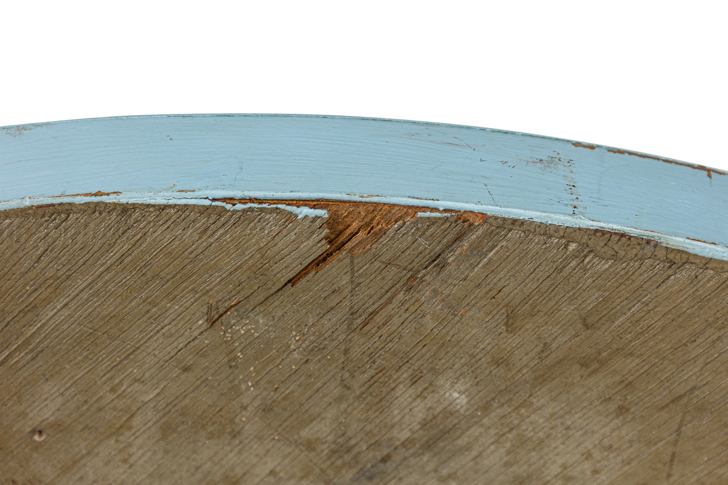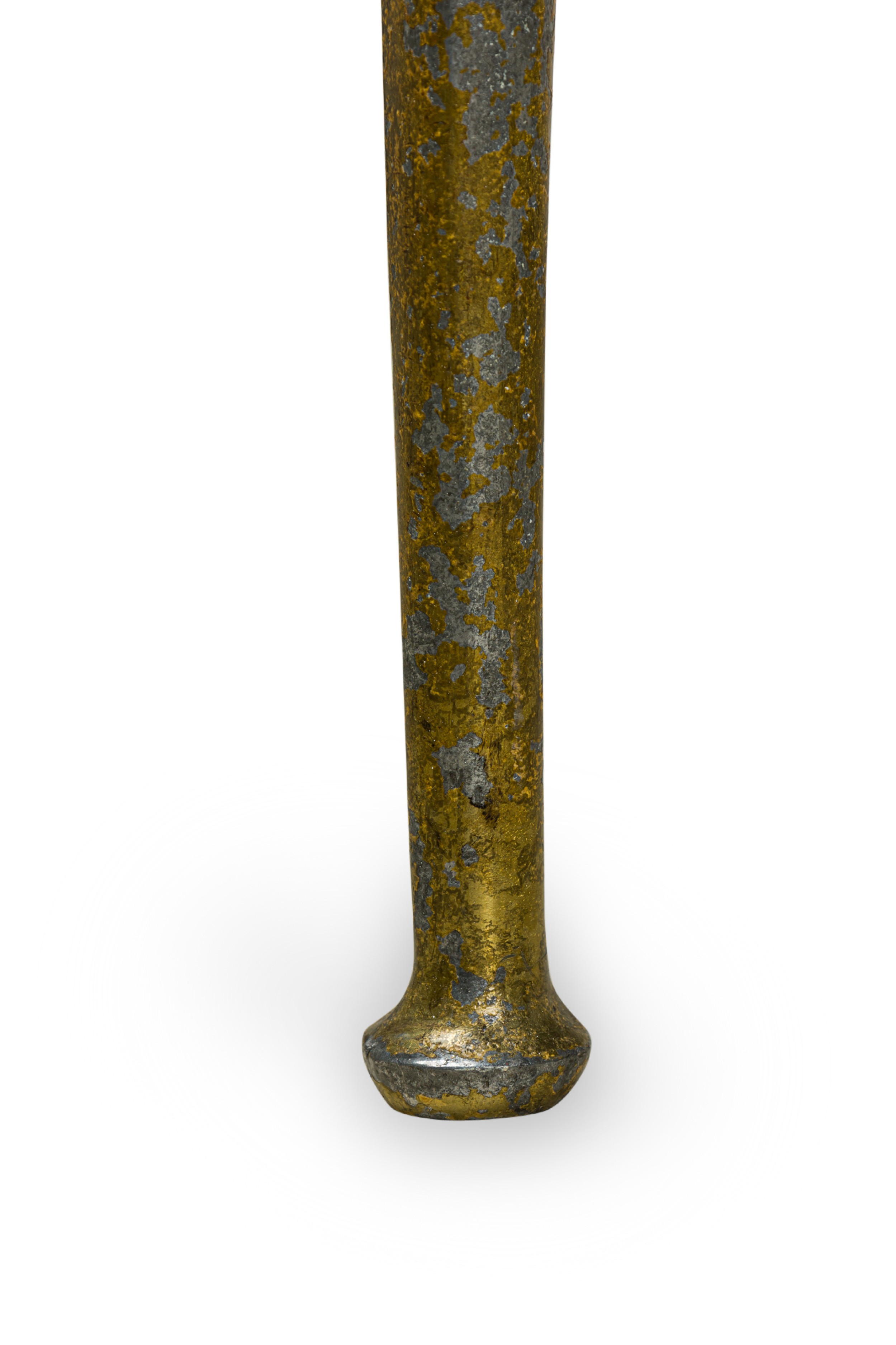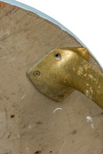 Style: Mid-Century Materials & Techniques: Brass, enamel, metal, painted, wood Category: Tables Condition: Wear to finish. Good; Wear consistent with age and use