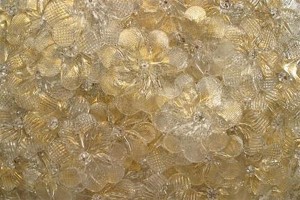 6 Italian Mid-Century-Style (1940's) Murano flush mounted dome shaped ceiling fixtures with gold dusted glass flowers attached to brass (interior) frame (PRICED EACH).