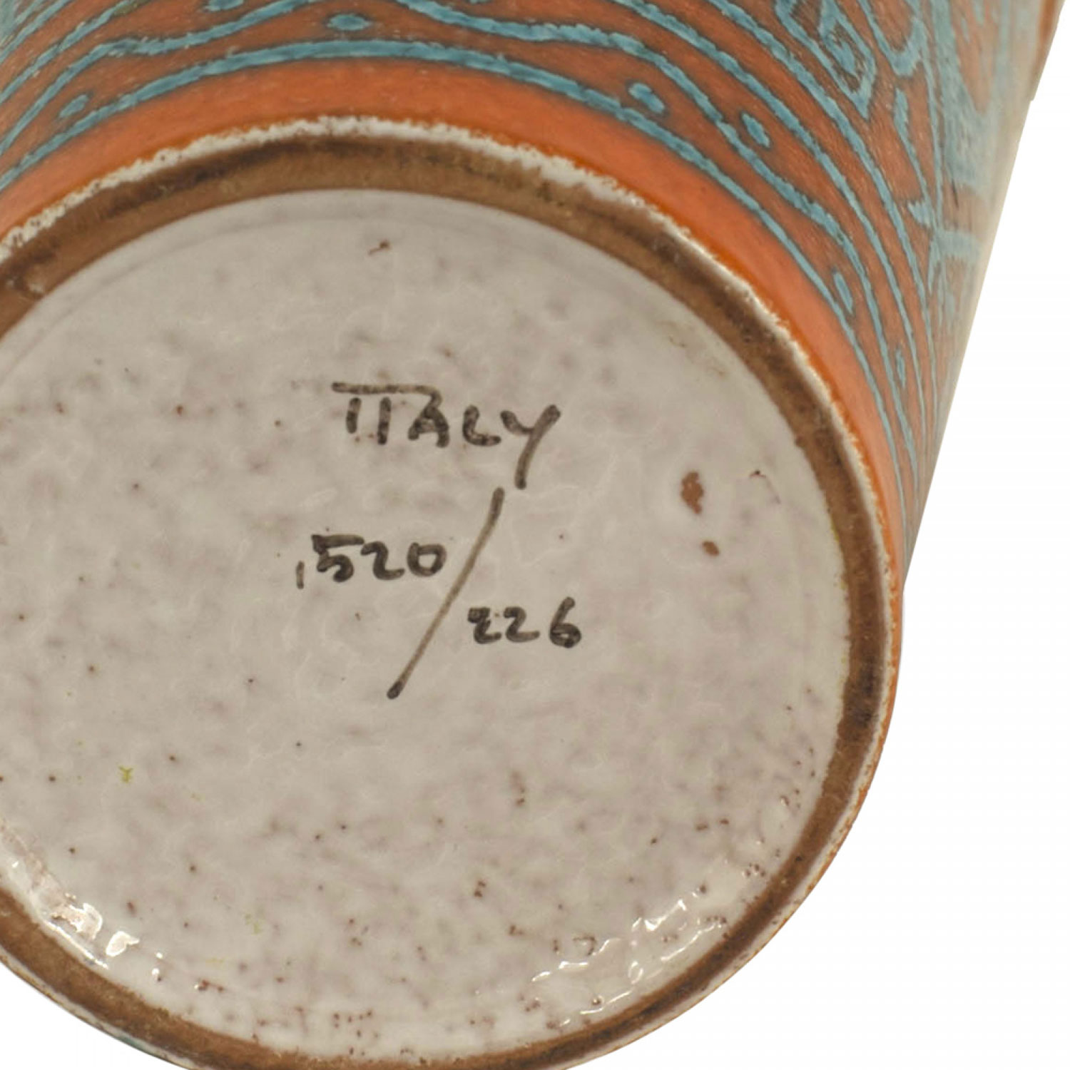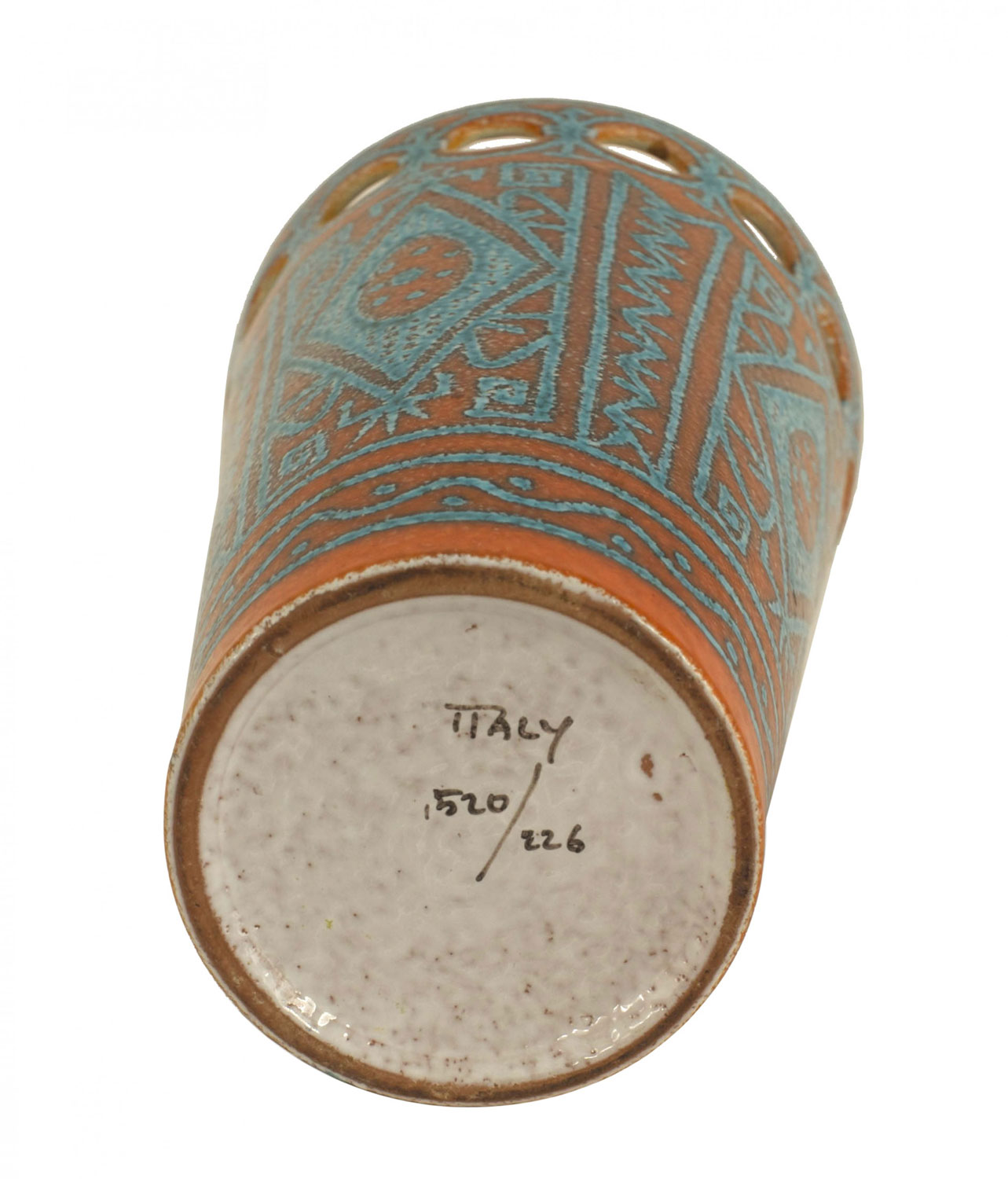 Italian 1960s orange and turquoise conical shaped porcelain vase with geometric pattern and a design of open circles (signed: ITALY 520/226).