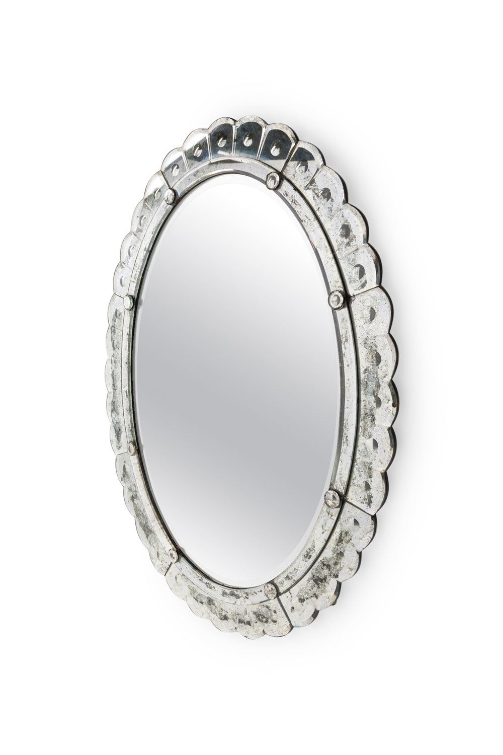 Italian Mid-Century oval shaped beveled mirror with a desilvered scalloped edge frame border.