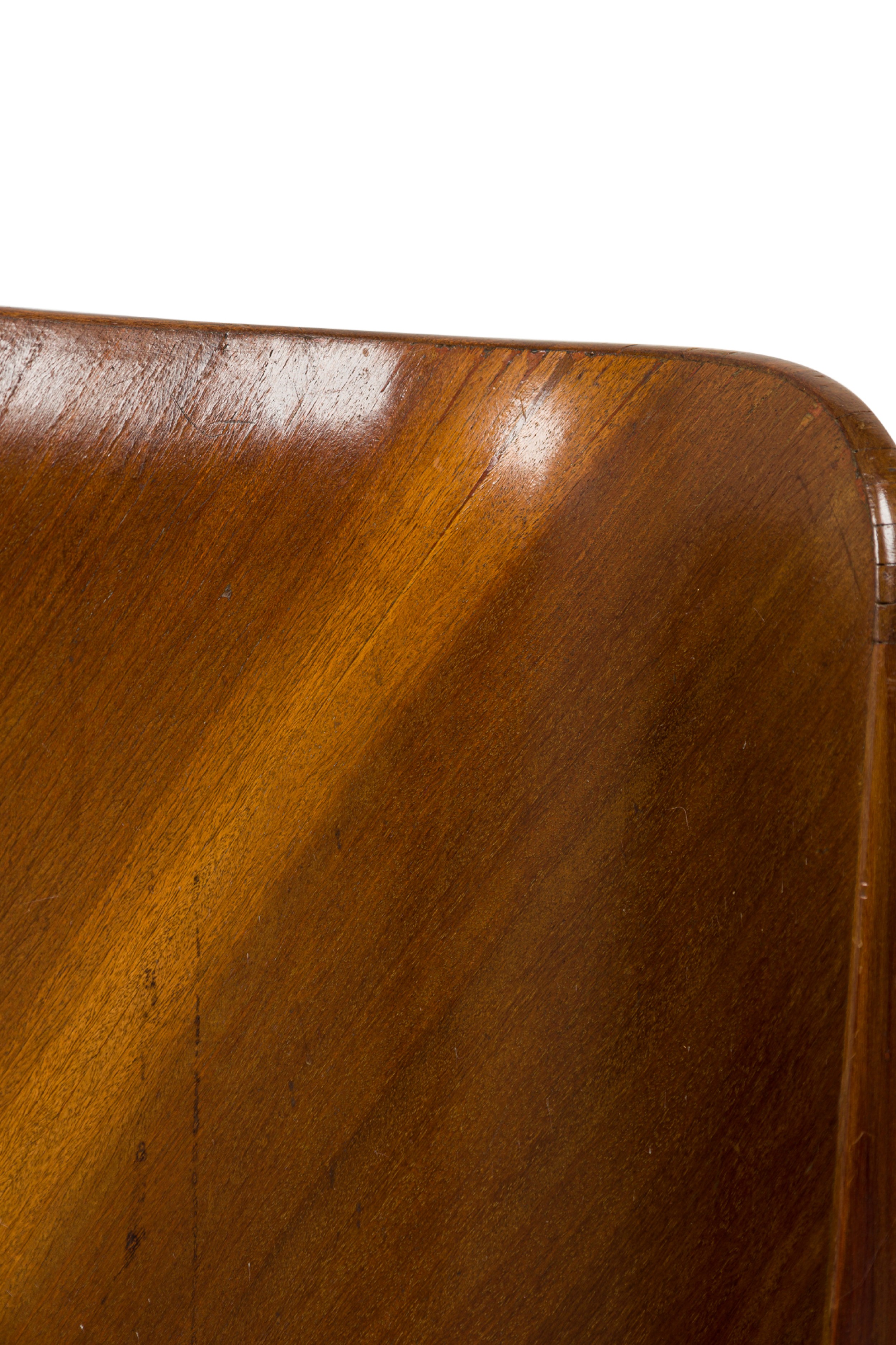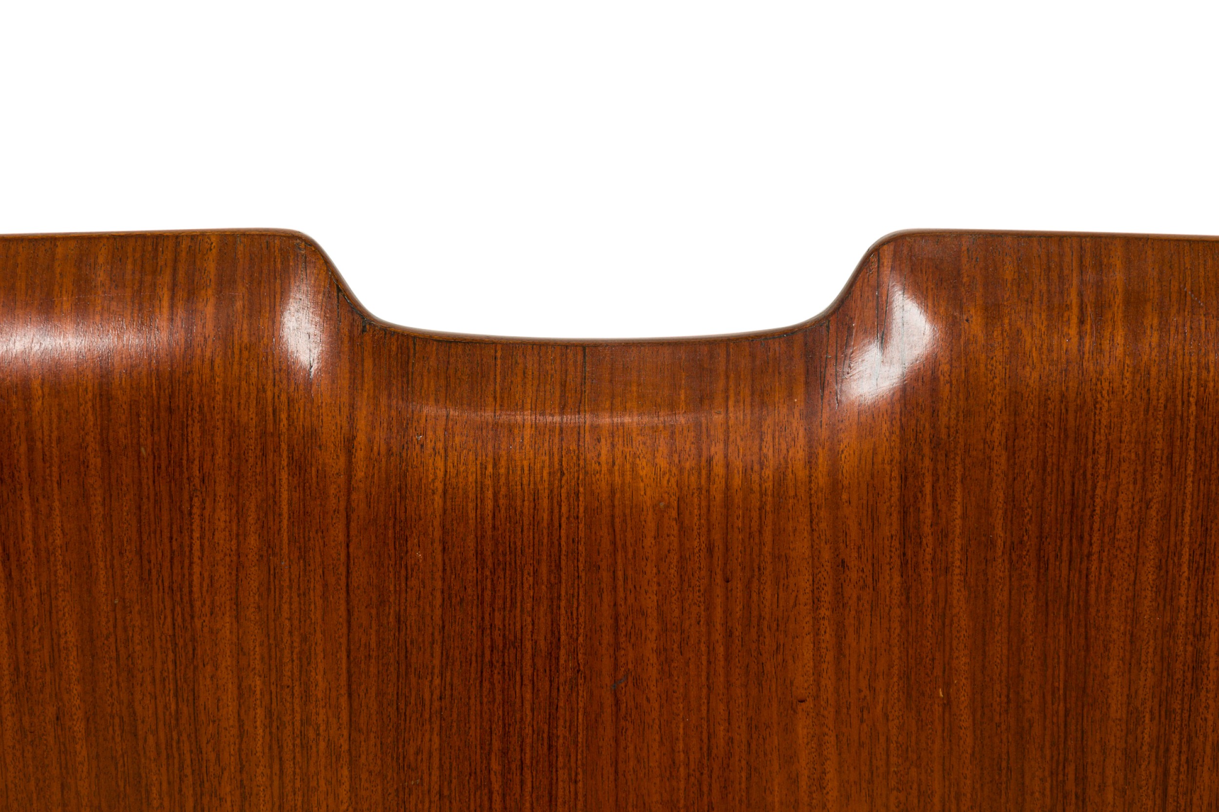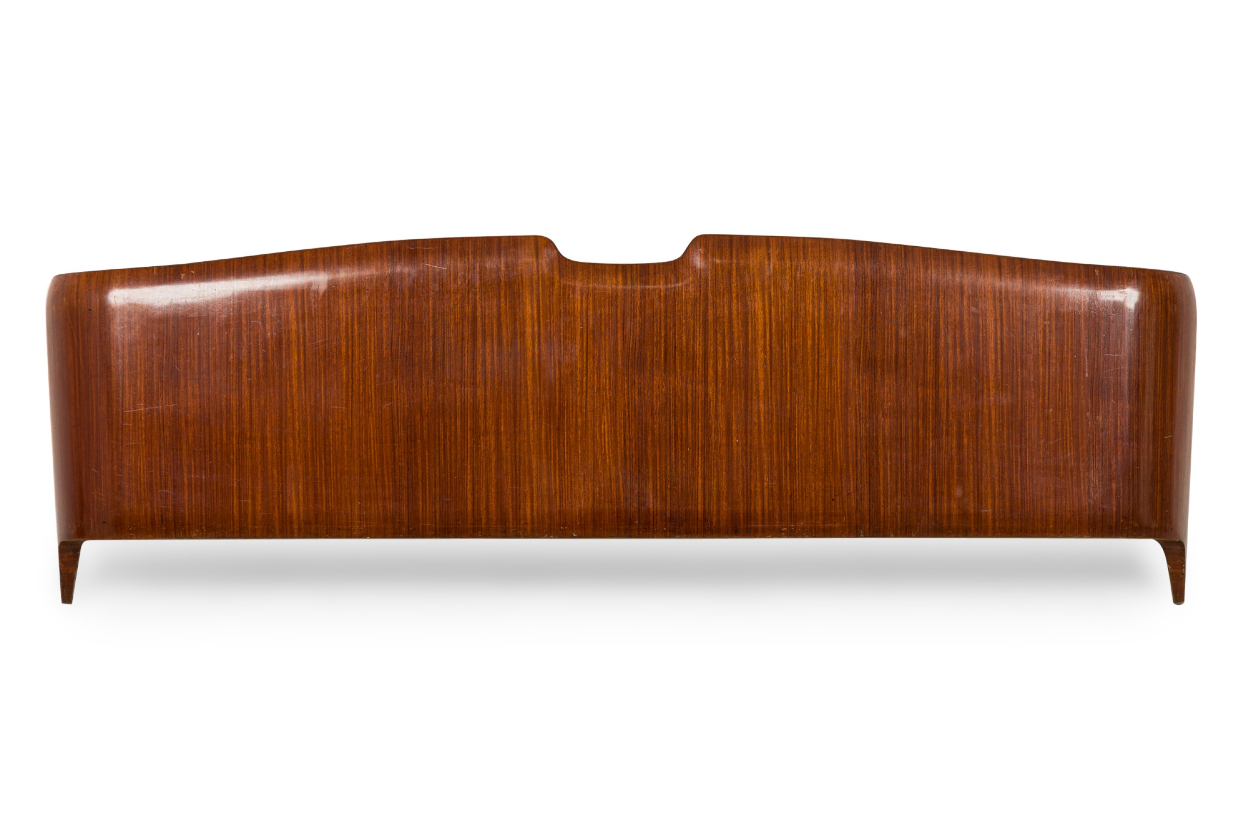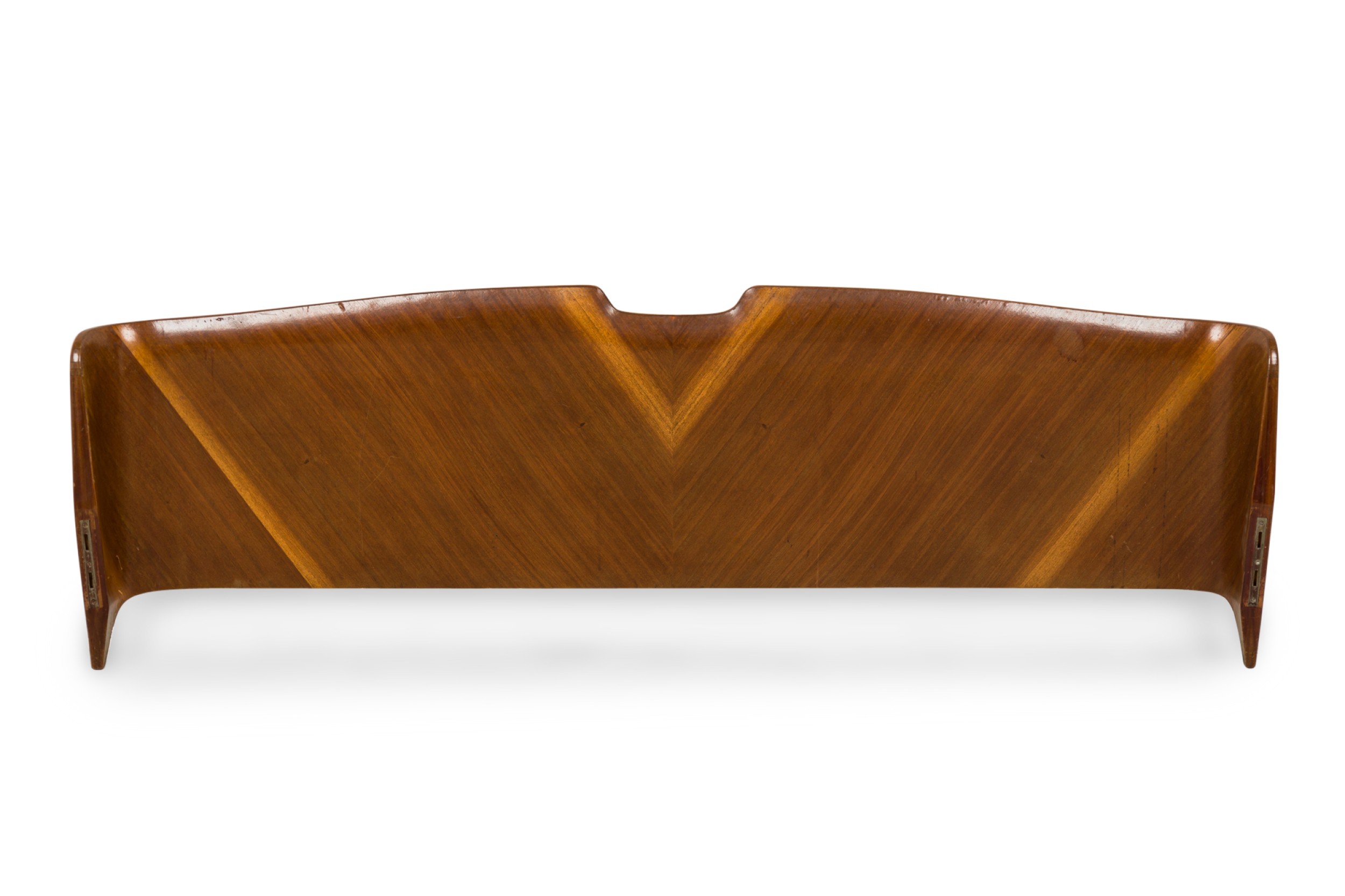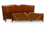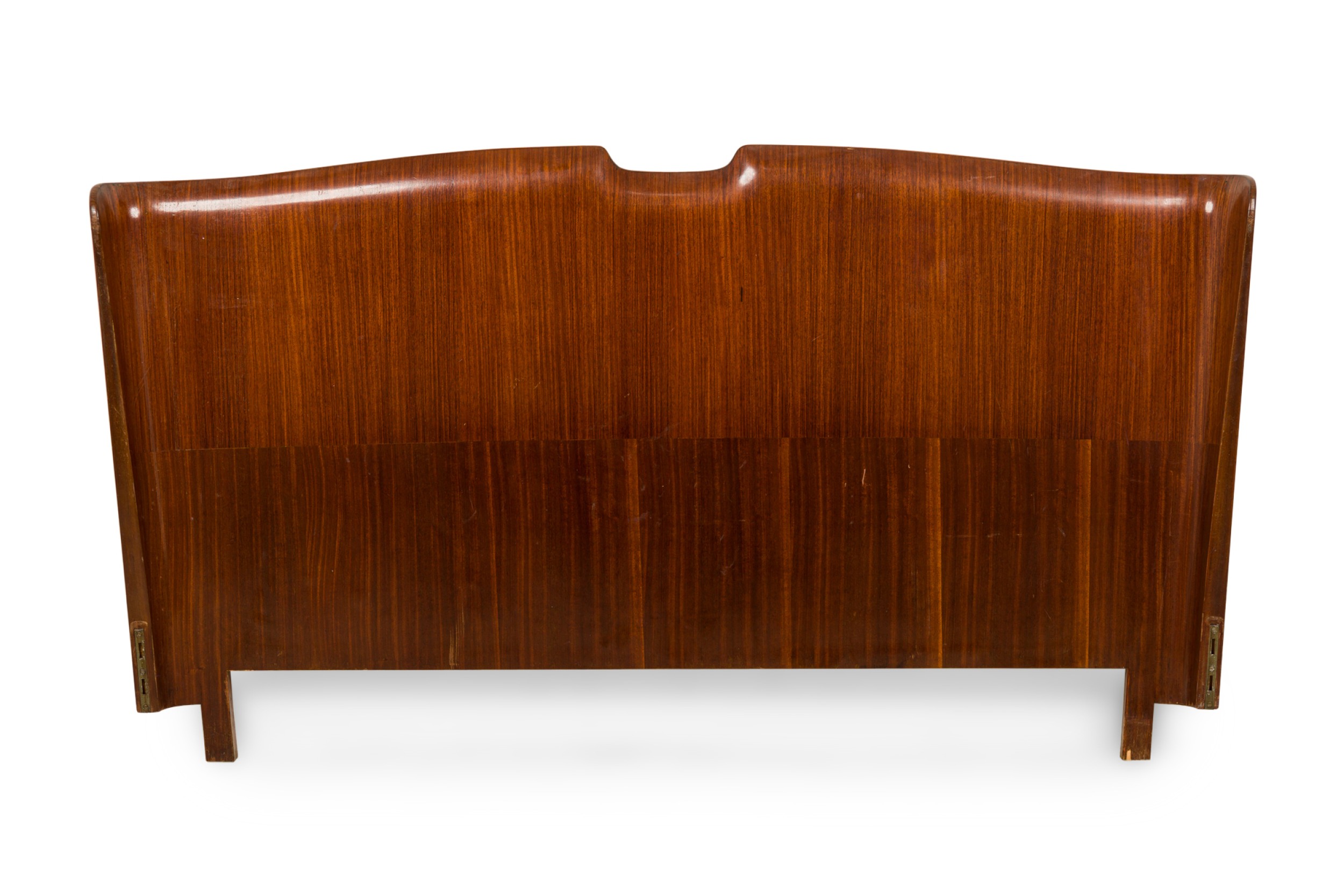 Italian Mid-Century mahogany queen size bed with a shaped top having an indented center on the headboard and footboard with a "V" design veneer (PAOLO BUFFA) (headboard, footboard -19"high, 2 rails) NOTE: could be adapted without rails to California king mattress
