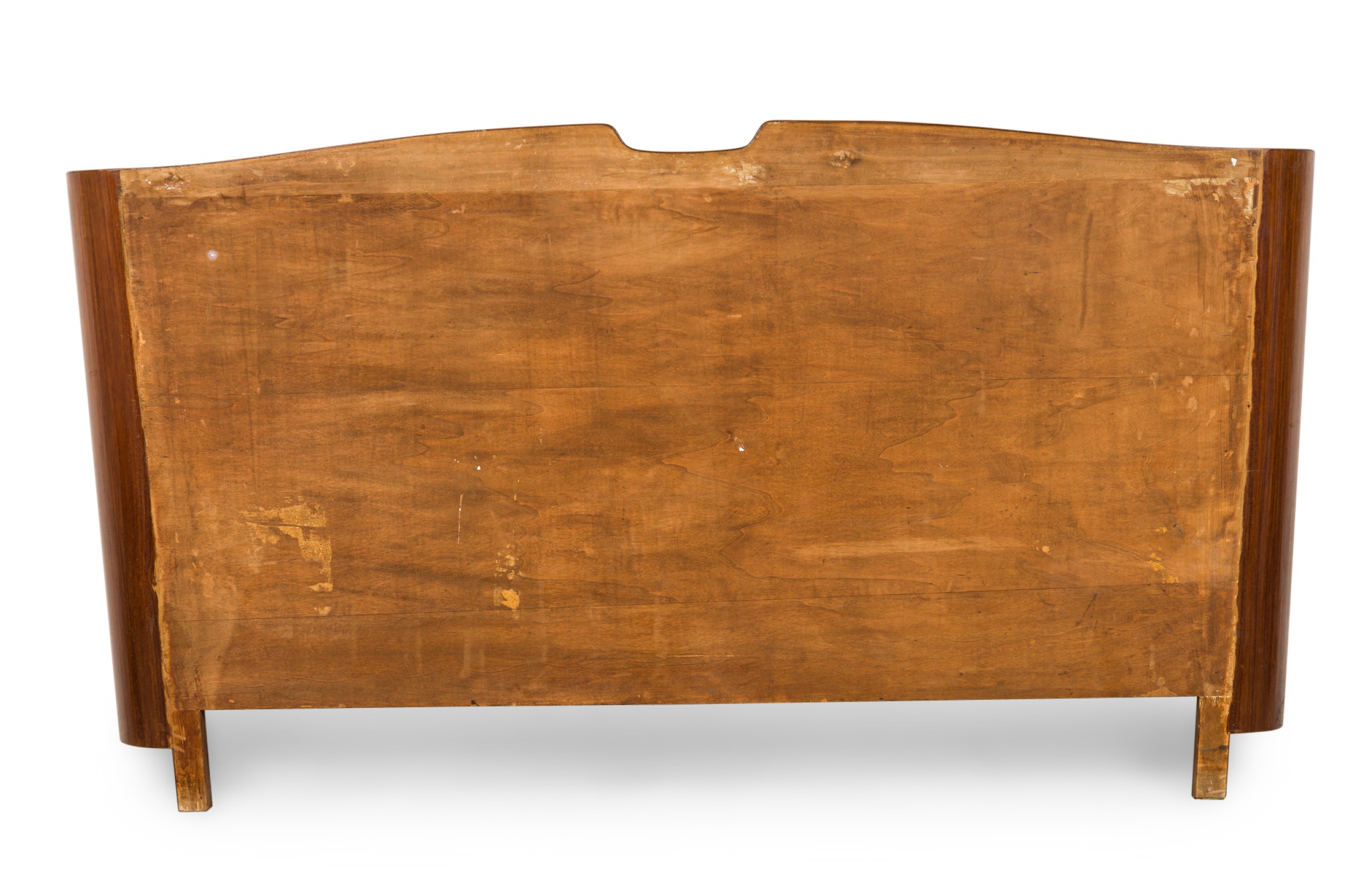 Italian Mid-Century mahogany queen size bed with a shaped top having an indented center on the headboard and footboard with a "V" design veneer (PAOLO BUFFA) (headboard, footboard -19"high, 2 rails) NOTE: could be adapted without rails to California king mattress.