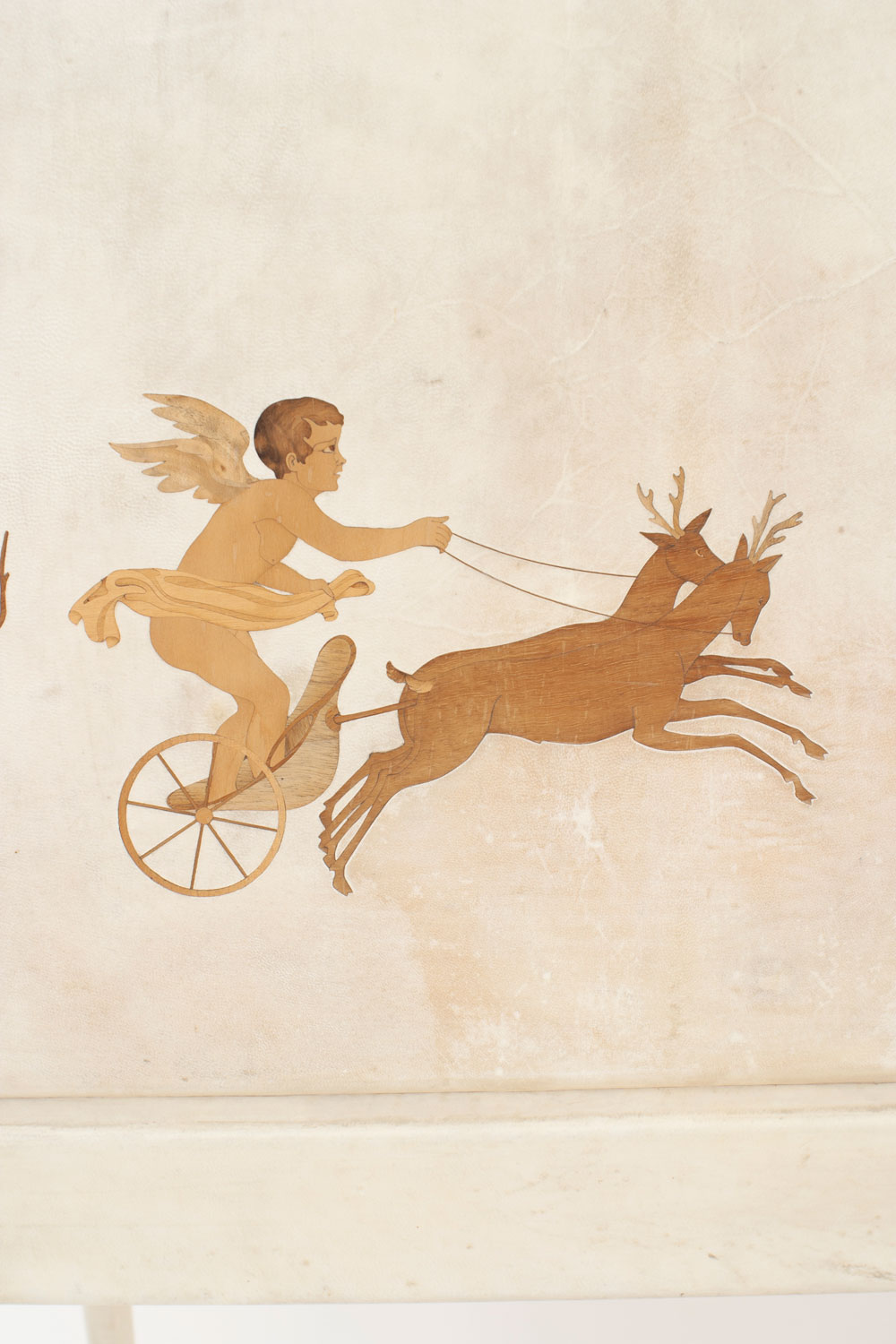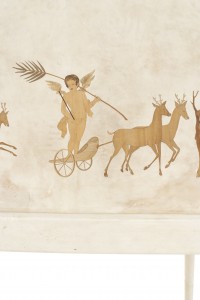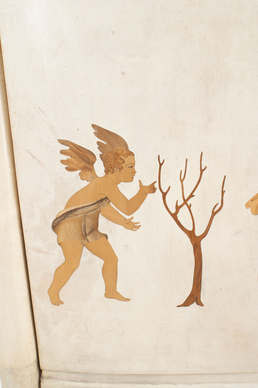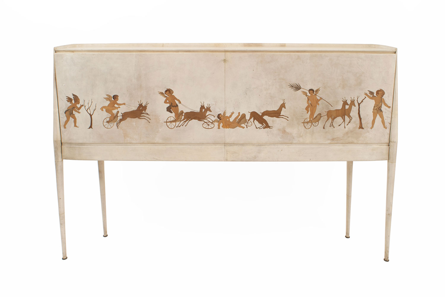 Italian Mid-Century (1930s) sideboard / bar cabinet with parchment veneer & a drop front with wood inlaid cupid figures in chariots & a glass fitted bar interior (labeled: PAOLO BUFFA).