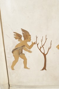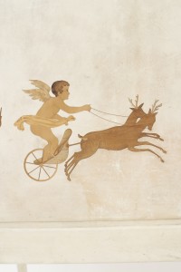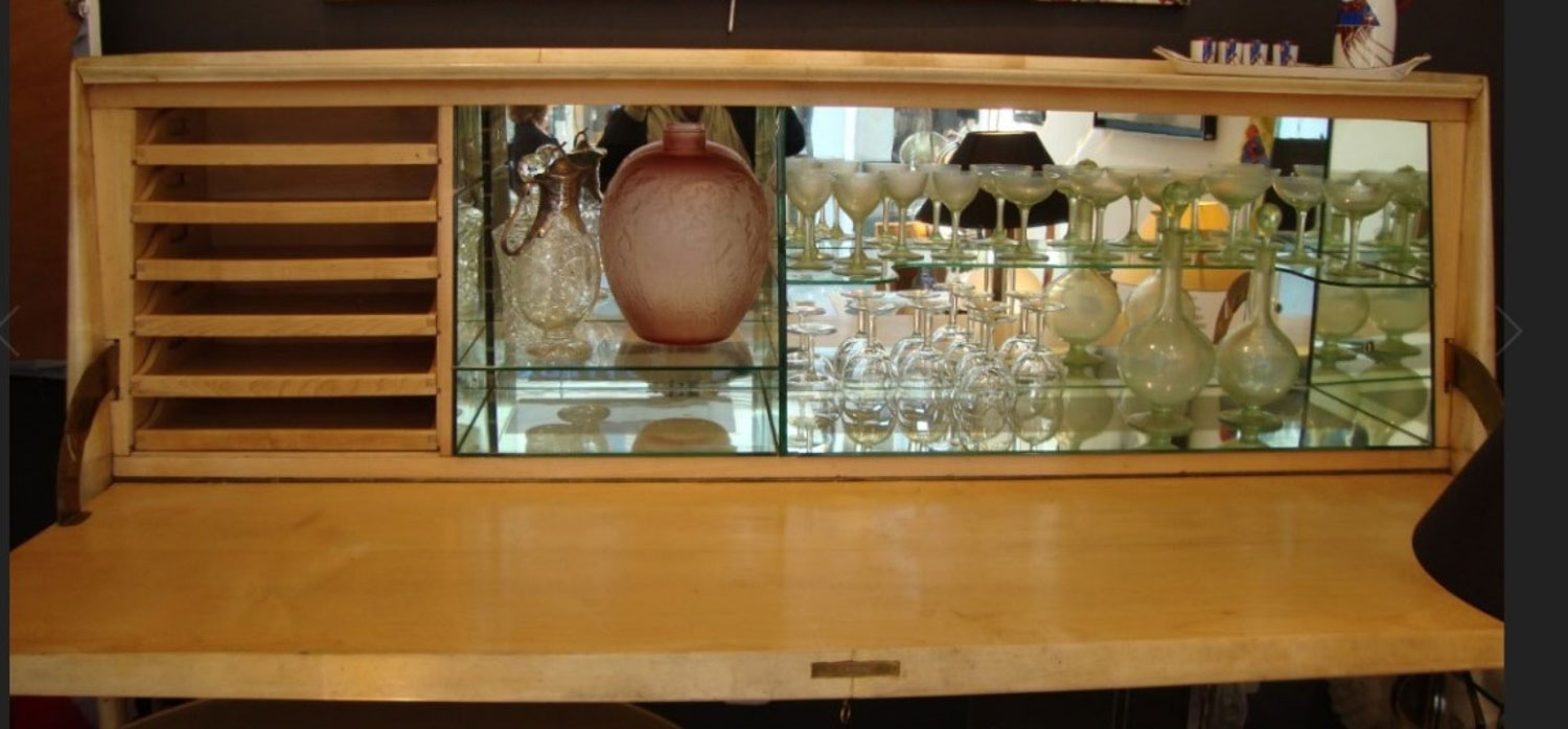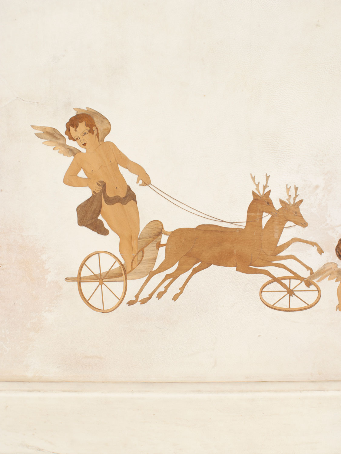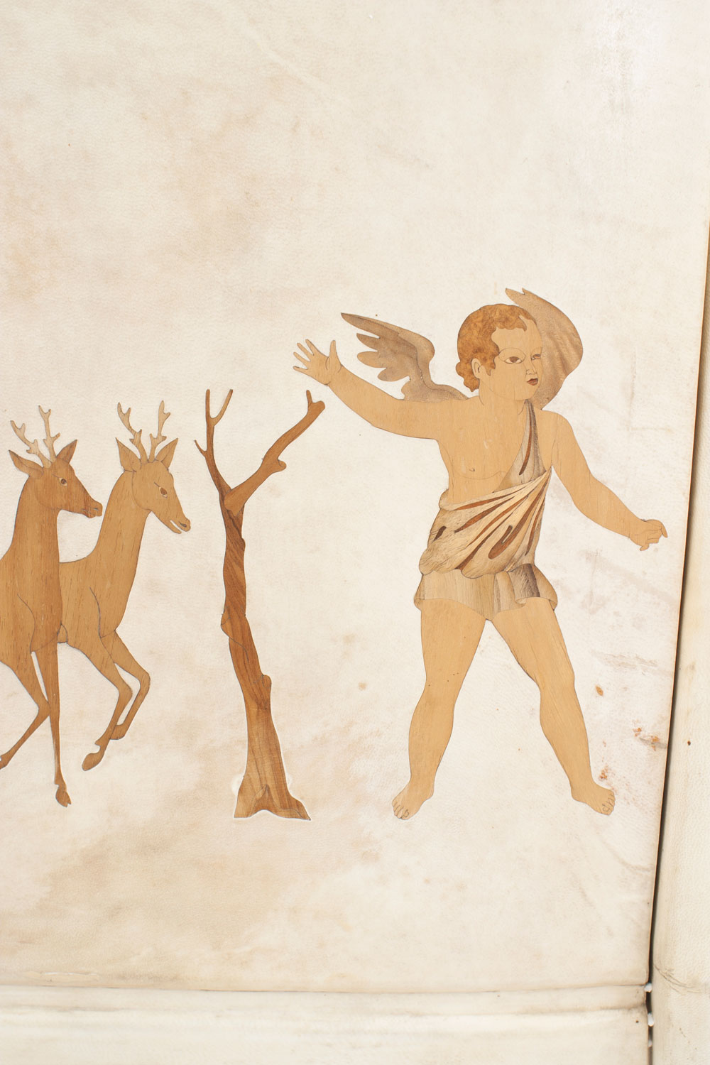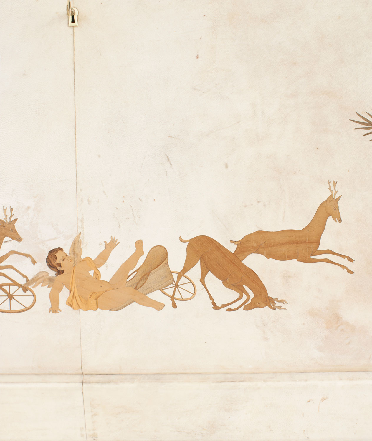 Italian Mid-Century (1930s) sideboard / bar cabinet with parchment veneer & a drop front with wood inlaid cupid figures in chariots & a glass fitted bar interior (labeled: PAOLO BUFFA).